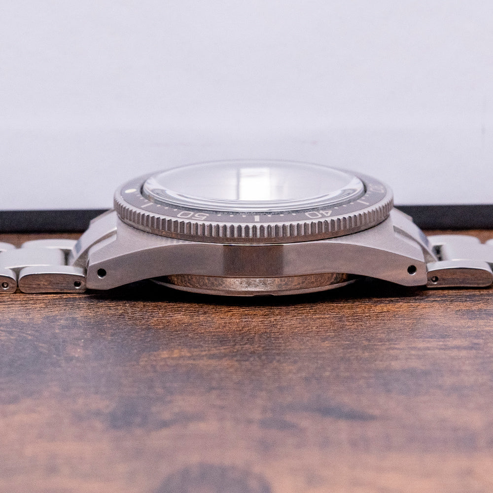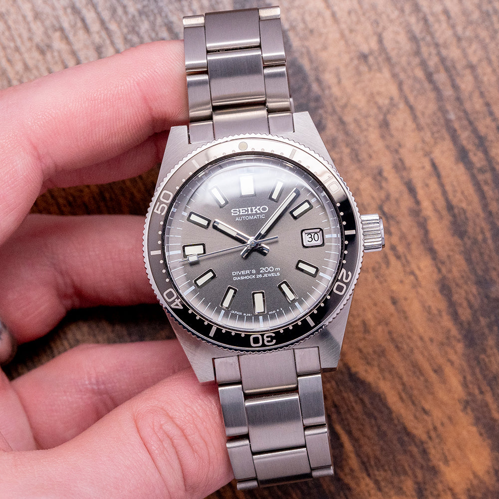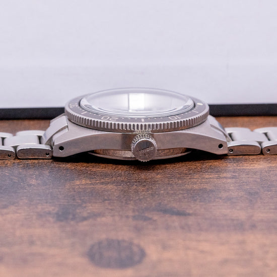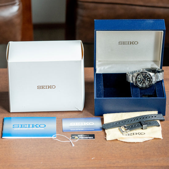 The 2017 Seiko Prospex Diver Limited Edition "62MAS" SLA017 is a faithful modern reinterpretation of their very first professional dive watch, the Seiko 6217-8000/1, nicknamed the 62MAS. Released at the 2017 BaselWorld, it is limited to 1632/2000 pieces, it is made at their Shizuku-ishi Watch Studio in Morioka and overseen by chief designer Nobuhiro Kosugi. The 40mm stainless steel case curves in all the right places, leading to drilled lugs that have a lug-to-lug length of 47.5mm and a thickness of 14mm, giving the watch an impressive wrist presence. The watch is coated in DiaShield, a Seiko proprietary material that gives it resilience to scratches and scuffs. Satin brushed and Zaratsu polished lines transitioned with crisp edges. On the right side is a screw-down crown. The unidirectional bezel has a striking 60-minute black insert coated in a hardened material. A box-shaped sapphire crystal AR coated, resembling the vintage Plexiglass used on the original, sits above the sunburst grey dial. An outer minute track with lume plots surrounding applied 3D embossed batons filled with LumiBrite marks the hours. At 3 o’clock, a framed date window. Broad Arrow and sword hands with LumiBrite infill are complemented by a steel sweeping second hand. At 12 o’clock, we have the Seiko motif “Automatic” printed underneath, and “Divers 200m Diashock 26 Jewels” completes this faithful modern reinterpretation. On the reverse, a screw-down case back with the details around a dolphin, just like the original, is in the centre. Inside an automatic Seiko Cal. 8L35, 26 jewels, 28,800 beats per hour, the movement has hand winding and hacking functionality for your convenience; based on the Grand Seiko calibre 9S55, it is hand-assembled at the Shizuku-Ishi Watch Studio in Morioka. It comes paired with its 19mm Seiko 3-link brushed stainless steel bracelet secured by a signed flip-lock folding clasp, with all links provided, plus a Seiko 19mm silicone strap with the same pyramid texture as the original 62MAS in the box and comes with its Seiko presentation box, swing tag and papers.