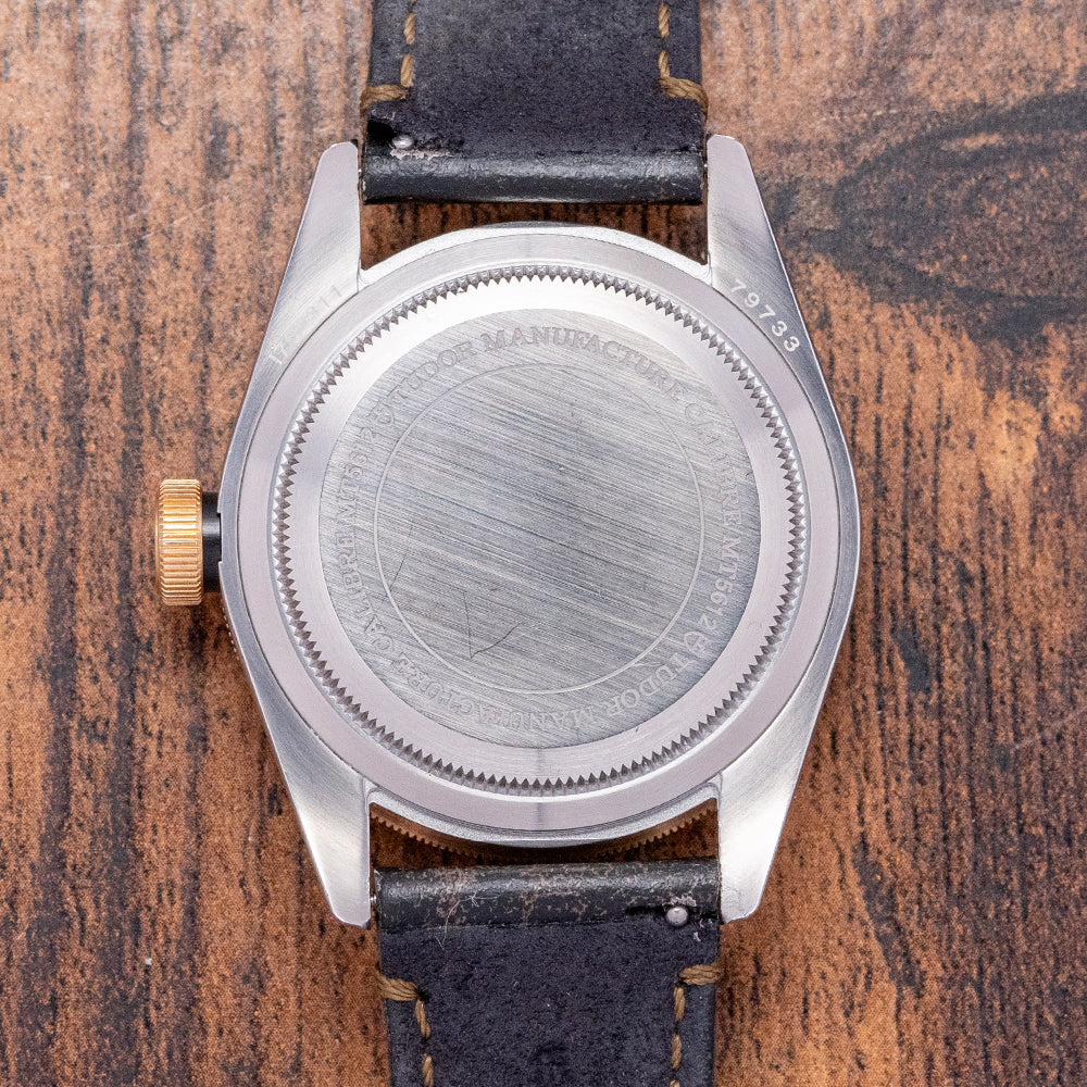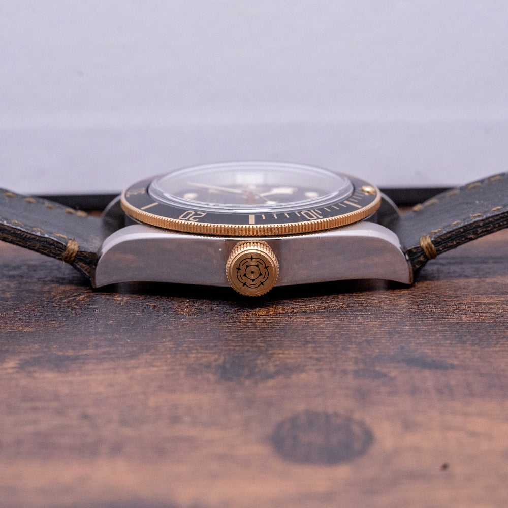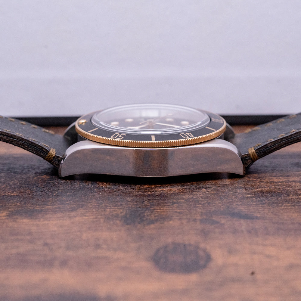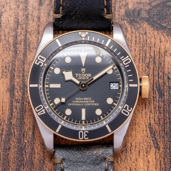 Here we have a 2017 Tudor Black Bay 41mm Steel & Gold on Strap 79733N. A 41mm stainless steel and Yellow Gold case is polished and satin-finished with a lug-to-lug length of 50mm and a case thickness of 14.5mm giving the watch an impressive wrist presence; on the right side is a screw-down signed 0.3mm Yellow Gold cap crown, and a black anodised aluminium tube, a 0.3mm Yellow Gold cap covers the bidirectional stainless steel bezel and has a black anodised aluminium dive insert with gold numerals and markings, holding a domed sapphire crystal above a matte black dial, a gold outer minute track surrounds applied disc and baton indexes mark the hours, at 3 o’clock a date window, Yellow Gold outlined Snowflake hands filled with Super-LumiNova are complimented with a Snowflake sweeping second hand. On the reverse, a screw-down coin-edged case back, inside we have the automatic Tudor Cal. MT5612, in-house COSC Certified 26 jewels, 28,800 beats per hour with hacking seconds, silicon balance spring and a bi-directional rotor. The watch comes paired with its original worn 22mm Tudor leather strap and an additional 22mm strap in the box and the watch also comes with its original Tudor presentation box and papers.