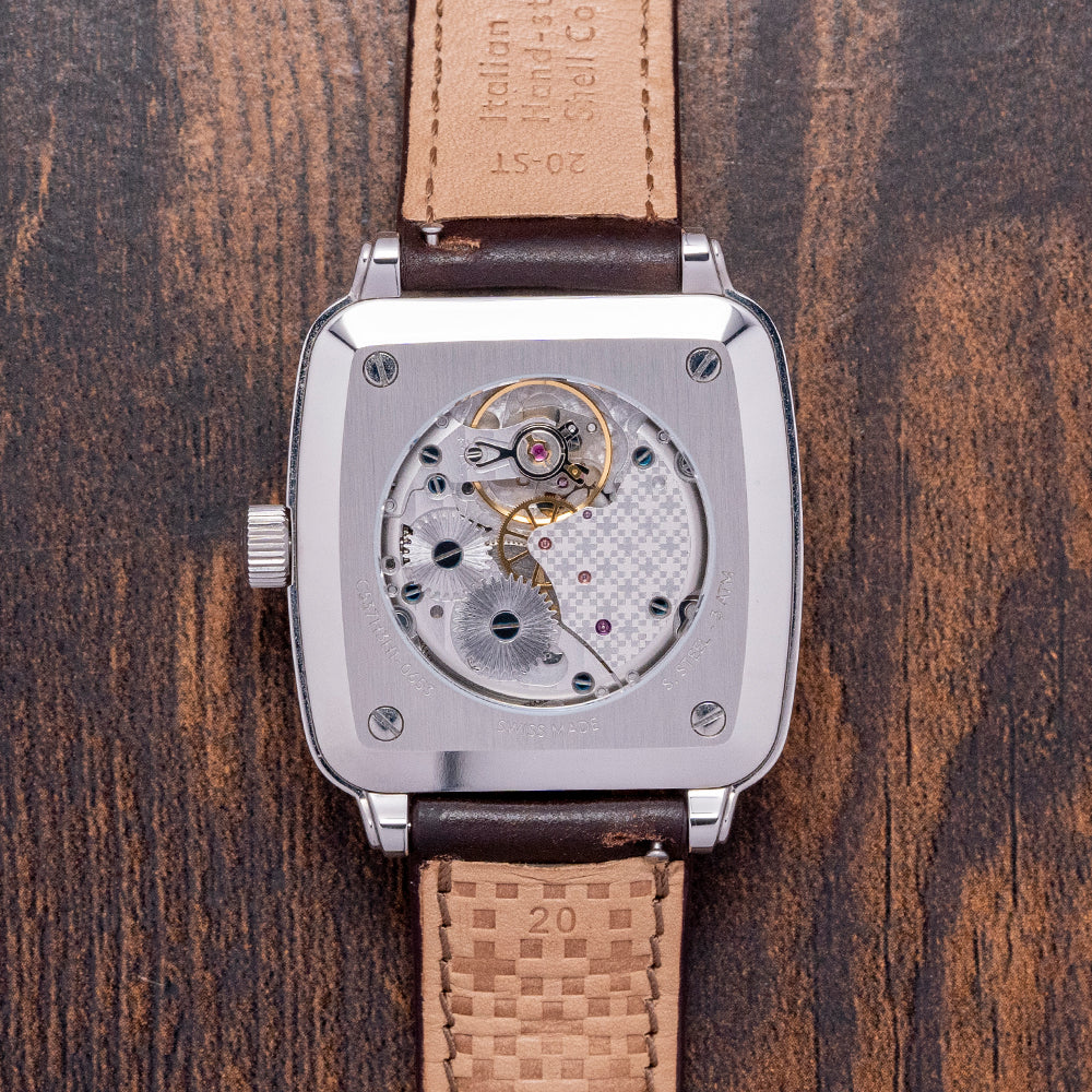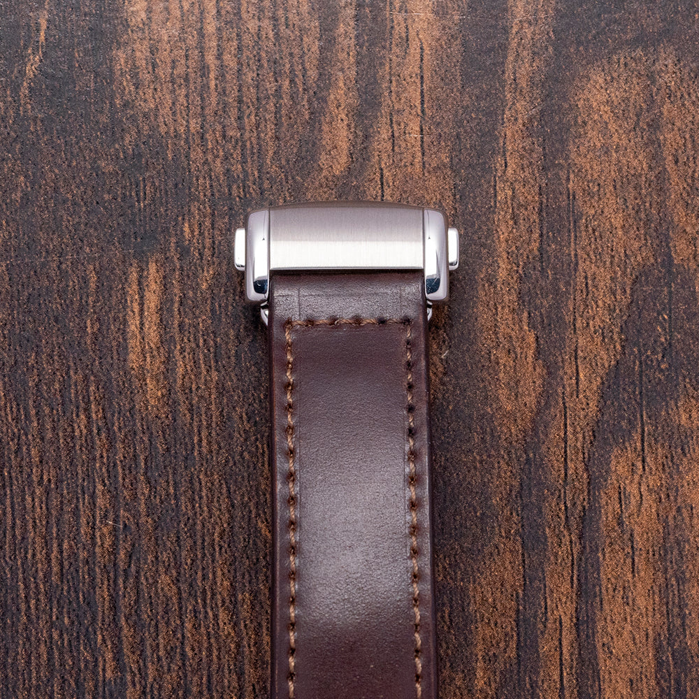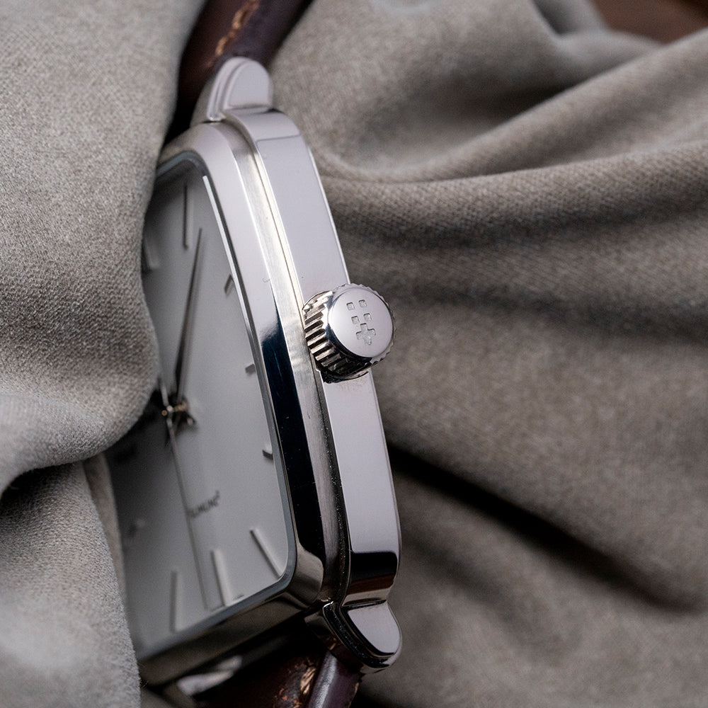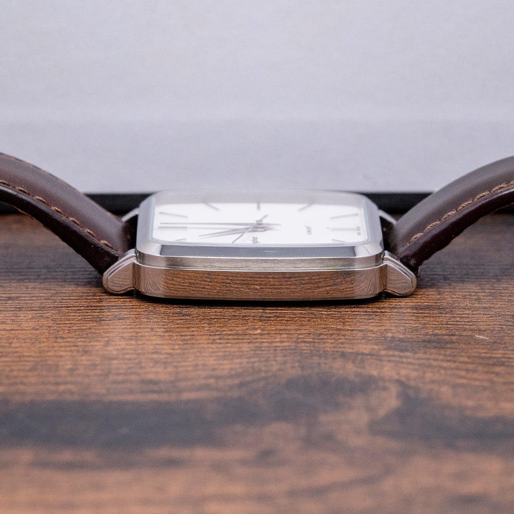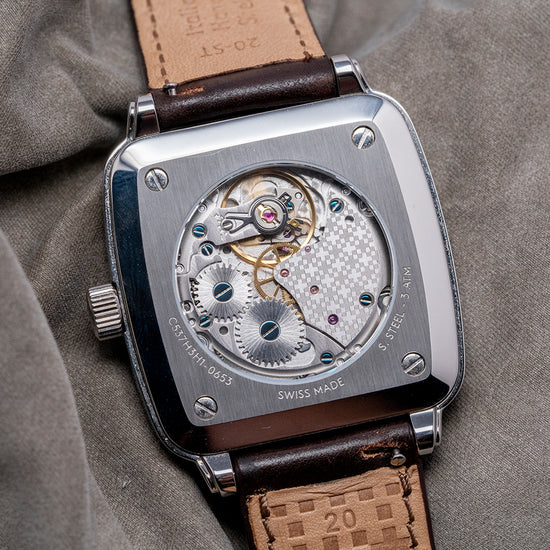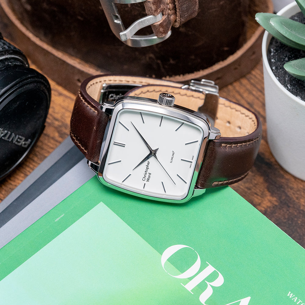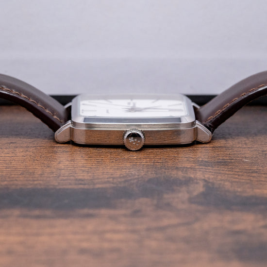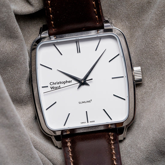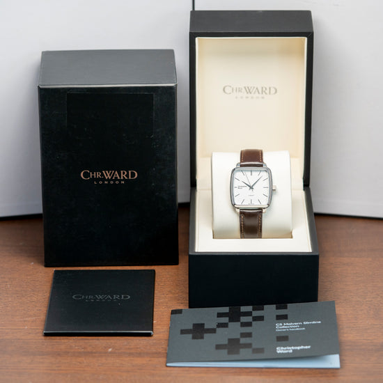 Here we have a 2018 Christopher Ward C5 Malvern Slimline Auto, featuring a polished and brushed 37mm Square case that comfortably sits on your wrist, thanks to its short, rounded, stepped lugs. Its brushed and polished flanks lead to a lug-to-lug length of 44.5mm and a case thickness of just 8mm. On the right side, a coin-edged push/pull signed crown. A polished, smooth bezel encloses a sapphire crystal, AR-coated on the inside, above a striking sunburst blue dial. Slim, applied steel bezel indexes mark the hours, while facet-edged, diamond-polished nickel hands are complemented by a tapered, sweeping second hand. At 9 o’clock, the Christopher Ward motif is featured, and at 6 o’clock, the ‘Slimline²’ completes this sophisticated dress watch. On the reverse, a screwed-down exhibition case back is engraved with the details of the watch around its edge, featuring a Manually Wound ETA 7001 movement with 17 jewels and a beat rate of 21,600 beats per hour. This workhorse, ultra-slim 2.5mm movement has been in production since 1971. It comes paired with its 20mm Christopher Ward leather strap and signed folding buckle. This watch is sold with its Christopher Ward box and paperwork.