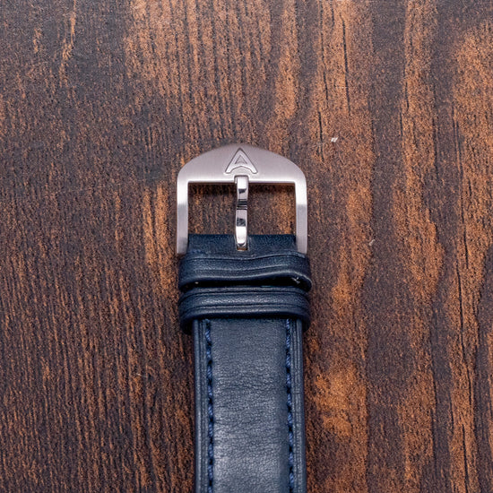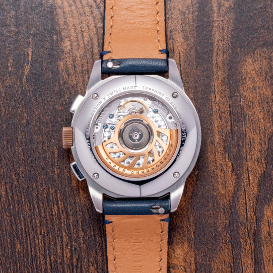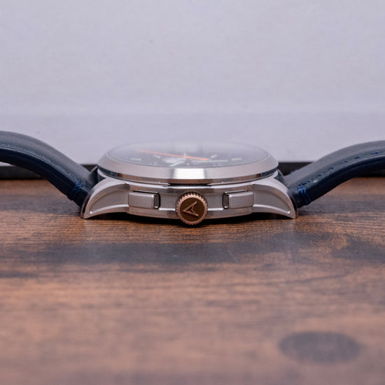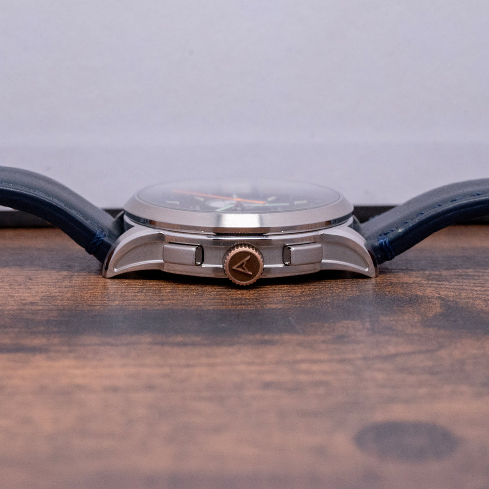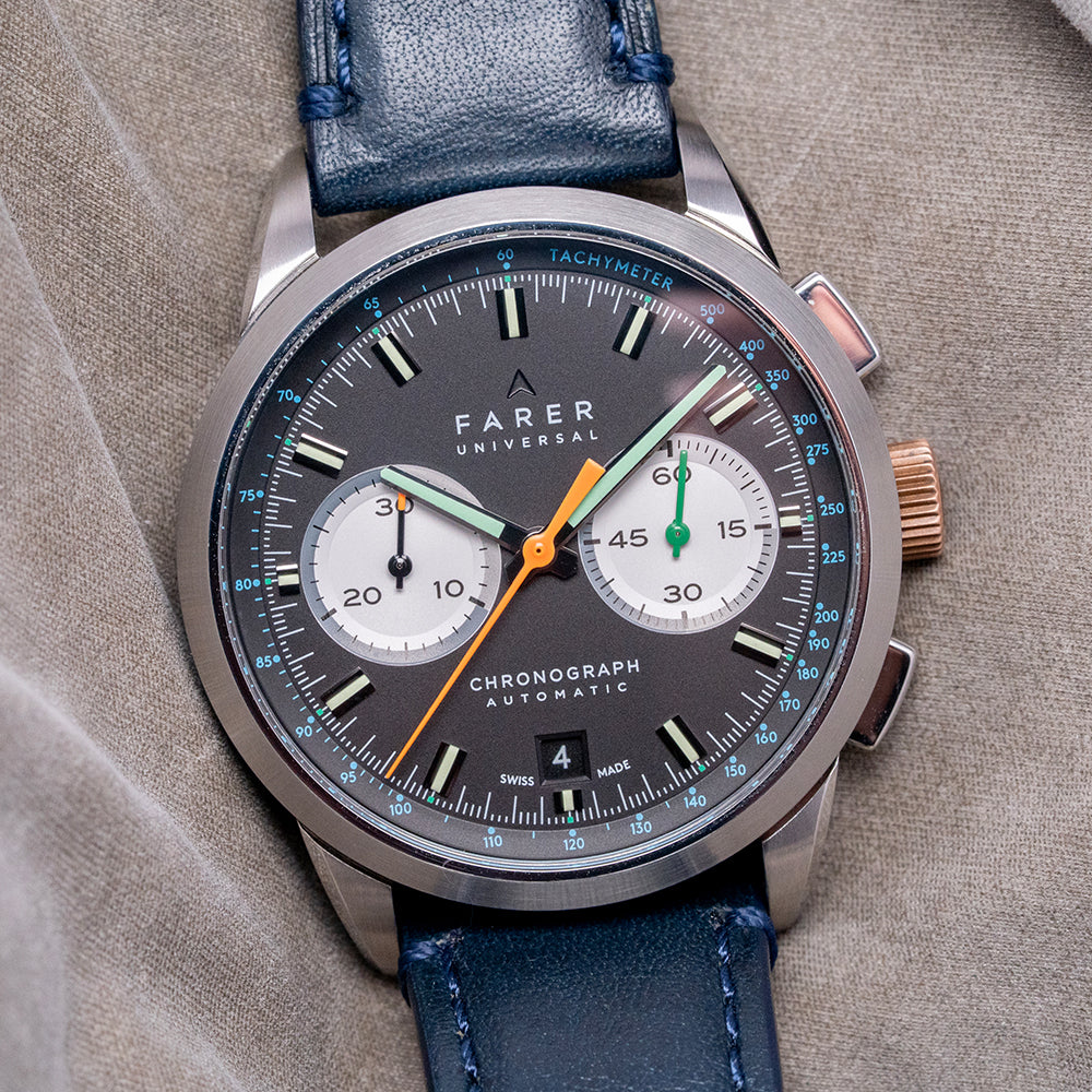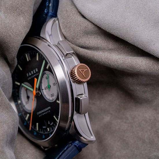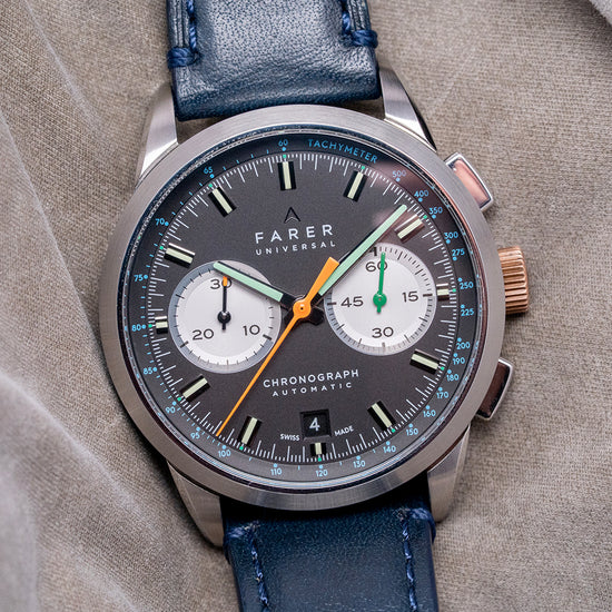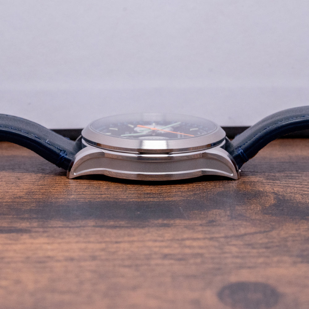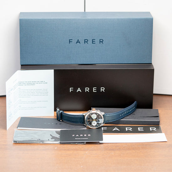 Here we have a 2018 Farer Segrave (MK1) Mechanical Chronograph, named after Henry Segrave, a British pioneer in speed trials. He was the first person to set records for both the fastest land speed and the fastest water speed simultaneously. Its 39mm polished and brushed stainless steel case sits comfortably on your wrist with tapered lugs. The flanks of the watch have polished edges and micro-blasted cut-in sections, adding depth and interest to the case. Its lug-to-lug length of 46mm and case thickness of 12.5mm give the watch an impressive wrist presence. On the right side, we have the rectangular chronograph pushers and a bronze, signed, coin-edged crown at the centre. The polished and brushed smooth bezel holds a flat sapphire crystal AR-coated above a dynamic matte black bicompax dial. An outer Tachymeter scale chapter ring in blue numerals surrounds a minute track precisely executed with green accents, the applied steel thick baton indexes are filled with Super-LumiNova marking the hours; at 3 o’clock we have a white recessed running seconds register with a green hand; at 6 o’clock a colour matched date window and finally at 9 o’clock a white recessed 30-minute register with a black stick hand, thin baton hands are filled with Super-LumiNova, complemented by an orange tapered chronograph hand, the Farer motif sits at noon and at 6 o’clock ‘Chronograph Automatic’ completes this colourful bicompax sports watch. On the reverse, a screwed-down exhibition case back is engraved with the details of the watch around its edge. Inside, an automatic ETA 2894-2 Elaboré, 37 jewels, beats at 28,800 beats per hour. This high-quality movement is based on the ETA 2892, fitted with a chronograph module. The skeletonised signed bronze ‘turbine’ bidirectional rotor. It comes paired with its quick-release 20mm leather strap and signed pin buckle. This watch is sold with its original Farer box and paperwork.
