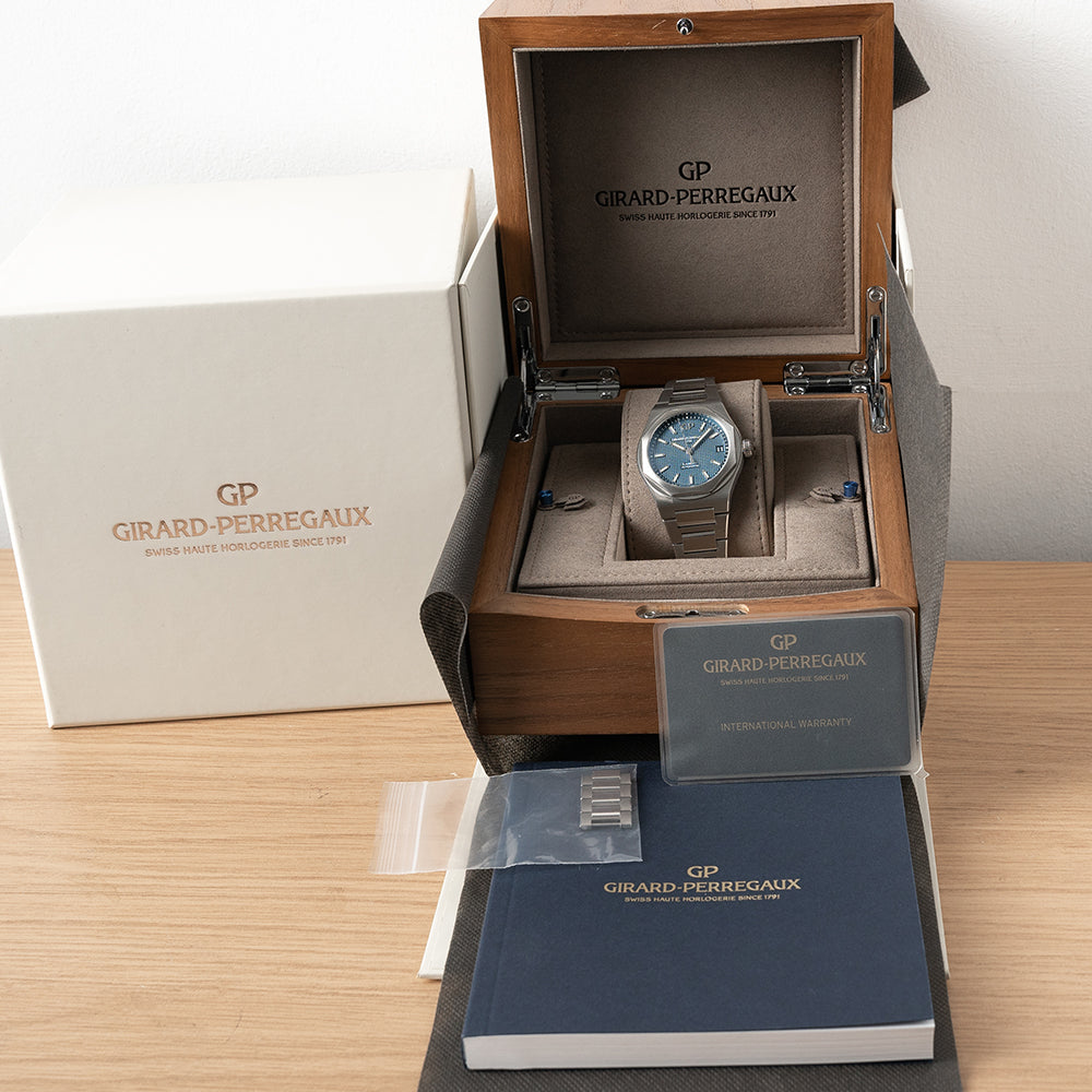 This watch is sold with its original Girard Perregaux Box & Paperwork. The watch comes paired with its original Girard Perregaux polished and brushed integrated bracelet with a push-button release deployment clasp, all links included. The watch is from October 2018 and is sold in worn condition as you can see from the photographs, a full case and bracelet refurb can be provided at an additional cost. The watch comes with our 12-Months Warranty.