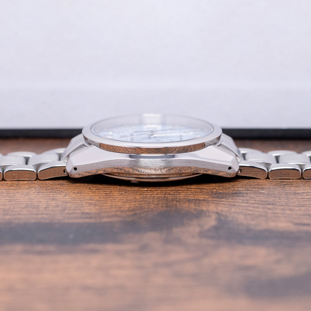Here we have a rarely seen 2018 Grand Seiko Spring Drive 'Kira Zuri' SBGA387 exclusive US Limited to 558 pieces. Inspired by the Japanese art style Kira-zuri, which translates to “sparkling painting,” this technique adds a sense of shine and vibrancy to the artwork. It features a brushed and polished 40mm stainless steel case that gently curves over your wrist, with tapered, drilled lugs. Highly polished surfaces, resulting in a lug-to-lug measurement of 46mm and a case thickness of 12.5mm, which gives the watch an impressive wrist presence. On the right side is a screw-down signed crown that sits slightly recessed. A smooth, polished bezel holds a flat sapphire crystal, AR-coated on the inside, above a stunning blue 'Kira Zuri' textured dial. An outer minute track surrounds the Zaratsu-polished baton indexes, with facet edges marking the hours. At 3 o’clock, a framed date window is located. Elegant dauphine hands are Zaratsu polished with razor edges, complemented by a blue sweeping second hand, between the 7 and 8, a power reserve. At noon, the words “GS” and “Grand Seiko” motif; at 6 o’clock, a black printed “Spring Drive” completes this striking, mesmerising dial. On the reverse is a screw-down exhibition case back with the watch's details etched around its edge, inside a Grand Seiko Cal. 9R65 Spring Drive, the innovative Spring Drive movement is mechanical but with an electromagnetic escapement regulated by a quartz oscillator. It has 30 jewels and a power reserve of an impressive 72 hours; its sole power source is a mainspring that drives a series of gears. A rotor connected to the end of these gears then generates a small electrical charge that activates an electronic circuit and quartz oscillator; therefore, there is no need for a battery. It comes paired with its original brushed and polished Grand Seiko 19mm 5-link stainless steel bracelet, secured by a signed push-button three-fold clasp. All links are provided, plus two 19mm Grand Seiko straps and a deployant buckle. This watch is sold with its original Grand Seiko box, swing tag and Grand Seiko paperwork.