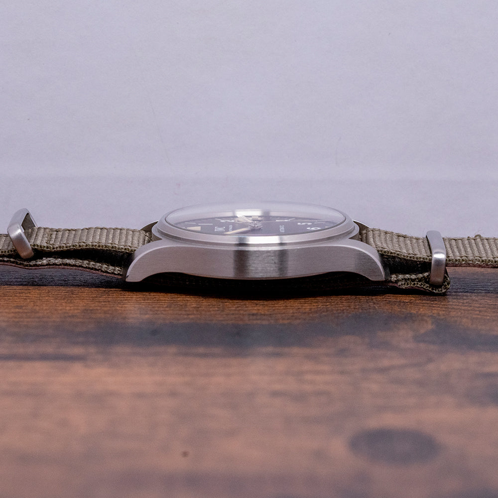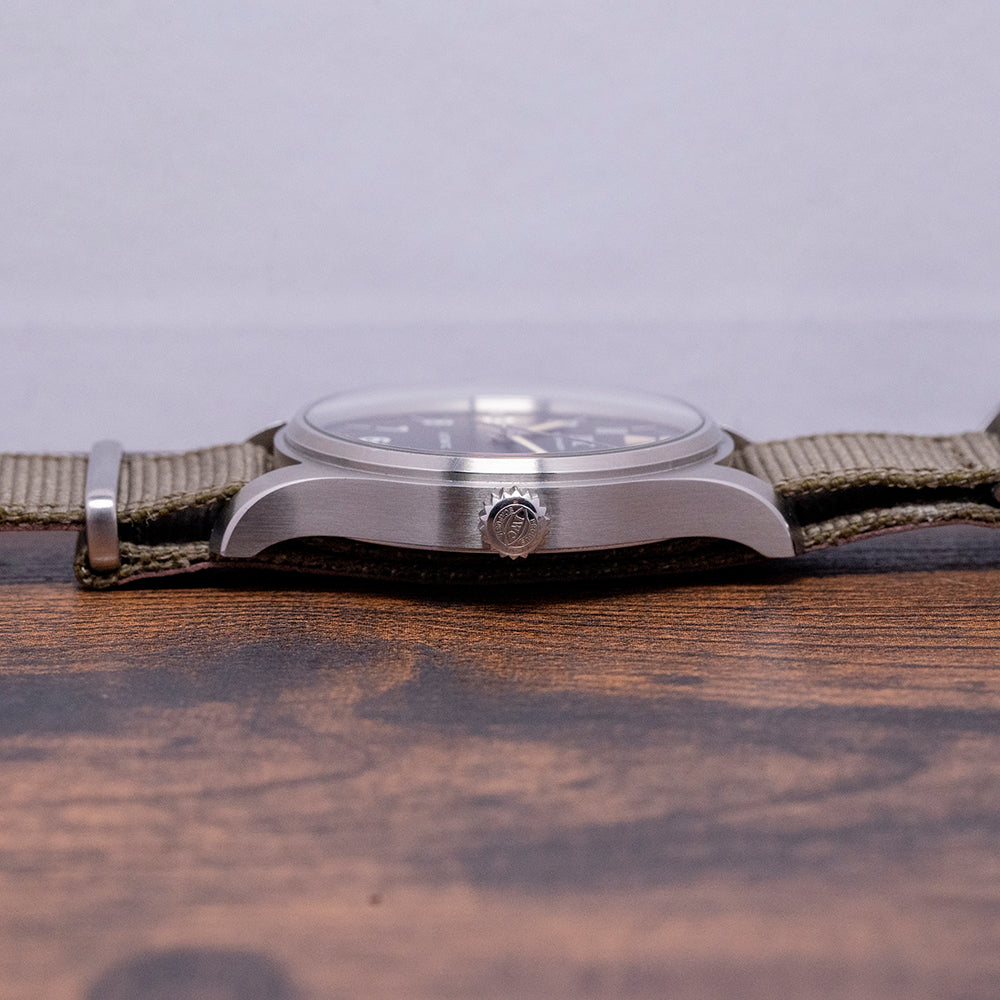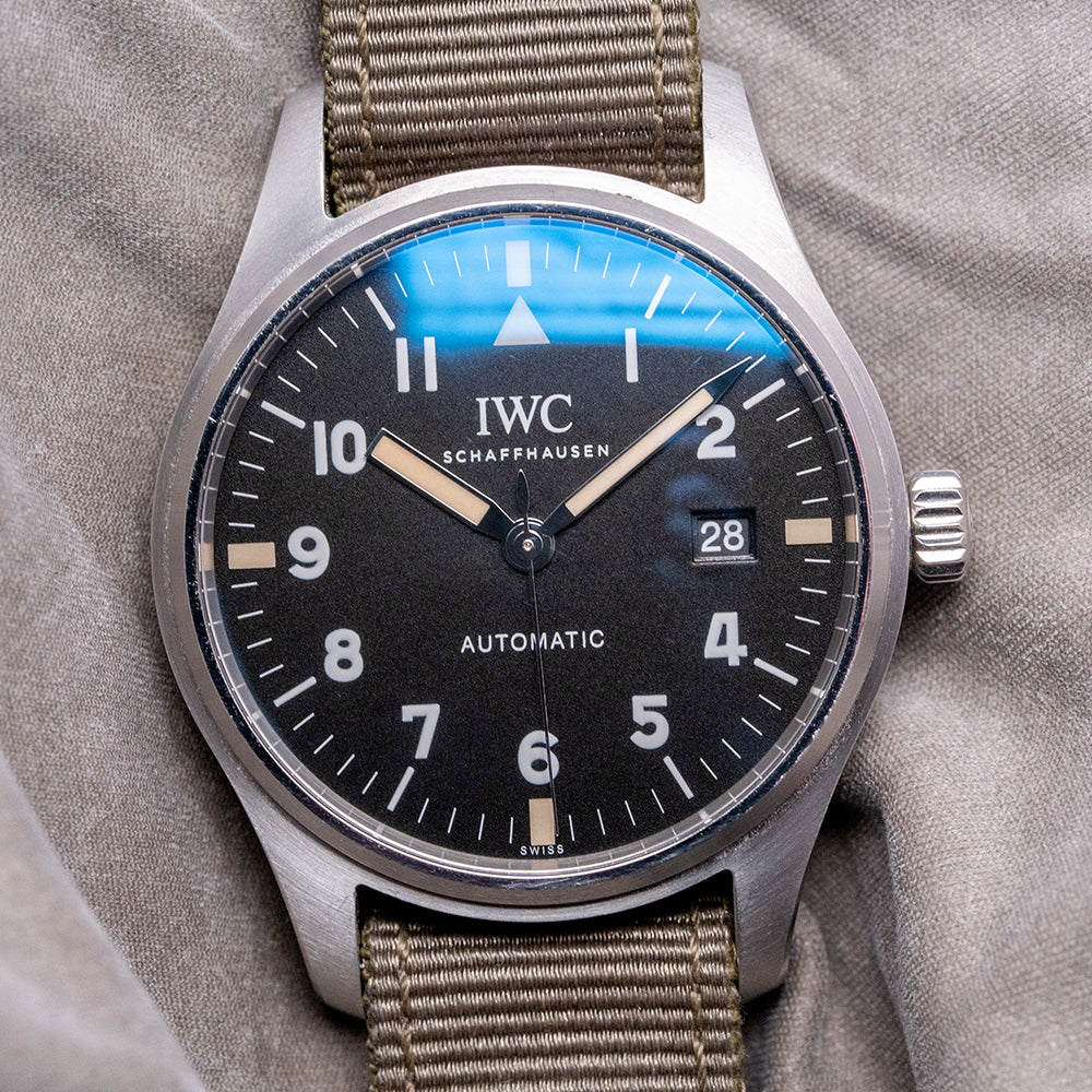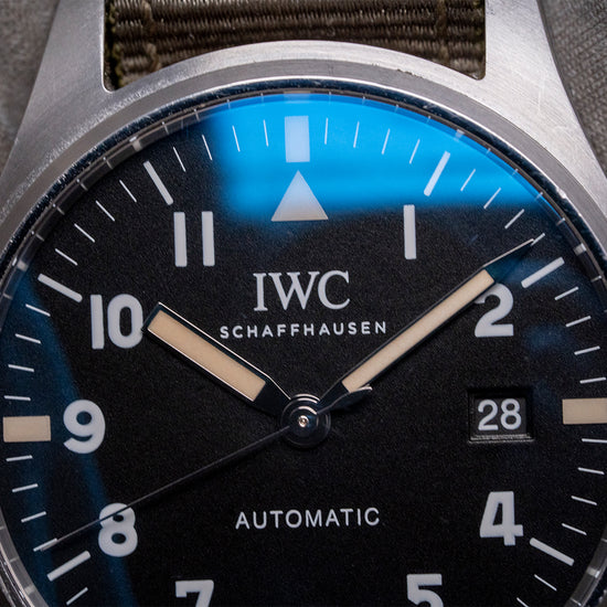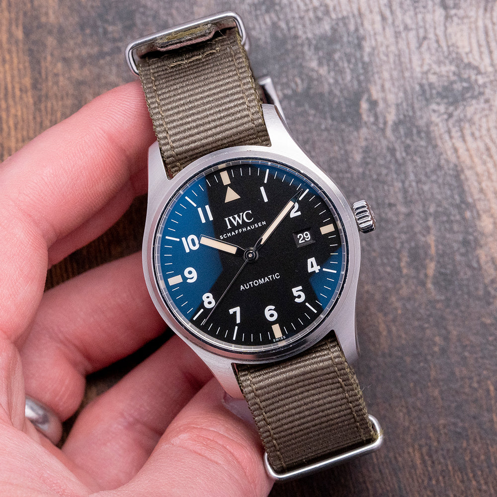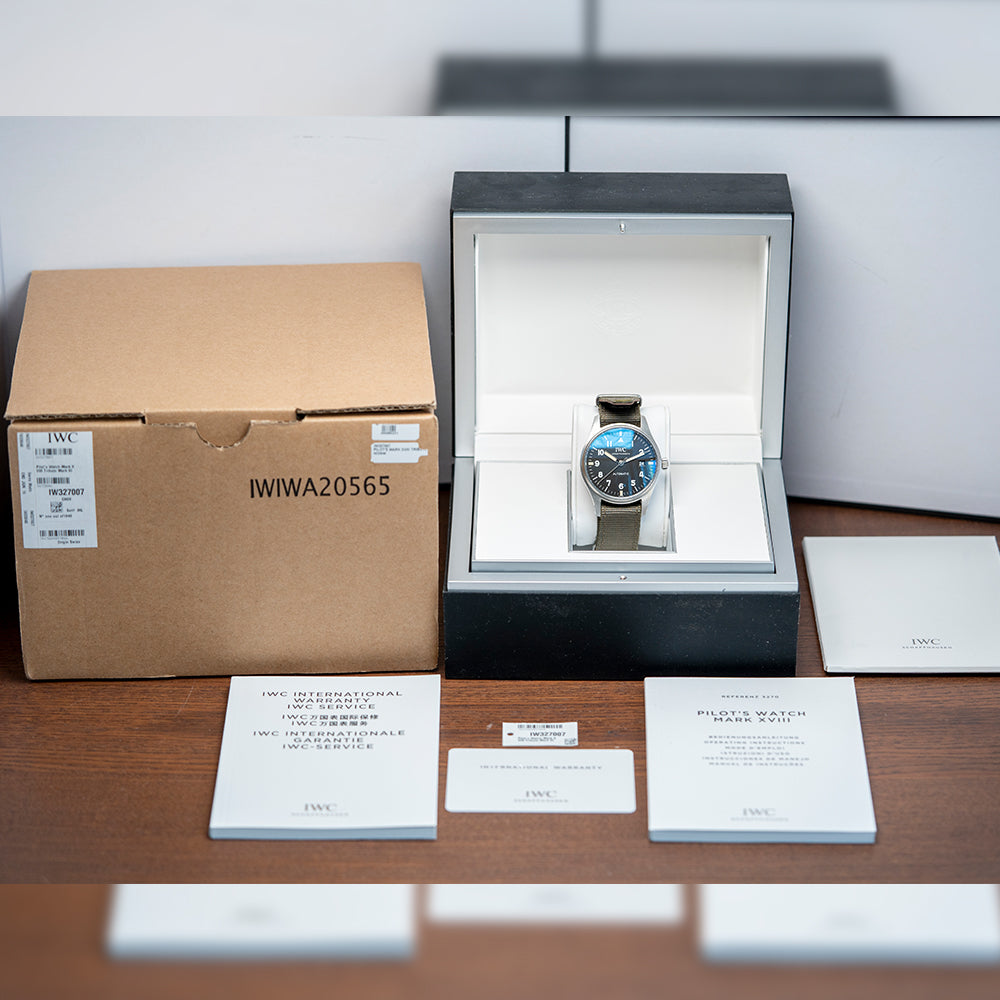 This 2018 IWC Mark XVIII Edition 'Tribute to Mark XI' 40mm IW327007, the Mark XI was produced from 1948 until the 1980s. It was mainly issued to the Royal Air Force, but was also issued to the Commonwealth armed forces. The robust case and legible Arabic numerals made this a firm favourite amongst the many users of the Mark XI. This special edition was initially available exclusively from Harrods in London for a period of three months in July 2017. After that time, it was available for purchase in all IWC boutiques and authorised retailers, limited to 1,948 watches. A 40mm brushed and polished stainless steel case gently curves at the tapered lugs. The lug-to-lug length is 51mm, and the thickness is 10.5mm, giving the watch an impressive wrist presence. On the right side, there is a signed crown. A convex sapphire crystal with an AR coating on both sides provides excellent viewing angles, sitting above a matte black dial. An outer minute track with lume plots at 12, 3, 6, and 9, large Arabic numeral indices mark the hours coated in SuperLumiNova, and at 12 o’clock, the iconic triangle. At 3 o’clock, a colour-matched date window. The baton hands are coated in old radium SuperLumiNova, complemented by a fine, tapered, sweeping second hand with a leaf counterweight. The text is precisely printed at noon, with the IWC motif and “Automatic” at 6 o'clock. On the reverse, a screw-down case back features the special edition details and is engraved with "one out of 1948." Inside is an automatic IWC Cal. 35111, with 25 jewels and a frequency of 28,800 beats per hour, based on the Sellita SW300-1 movement, which was developed using only 163 components. It comes paired with its 20mm IWC NATO strap, featuring a signed buckle, and also includes the IWC presentation box and papers.