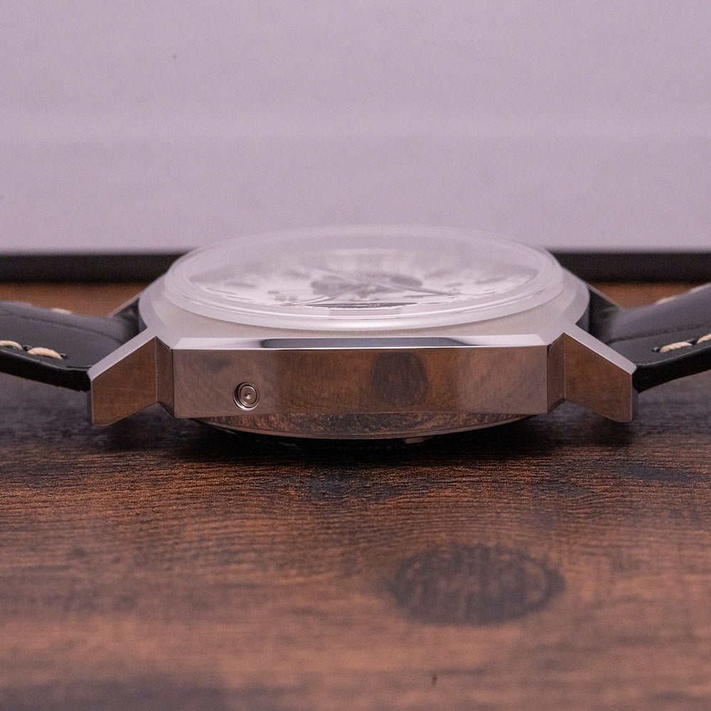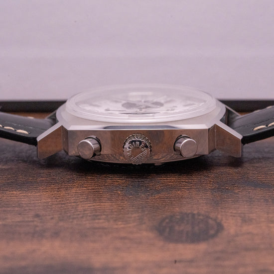 Here we have a Longines Heritage Collection 1973 Chronograph L2.791.4.72.0, inspired by their racing chronographs of the 1970s, the 40mm stainless steel cushion case has thin angled lugs, and a lug-to-lug length of 48mm and a case thickness of 14mm give the watch an impressive wrist presence. Polished and brushed surfaces transition with crisp edges, and on the right side chronograph pushers and a signed crown. A domed sapphire crystal sits above a white panda dial, an outer Tachymeter scale with applied Rhodium-plated baton indexes marks the hours, between 4 and 5 a framed date window, at 3 o’clock a 30-minute register is slightly recessed in black with concentric rings, at 6 o’clock a 12-hour register and finally, at 9 o’clock the 60-minute register in black with concentric rings completes the classic panda dial. Slender Rhodium-plated baton hands with lume tips complemented by a tapered chronograph hand, the text is precisely printed at 12 o’clock. On the reverse a screw-down exhibition case back showcasing an automatic Longines L688, based on the ETA A08.L01, column-wheel chronograph movement. The watch comes paired with its original 20mm Longines leather strap with a signed buckle and comes with its Longines presentation box and papers.