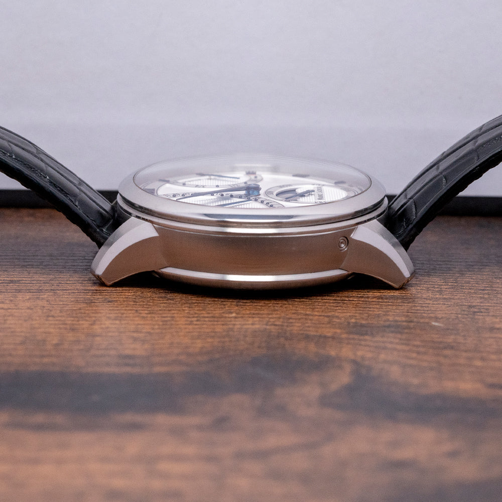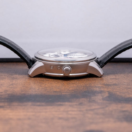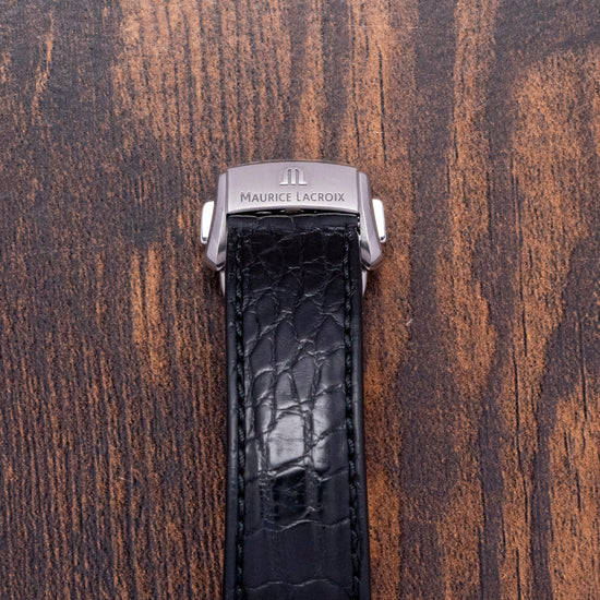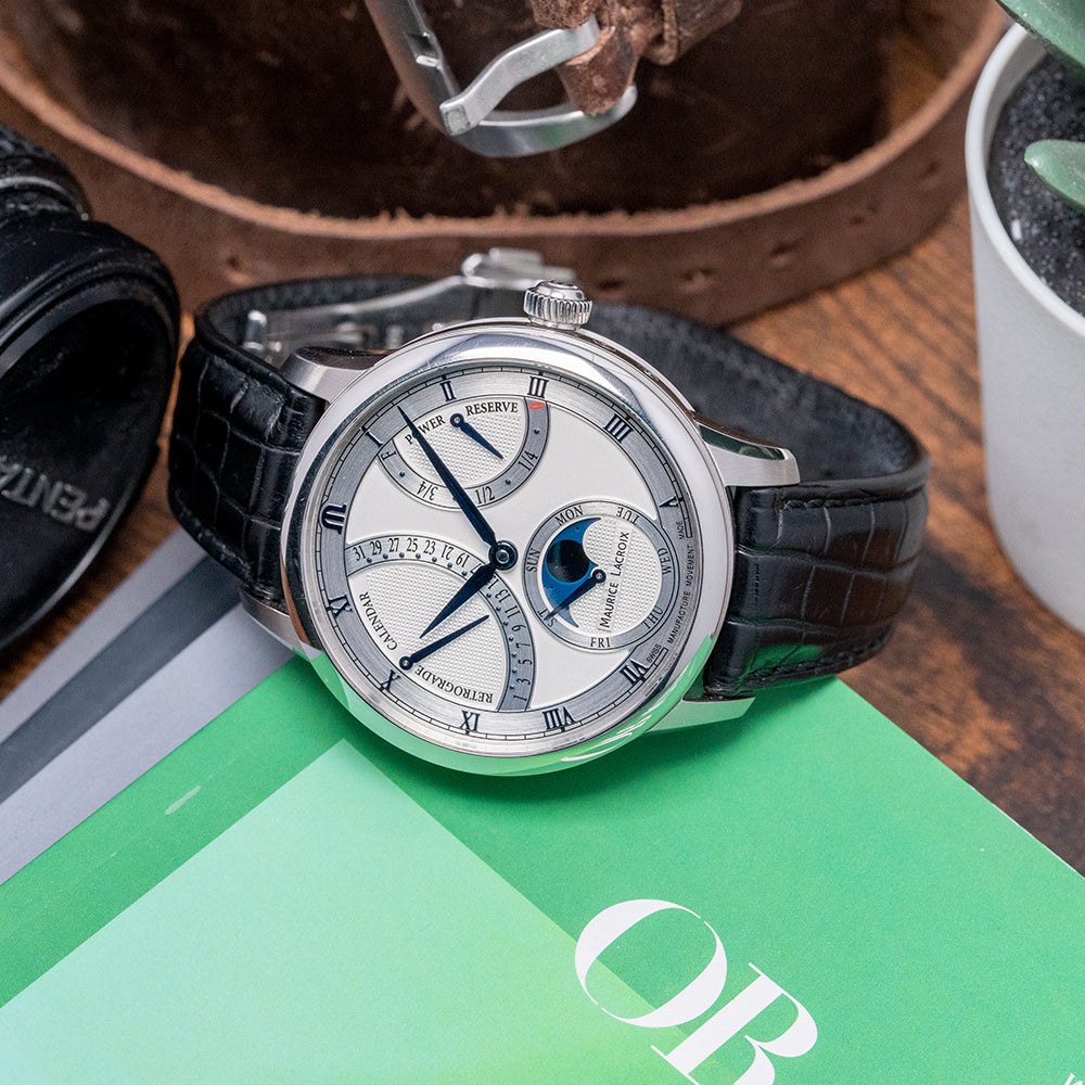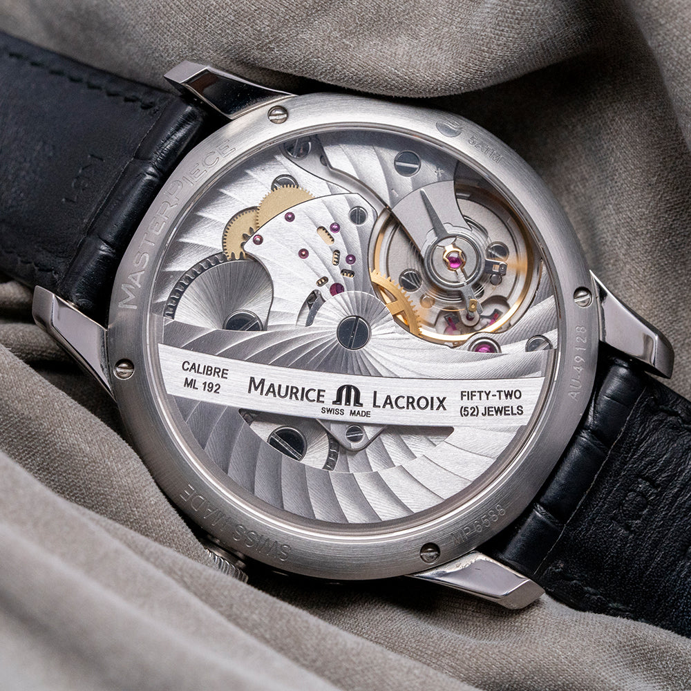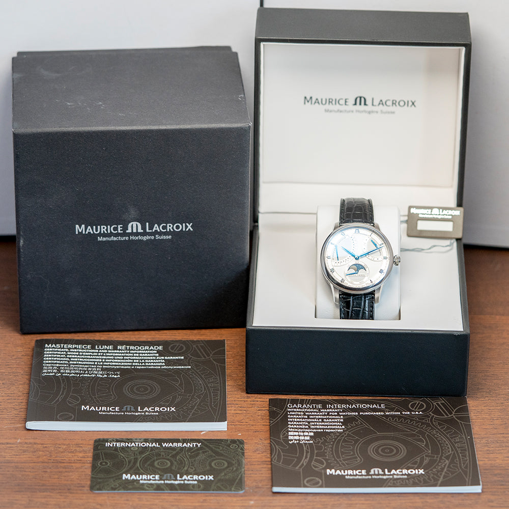 Here we have the 2018 Maurice Lacroix Masterpiece Moon Retrograde Calendar, released at BaselWorld in 2017, featuring a 43mm round stainless steel case that curves over your wrist with finely tapered satin-brushed and polished flat-ended lugs. Its sculpted, polished and satin-brushed flanks lead to a comfortable lug-to-lug length of 50.5mm and a case thickness of 14.5mm, giving the watch an impressive wrist presence. On the right side, a signed, domed, coin-edged crown sits prominently on the case. Recessed pushers are used to adjust the various complications. A domed, smooth, polished bezel holds a domed sapphire crystal AR-coated above the stunning Opaline white dial. A sandblasted silver ring decorated in “clous de Paris” features a blue outer minute railroad track that surrounds Roman numerals marking the hours, at 2 o’clock we have the retrograde power reserve and at 10 o’clock a retrograde date, each is beautifully executed in sandblasted silver and blue with guilloché in the centre, when the hand reaches the end of its travel it jumps back to its start position. Elegant facet-edged diamond-cut blue hands sit majestically above a Moonphase and Day subdial, decorated in sandblasted silver and blue with guilloché in the centre. Inside the subdial, we have the Maurice Lacroix motif completing this stunning Masterpiece. On the reverse, a screwed down sapphire exhibition case back engraved with the details of the watch around its edge, inside an in-house automatic ML Cal. ML 192, 59 jewels, beating at a leisurely 18,000 beats per hour. It comes paired with its 21mm Maurice Lacroix leather strap and signed push-button deployant buckle. This watch is sold with its original Maurice Lacroix Box, swing tag and paperwork.