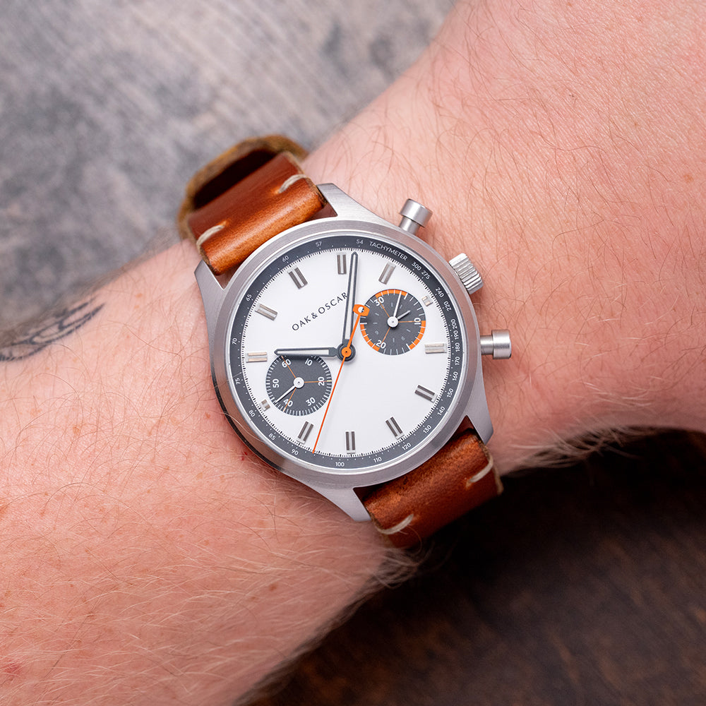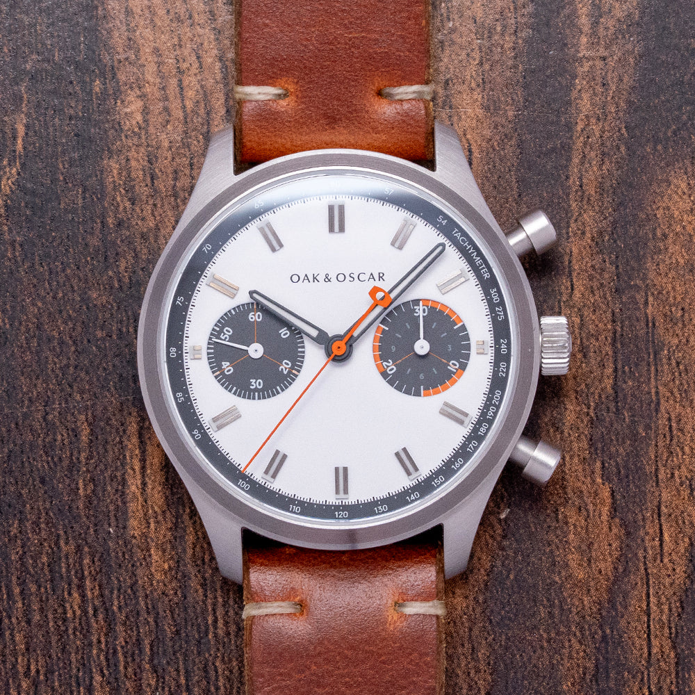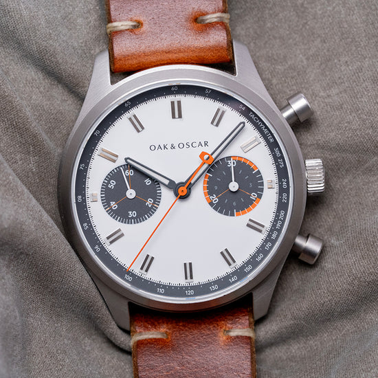 Here we have the 2018 Oak and Oscar 'Batch Nº1' Chronograph Limited Edition of just 20/25 pieces, a special piece inspired by the Bourbon distillery's use of low batch numbers of their flavourful hand picked releases indicating a higher level of detail and quality control, launched in August 2018, it was only available to Oak and Oscar owners who received an email with a link to the purchase page. This link could be shared among owners' friends, but was never publicly released—a clever way of creating interest and FOMO. The 40mm finely brushed stainless steel case curves over your wrist with tapered lugs. The curved flanks lead to a lug-to-lug length of 46mm and a case thickness of 14mm, ensuring a comfortable fit. We have the piston chronograph pushers on the right side and a large, signed, coin-edged crown in the centre. The brushed, smooth bezel holds a double-domed sapphire crystal, AR-coated, above a striking matte white “Panda” dial. A grey outer Tachymeter scale chapter ring surrounds polished chamfer-edged baton indexes filled with Super-LumiNova down the centre marking the hours, at 3 o’clock a stacked 12-hour and 30-minute register in grey with orange highlights and at 9 o’clock a running seconds register in grey with white numerals, slender hands are filled with Super-LumiNova and complemented by an orange counterweighted chronograph hand, at 12 o’clock we have the Oak and Oscar motif completing this distinctive bicompax sports watch. On the reverse, a screw-down exhibition case back engraved with the details of the watch and a limited number, inside a manually wound Eterna Cal. 3907M, 25 jewels, beating at 28,800 beats per hour, flyback chronograph with a column wheel and stacked register. It comes paired with its 20mm Oak and Oscar vintage-style Horween leather strap with a pin buckle, plus an additional Oak and Oscar strap and a WatchGecko strap. The watch comes with its Oak and Oscar travel watch case and paperwork.