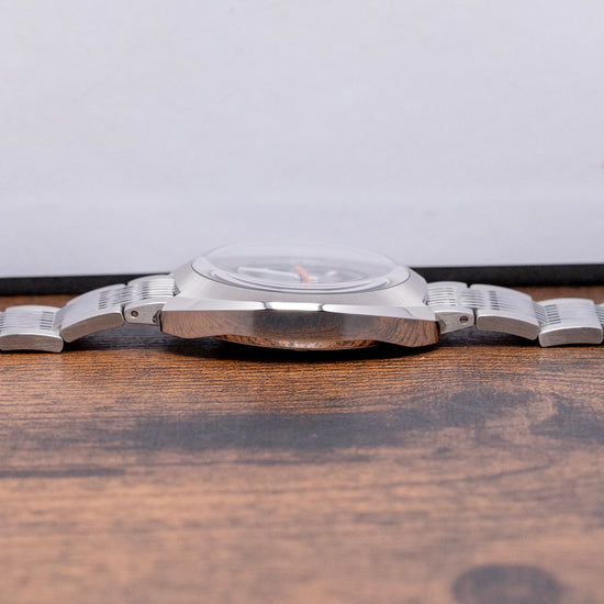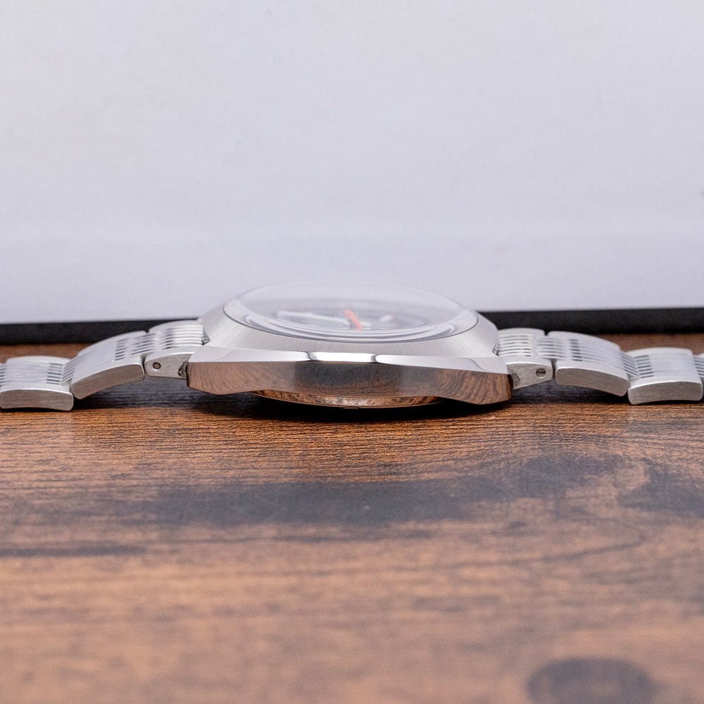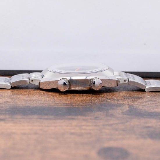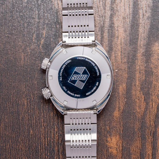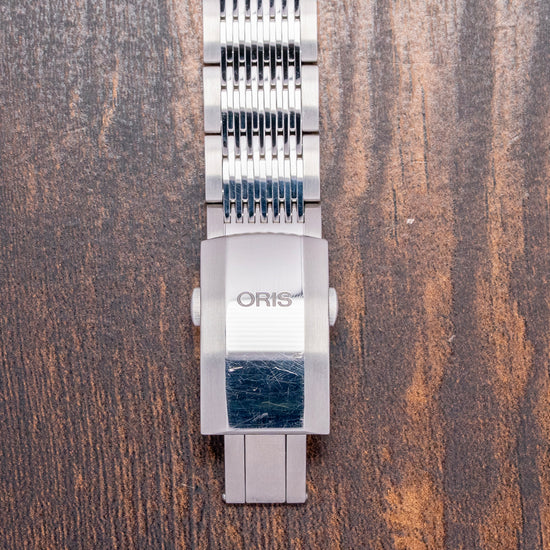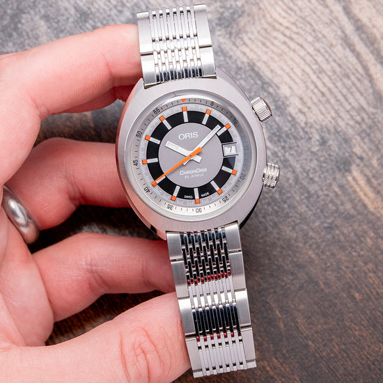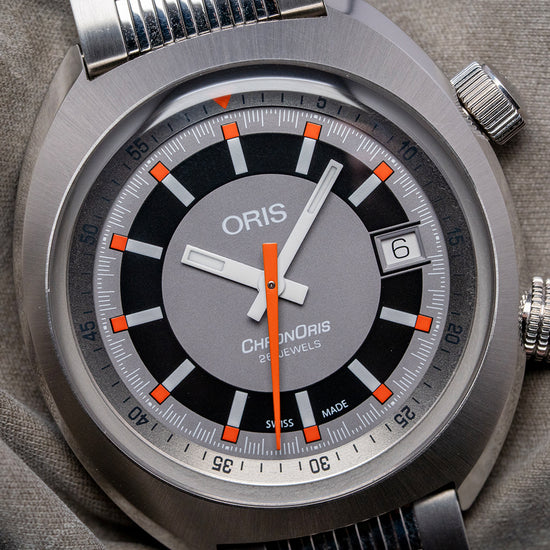 Here we have a recrafted 2018 Oris Chronoris Date automatic 01 733 7737 4053 on a Rubber strap, inspired by the 1970s ChronOris, their first Chronostop chronograph, very much like the Omega Chronostop and was the beginning of their long and illustrious relationship in motorsport. The 39mm C-shaped brushed and polished stainless steel case comfortably sits on your wrist like a cushion; bevelled leading edges flow effortlessly around the case; a lug-to-lug length of 42.5mm and a case thickness of 12mm give the watch an impressive wrist presence. Down the right side, we have the top crown to adjust the time, date and winding; at 4 o’clock, we have a signed screw-down crown to adjust the silver inner rotating 60-minute bezel with deep knurling for grip. A domed sapphire crystal AR coated on the inside sits above a dynamic sector-style grey and black dial, the inner rotating bezel surrounds a minute track precisely executed, applied baton indexes tipped in orange mark the hours inside a black ring; at 3 o’clock, a framed date window and white baton hands filled with SuperLumiNova are complemented by a tapered orange sweeping second-hand, at 12 o’clock we have the Oris motif, and at 6 o’clock ChronOris 26 jewels complete this vintage-inspired sports watch. On the reverse, there is a screw-down solid case back with the Oris shield in the centre, inside an automatic Oris Cal. 733, based on the Sellita SW200-1; the balance has a frequency of 28,800 beats per hour, and the movement contains 26 jewels. The watch comes paired with a 19mm Oris It comes paired with a 19mm Oris polished and brushed stainless steel bracelet secured by a signed push-button deployant clasp, and includes its Oris presentation box, swing tag, and Oris paperwork.