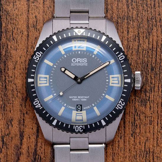 If you know me, you'll know I am a huge fan of Oris and what they have done with their diving range, offering the modern diver with the Aquis and the heritage diver with this amazing Sixty-Five model. This specific 40mm model features one of the best dials of the lot in my opinion, a subtle blue contrasted beautifully against grey, it works with the exploded art-deco style numerals and the overall design. I would not hesitate to add one of these to your collection.