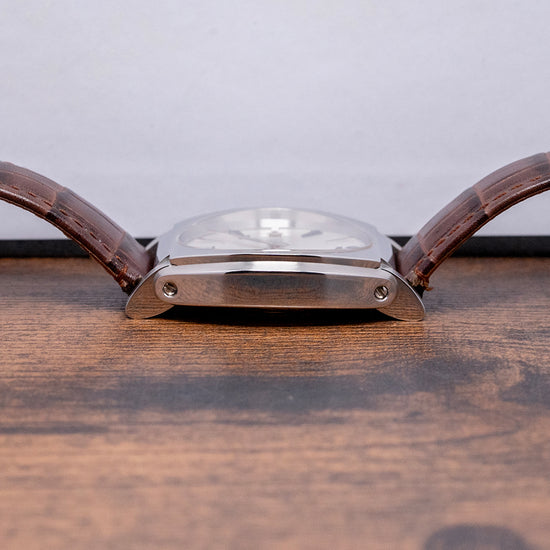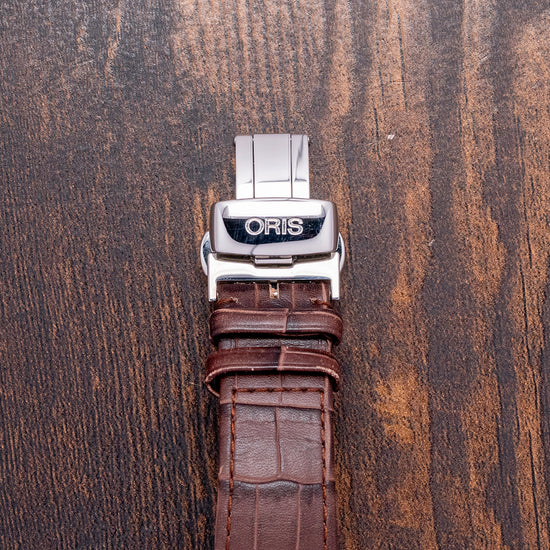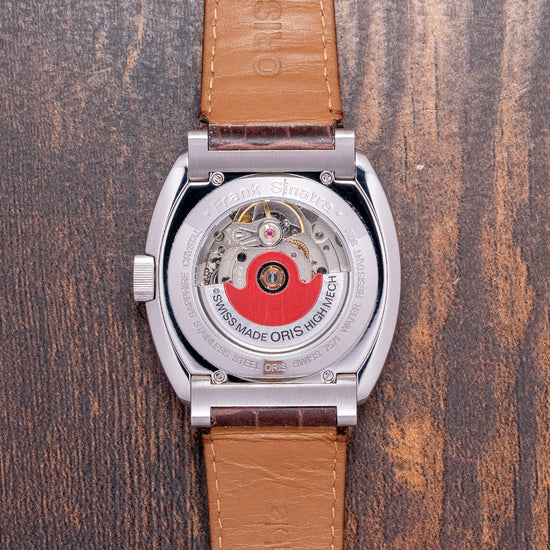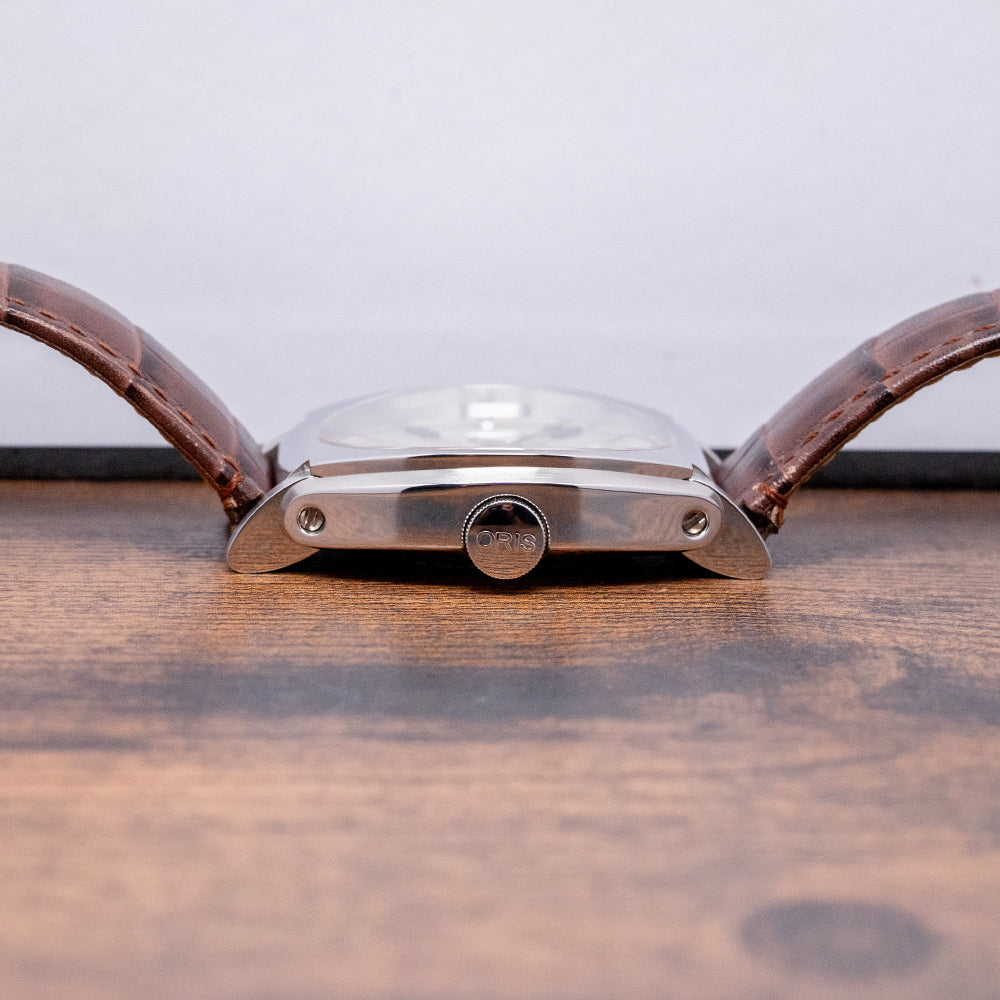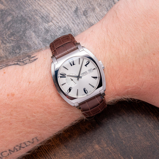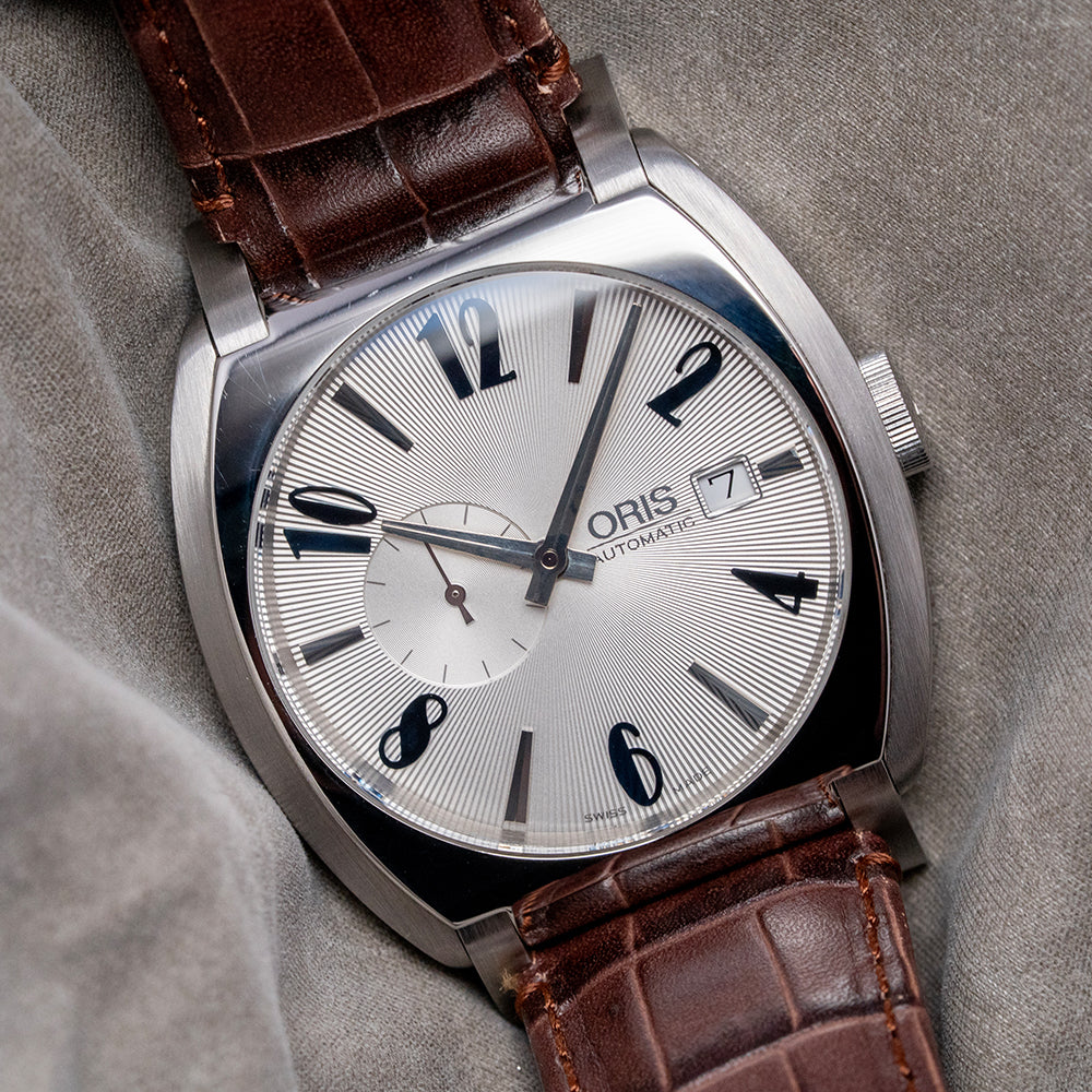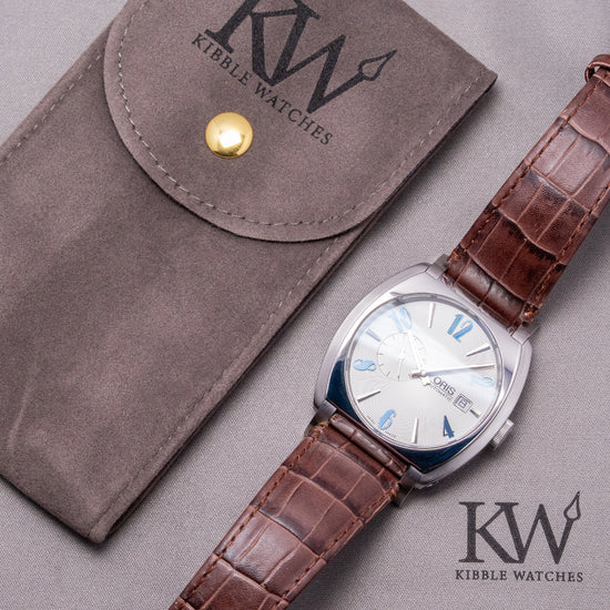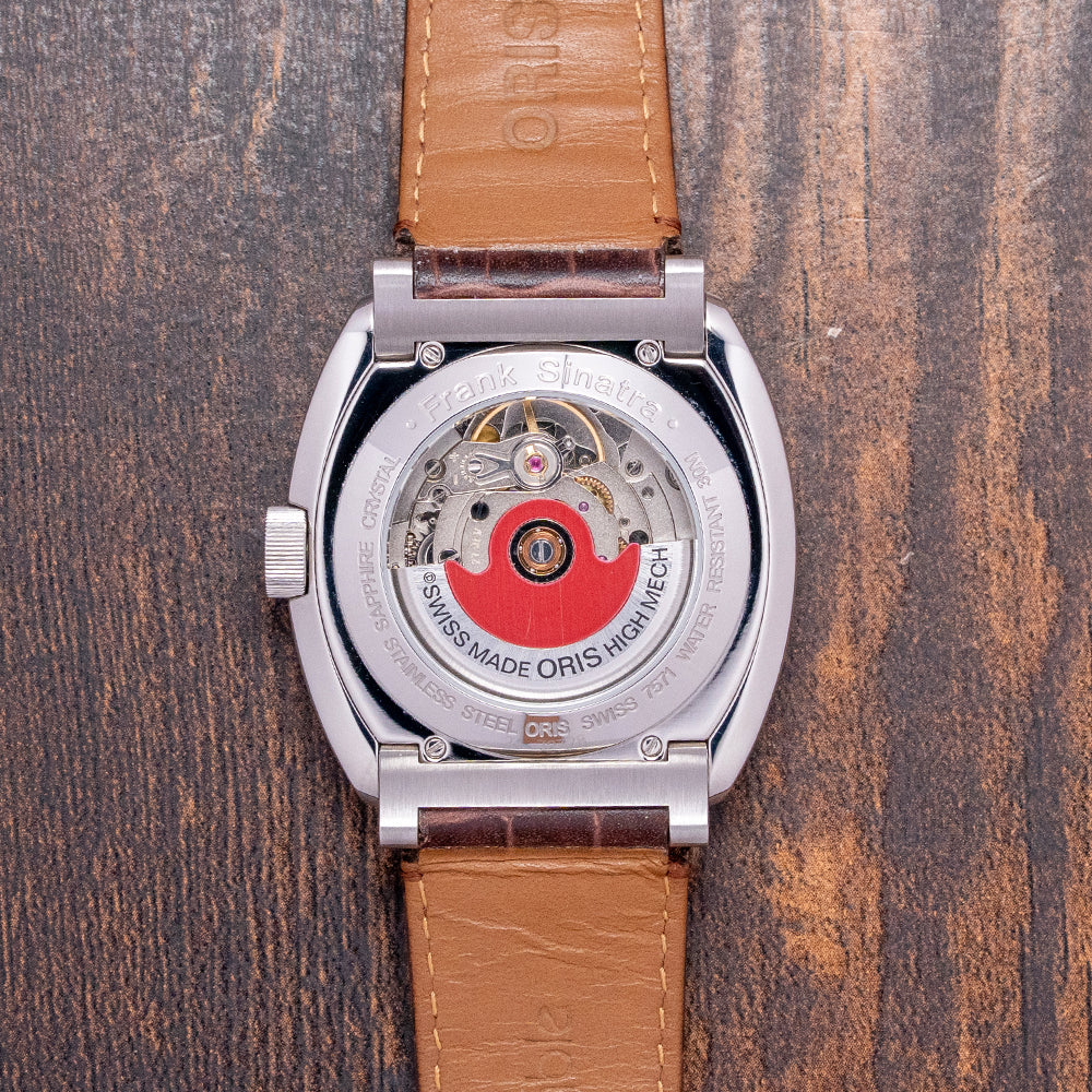 Here we have a charismatic 2018 Oris Frank Sinatra Automatic 01 643 7571 4016. This collection, released in 2018, is inspired by the stylish and sophisticated Frank Sinatra, known as ‘Ol’ Blue Eyes’. He is one of the best-selling music artists and one a member of the famous 1950s and 60s ‘Rat Pack’ with Dean Martin and Sammy Davis Jnr. The 39mm barrel-shaped polished and brushed stainless steel cushion case features rounded, angled, drilled, and screwed articulating lugs. Its curved, polished flanks lead to a comfortable lug-to-lug length of 45mm and a case thickness of 11.5mm. On the right side, there is a signed coin-edged crown sitting slightly recessed into the case. The sapphire crystal is domed on both sides and AR-coated on the inside, creating a vintage aesthetic that covers a stunning radial patterned silver dial. Applied blue numerals and steel facet-edged indexes mark the hours. At 3 o’clock, a date window, steel hands are complemented by a seconds subdial at 9 o’clock. At 3 o’clock, we have the Oris motif completing the sophisticated timepiece. On the reverse, a screwed-down mineral glass exhibition case back engraved with the details of the watch around its edge, inside an automatic Oris Cal. Oris 643, 27 jewels, beating at 28,800 beats per hour, based on the ETA 2826-2 with the characteristic red rotor. It comes paired with its 19mm Oris leather strap and signed clasp. This watch is sold with its Oris box, swing tag, and paperwork.