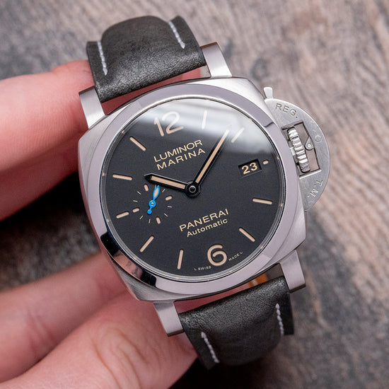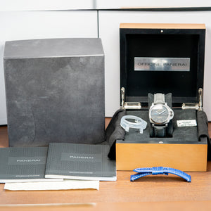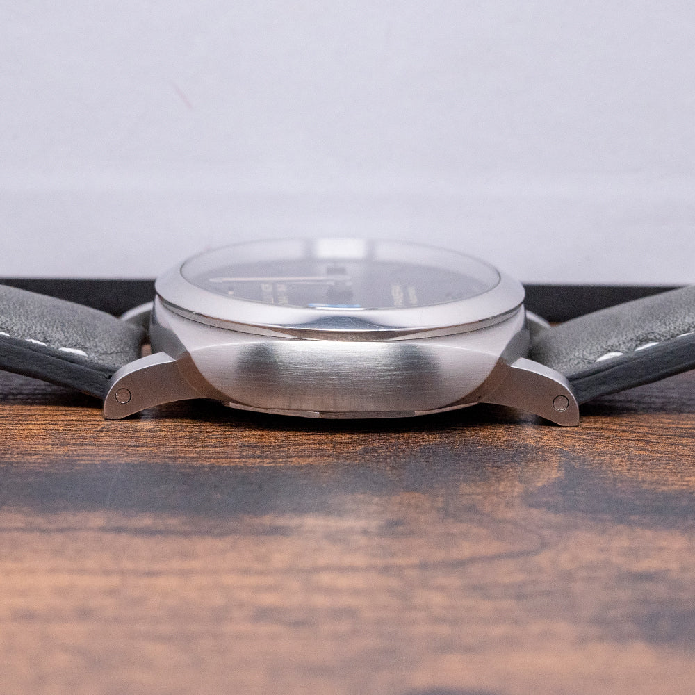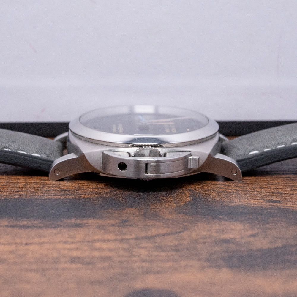 Here we have a 2018 Panerai Luminor Marina 1950 3 Days Automatic PAM01392, a modern, slimmer and smaller take on the Luminor watches of the 1950s. The distinctive 42mm brushed cushion case curves at the drilled lugs, and a lug-to-lug length of 51mm and a thickness of 12.5mm give the watch an impressive wrist presence. On the right side, a screw-down crown with a large crescent crown guard, a Panerai trademark, ensures that the crown is pushed against the case. A polished bezel holds a domed sapphire crystal above a black sandwich dial, and the upper level has cut-out numerals and batons, with the Luminor luminescence coming through from the lower level. At 3 o’clock, there is a date window, and at 9 o’clock, there is a small second register with a blue hand, and long sword hands have luminescent infill. At 12 o’clock, we have the Luminor Marina, and at 6 o’clock, the Panerai Automatic completes this contemporary dive watch. On the reverse, a screw-down exhibition case back with sapphire crystal, inside an automatic Panerai Cal. P. 9010, 31 jewels, beating 28,800 beats per hour, the movement has two spring barrels necessary for the 3-day power reserve and a bidirectional skeletonised rotor for excellent efficiency. It has a quick-set hour mechanism that allows you to set the date and hour without stopping the movement, which is very useful when travelling. It comes paired with two non-Panerai 22mm straps with its original Panerai buckle and comes with its Panerai presentation box, bezel protector and papers.