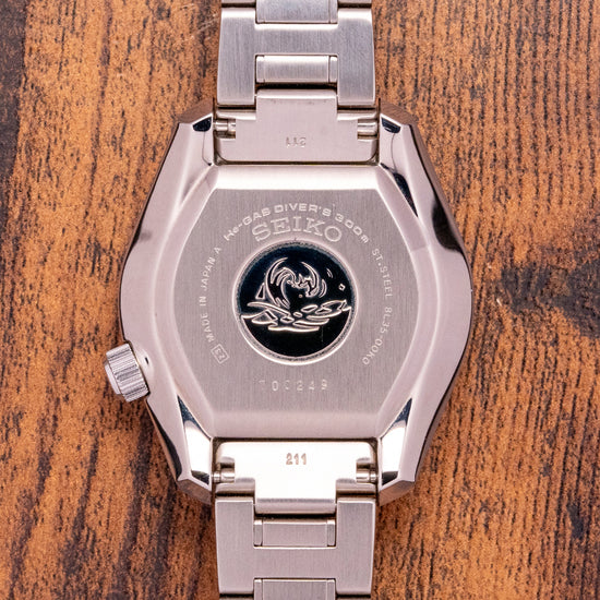 Here we have a 2018 Seiko Marinemaster 300 Black Diver Automatic SBDX017, a modern interpretation of Seiko's first "Professional" dive watches such as the famous 62MAS. A 43.5mm brushed and zaratsu polished stainless steel monobloc case coated in Seiko’s Diashield super-hard coating, to get to the movement you have to go in from the crystal side, the case shape sits on the wrist like a cushion, and Seiko gets ergonomics so right, and a lug-to-lug length of 50mm and a thickness of 15mm gives the watch an impressive wrist presence. Chamfered polished edges lead the eye towards the broad drilled lugs, on the right side at 4 o’clock a screw-down crown with the Prospex logo stamped into it. The unidirectional stainless steel bezel has a black insert with a 60-minute scale in silver numbers and deep knurling for extra grip. A flat Hardlex crystal sits recessed above a matte black dial, an outer minute chapter ring surrounds the applied disc and baton indexes are outlined in stainless steel coated in LumiBrite to mark the hours. At 3 o’clock a framed date window, broad sword hands expertly brushed are coated in LumiBrite complemented by a lume-tipped sweeping seconds hand and text is applied to the dial with Seiko motif and “MarineMaster Automatic Professional 300m” highlighting its impressive water resistance. On the reverse, an embossed Seiko Tsunami is in the centre, inside an automatic Seiko 8L35, 26 jewels, 28,800 beats per hour, the movement has hand winding and hacking functionality for your convenience, based on the Grand Seiko calibre 9S55 it is hand-assembled at the Shizuku-Ishi Watch Studio in Morioka. The watch comes fitted on a Seiko 20mm stainless steel brushed links and polished inner links bracelet with a signed fold clasp and a dive extension and is coated in Seiko’s Diashield which is scratch resistant, all links are provided plus a Seiko waffle-style rubber strap with a Seiko keeper and buckle, and the watch also comes with its Seiko presentation box and papers.