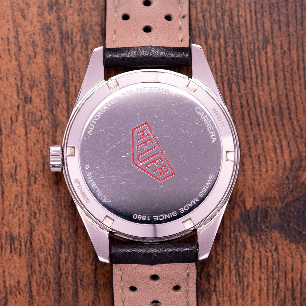 Here we have a 2018 TAG Heuer Carrera Caliber 6 Automatic, a contemporary nod to the Heuer watches of the 1960s with a 38.5mm polished stainless steel case, a subtle curve of the case leads to twisted tapered lugs, a lug-to-lug length of 46mm and a case thickness of 11.5mm gives the watch an impressive wrist presence. On the right side, is a signed crown. A smooth-stepped polished bezel holds a bevel-edged sapphire crystal above a sunburst silver dial, a raised blue 60-minute chapter ring surrounds applied steel baton indexes with chamfered edges marking the hours, at 6 o’clock a blue sub-seconds with a red hand and a date window, a nice contrast to the silver dial. Slender sword hands infilled with luminance complete this contemporary sports watch. At 12 o’clock we have the HEUER motif, a nod to its heritage “Carrera Chronometer”, and at 6 o’clock “Cal 6” was printed inside the sub-dial. On the reverse, a screw-down case back with a red “HEUER” motif engraved in its centre, inside an automatic TAG Heuer Cal. 6, 27 jewels, beating at 28,800 beats per hour, the movement has a base of the ETA 2895-2. The watch comes fitted with a 19mm black sports-style strap with a signed double folding clasp and the watch comes with its TAG HEUER presentation box and paperwork.