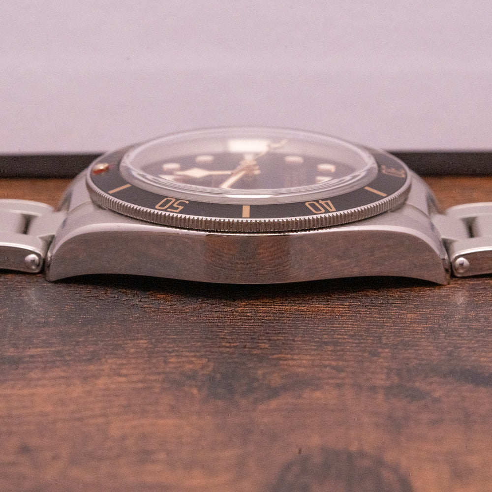 Here we have a 2018 Tudor Black Bay 58 Black on Bracelet 79030N that pays tribute to their first divers, introduced in 1958 the Ref 7924 had a 39mm case and a big crown that achieved 200m water resistance, which was some achievement back then. A 39mm stainless steel case with polished and satin finishes, the curve of the case tapers towards the lugs with a lug-to-lug length of 47.5mm and a case thickness of 12mm giving the watch an impressive wrist presence. On the right side is a screw-down signed crown, unidirectional dive bezel with 60 min numerals on a matte black aluminium insert at 12 o’clock we have the red inverted triangle and lume pip. Domed sapphire crystal AR coated protects a matte black dial, applied pips and baton hour markers are coated in Super LumiNova, and snowflake hands are coated in SuperLumiNova. On the reverse, a coin-edged screw-down case back, inside we have their in-house automatic Tudor Calibre MT5402 (COSC) Certified Chronometer, 25 jewels, 28,800 beats per hour and a bidirectional rotor system that provides a very impressive power reserve. The watch comes paired with a 20mm Tudor stainless steel bracelet, a signed folding push-button release clasp and the watch comes with its Tudor presentation box and papers.