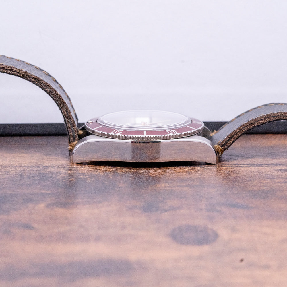 Here we have a 2018 Tudor Heritage Black Bay ETA Red on Strap 79220R inspired by their 7900 Submariner series, which was released in 1978. The 41mm stainless steel case curves over your wrist for a comfortable fit, and a lug-to-lug length of 50mm and a thickness of 12mm give the watch an impressive wrist presence. Brushed and polished edges are expertly executed around the case, and on the right side is a signed big crown. The unidirectional stainless steel bezel has a striking red 60-minute scale insert. At 12 o’clock, you find an inverted triangle with a lume pip in its centre. The domed sapphire crystal sits above a matte black dial, Gilt minute tracks with applied gilt-edged discs and batons mark the hours, and the characteristic snowflake hands are gilt-edged and coated in luminance, complemented by a gilt-sweeping second hand. Text is precisely applied to the dial, with the “Smiley Self-Winding” at 6 o’clock, indicating an ETA movement inside. On the reverse, a coin-edged screw-down case back, inside an automatic ETA 2824, 25 jewels, 28,800 beats per hour, which has been modified by Tudor, removing the date function, changes to the antishock system, and finally updating the mainspring mechanism. The watch comes paired with its original 22mm Tudor leather strap and signed folding clasp, a 22mm NATO strap and comes with its Tudor presentation box, swing tag and papers.