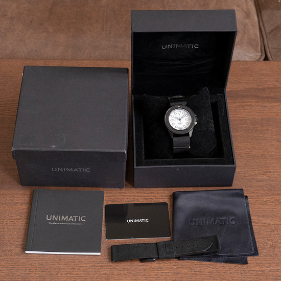 This watch is being sold with its original Unimatic box and paperwork. It also includes the original 22mm Unimatic NATO strap and an extra 22mm Unimatic strap in the box. The watch is from 2018 and is in like-new condition, as you can see in the photos. It also comes with a 12-Months Warranty.