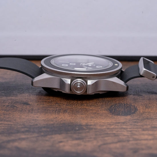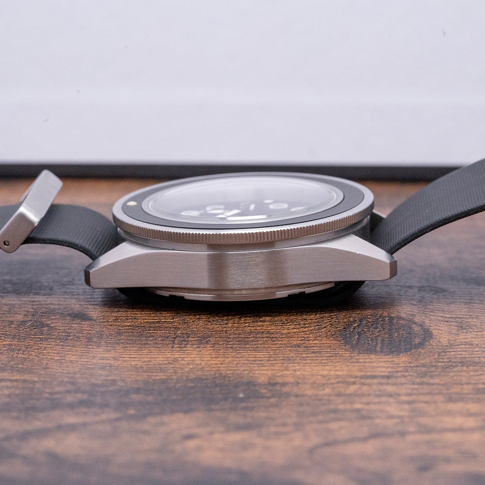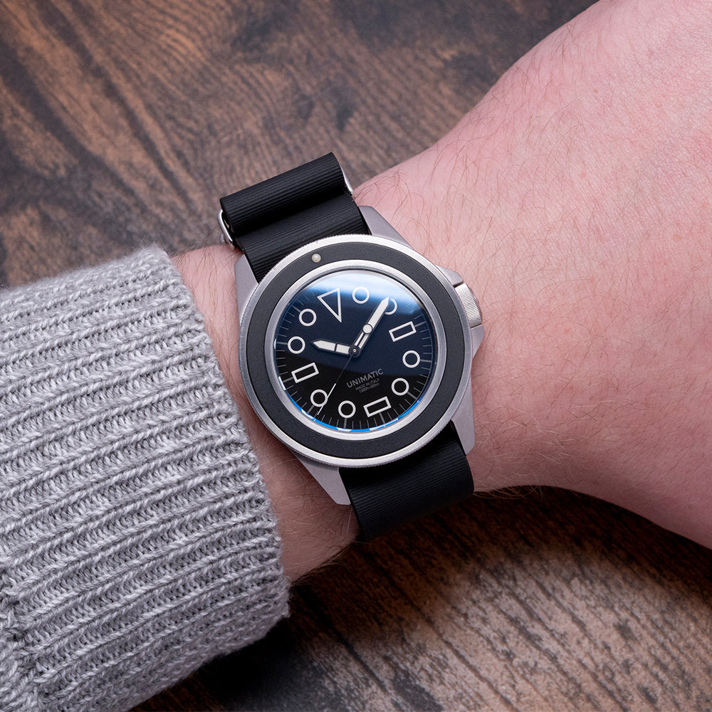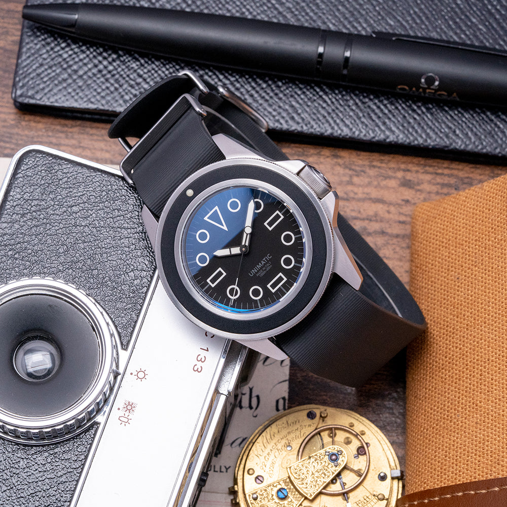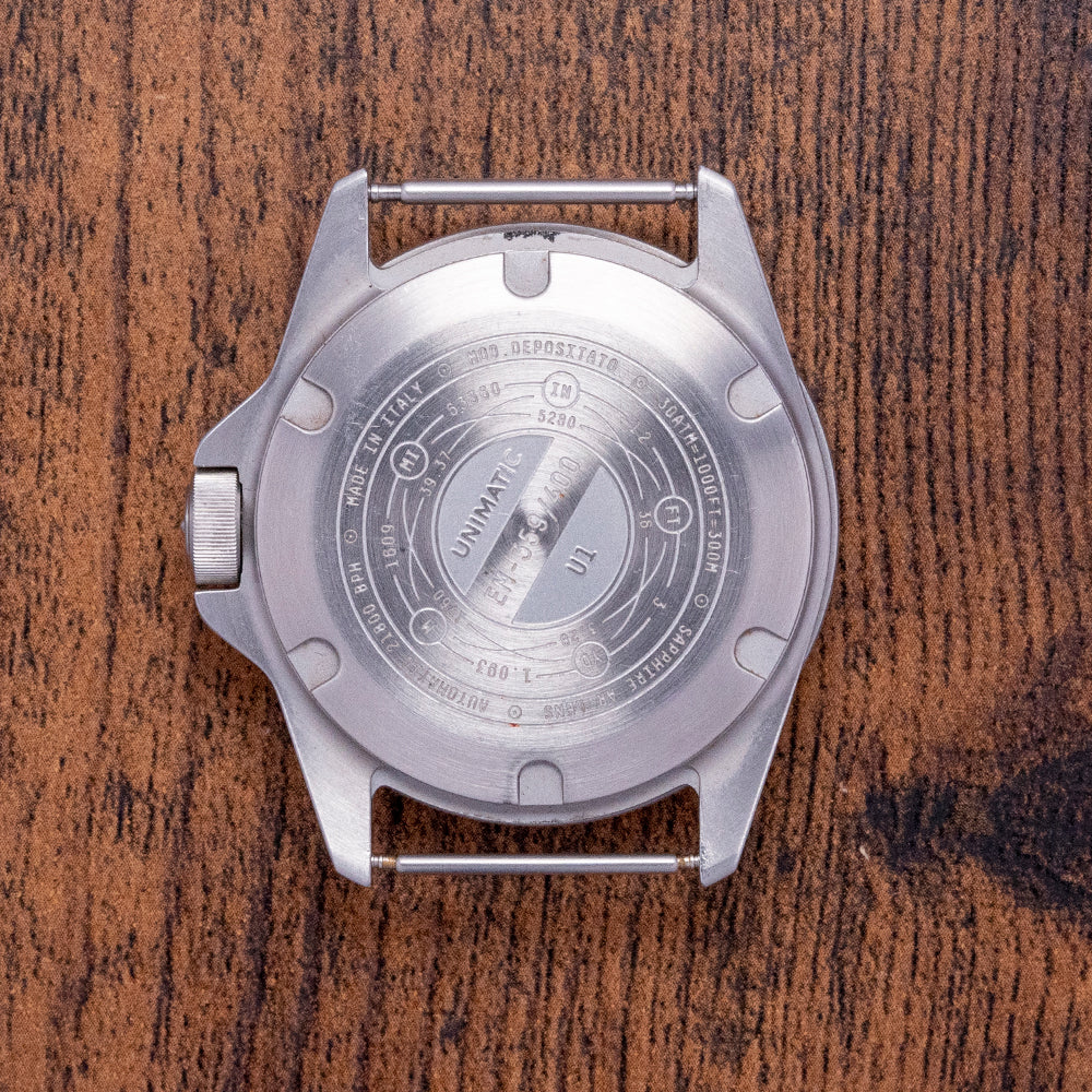 Here we have a 2018 Unimatic U1-EM Black Limited to 400 pieces. The 41.5mm brushed stainless steel case curves in all the right places, and a lug-to-lug length of 48.5mm and a thickness of 13mm ensure a comfortable fit on your wrist. On the right side, is a signed screw-down crown protected by crown guards. Its 120-click uni-directional sterile bezel has a lume pip at 12. A sapphire crystal AR coated sits above a matte black dial, large disc and baton indexes outlined with Super-LumiNova C1 White mark the hours, and broad phantom ladder hands filled with the same Super-LumiNova C1 White lume are complemented by a black reverse lollipop second hand with a white tip. At 6 o’clock we have the Unimatic motif Made in “Italy 1000ft-330m” completing this distinctive stealthy sports watch. On the reverse, a screw-down case back with a deeply engraved Unimatic conversion scale and its number out of 400, inside an automatic Seiko NH35A, 24 jewels, 21,600 beats per hour. The watch comes paired with three Unimatic 22mm straps with signed buckles and also comes with its Unimatic presentation box and papers.