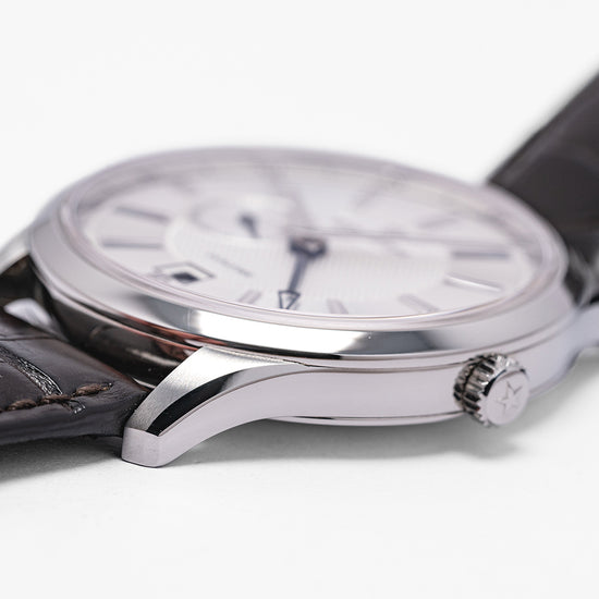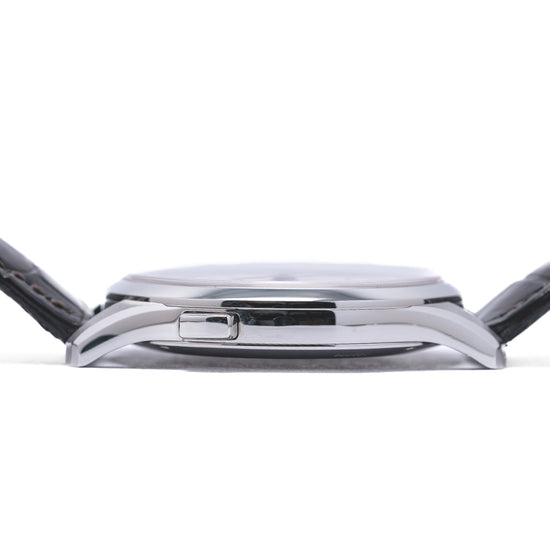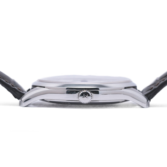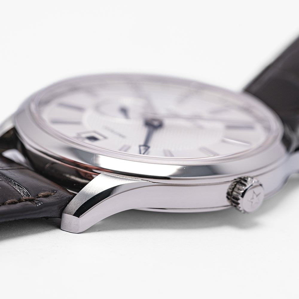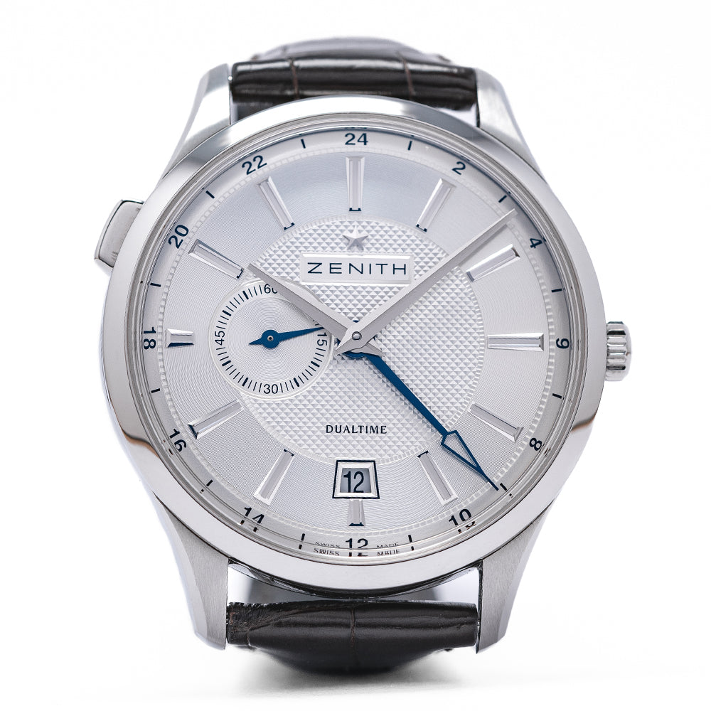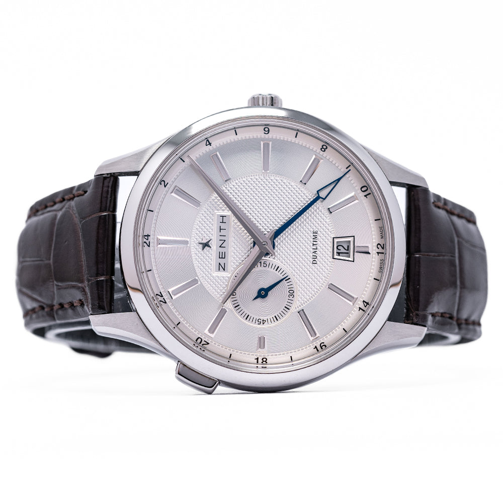 Here we have a 2018 Zenith Captain Elite Dual Time 03.2130.682/02.C498 first introduced by Zenith in 1952 as part of their Captain collection inspired by the world's sea captains who required an accurate timepiece, as they travelled the world’s oceans. A polished and brushed 40mm stainless steel case curves over your wrist with finely tapered lugs, a lug-to-lug length of 47.5mm and a case thickness of just 9mm ensures a comfortable fit. On the right side a signed crown and on the left side at 10 o’clock a pusher to activate the GMT hand. The polished smooth bezel holds a flat sapphire crystal above a stunning silver-toned dial. A 24-hour outer ring surrounds a wide concentric circular silver ring with applied steel baton indexes that slope with scalloped centres marks the hours, the engine turned guilloché centre disc has a continuous seconds sub-dial at 9 o’clock with a blued hand, and the hands consist of elegant slender dagger-shaped hands and a blued GMT arrow hand, as you rotate your wrist the dial magically plays with the light, at 6 o’clock we have a framed date window, at 12 o’clock the Zenith motif and at 6 o’clock “Dual Time” complete this precise travellers companion. On the reverse a polished screwed-down exhibition case back, inside an automatic Zenith Cal. 682, 26 jewels, beating at 28,800 beats per hour, the movement has a bidirectional modified rotor and hacking seconds for your convenience. This family of Zenith Elite movements were in production from 1996 until 2014. The watch comes fitted on a Zenith 20mm leather strap with a signed buckle and the watch comes with its Zenith presentation box and paperwork.
