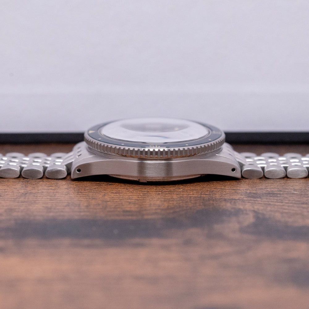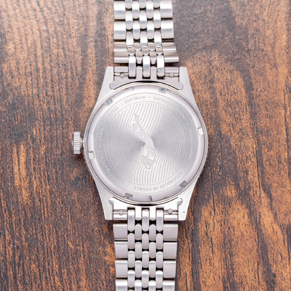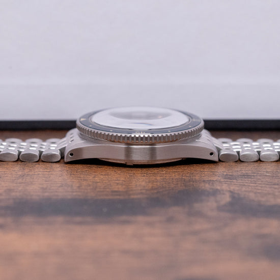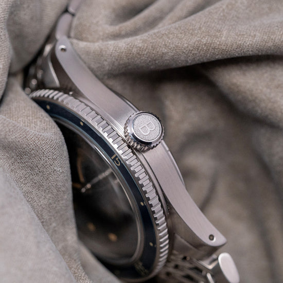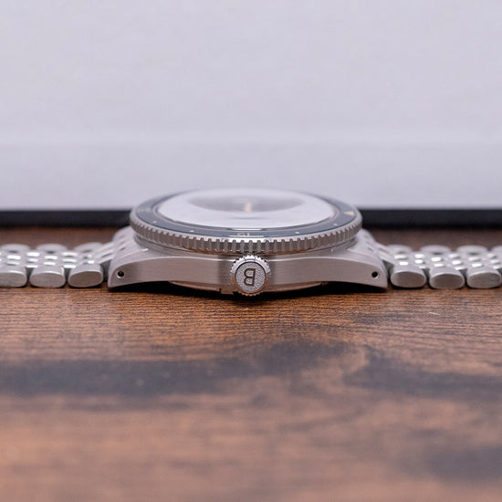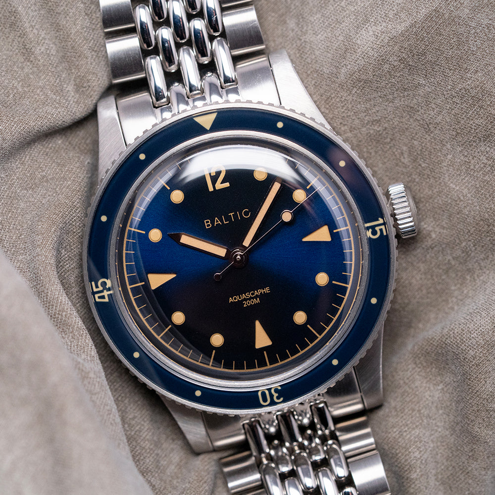 Here, we have a 2019 Baltic Aquascaphe Classic Blue Gilt on BOR ‘Beads Of Rice’ bracelet featuring a 39mm brushed stainless steel case and gently curved, tapered drilled lugs. A lug-to-lug length of 47mm and a thickness of 13mm give the watch an impressive wrist presence. On the right side is a signed coin-edged screw-down crown. The unidirectional 120-click stainless steel bezel has a blue sapphire insert with a Gilt 60-minute scale, which gives it the look of a vintage Bakelite bezel. A double-domed sapphire crystal sits above a sunburst blue sandwich dial. A Gilt outer minute track surrounds a cutout Arabic 12, followed by discs and arrow indexes that mark the hours showing through the layer of SuperLumiNova C1. Sword's hands are complemented by a lollipop centre seconds hand, all coated in the same SuperLumiNova C1. Text is precisely printed on the dial; at 12 o’clock, we have the Baltic motif and at 6 o’clock, “Aquascaphe 200M”. On the reverse, a screw-down case back with a wavy pattern and a diver engraved on it. Inside an automatic Miyota Cal. 9039, 24 jewels, 28,800 beats per hour. Introduced in 2018, it is part of the Miyota Premium range of movements. It has both hand-winding and hacking functionality. It is paired with its original, polished and brushed 20mm Baltic-signed “Beads of Rice” bracelet secured by a push-button signed Baltic deployant clasp. Comes with its Baltic presentation box and papers.