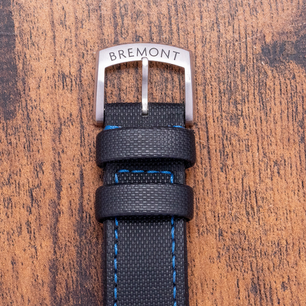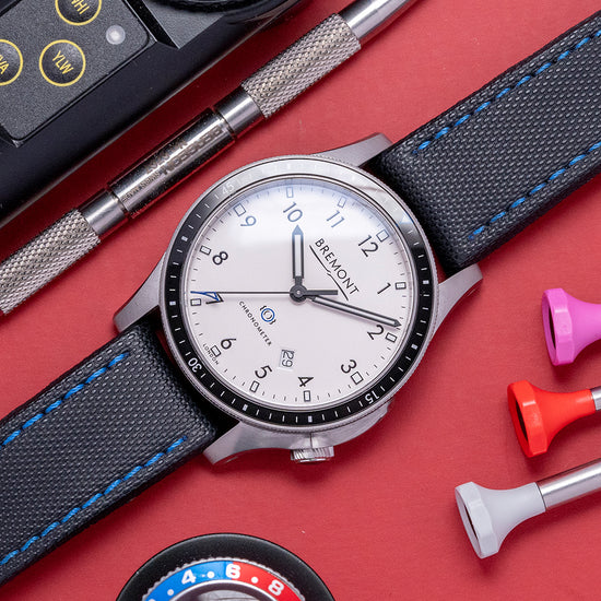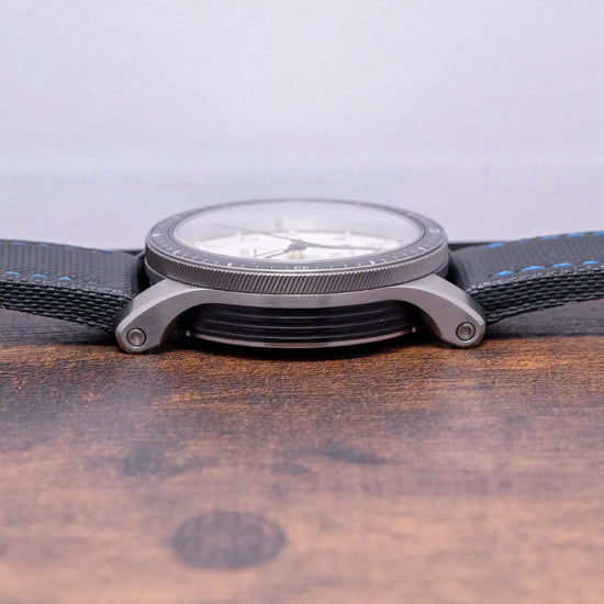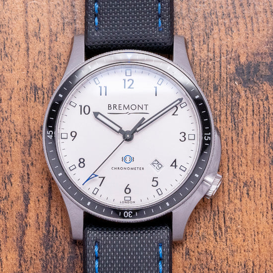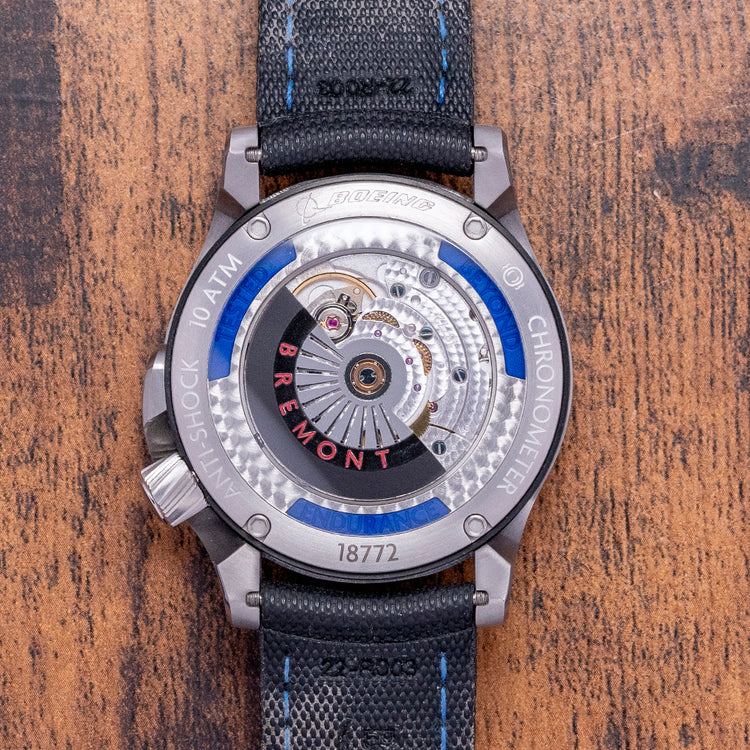 Bremont is one of those brands pushing the boundaries with design and quality; this watch is another great example of that! The 43mm case is made of Custom 465 Stainless Steel; developed for the Aviation industry, it is a super hard alloy created in a double vacuum, and its properties include scratch and corrosion resistance. This watch has the Trip-Tick shock absorber system around its centre. A lug-to-lug length of 52mm and a thickness of 14mm gives the watch an impressive wrist presence, and on the right side at 4 o’clock, a signed screw crown with a unique integrated crown guard mechanism protecting it. The thin bi-directional bezel has a 60-minute black sapphire insert. A sapphire crystal protects a crisp white dial. An outer minute track with lume plots surrounding Arabic numerals indices black marks the hours. Between the 4 and 5, you find a colour-matched date window. Slender sword hands complemented by a tapered second hand with a tip derived from the Boeing logo coated in luminescence. On the reverse, an exhibition case back with the Boeing motif showing off the automatic Bremont Cal. 13 1/4” BE-36AE a COSC Certified movement, 25 or 26 jewels, 28,800 beats per hour, based on either a Sellita or ETA movement. The stunningly decorated movement has a Boeing blue rubber anti-shock mount. The watch comes fitted on a 22mm Bremont Seattle black polymer strap with contrasting blue stitching, a signed buckle, and an additional unused strap in the box. This watch is sold with its original Bremont box, spring bar tool, and paperwork, including a signed Warranty card by Nick and Giles English.