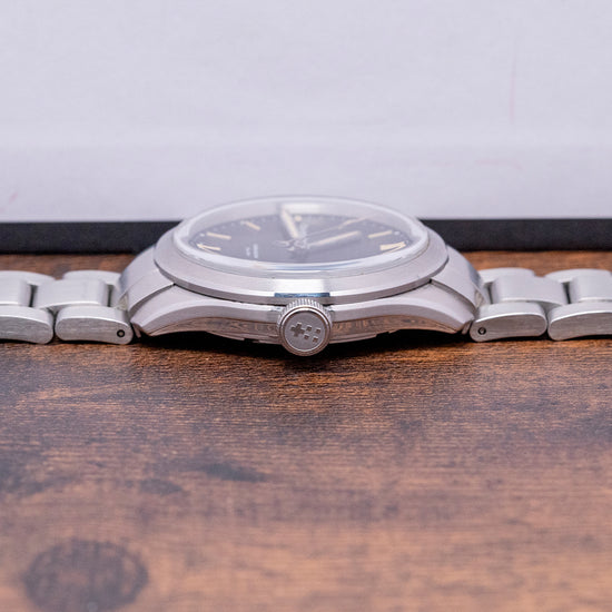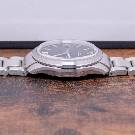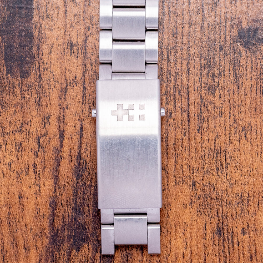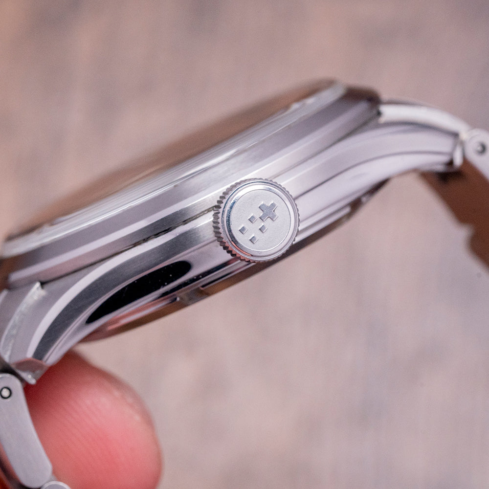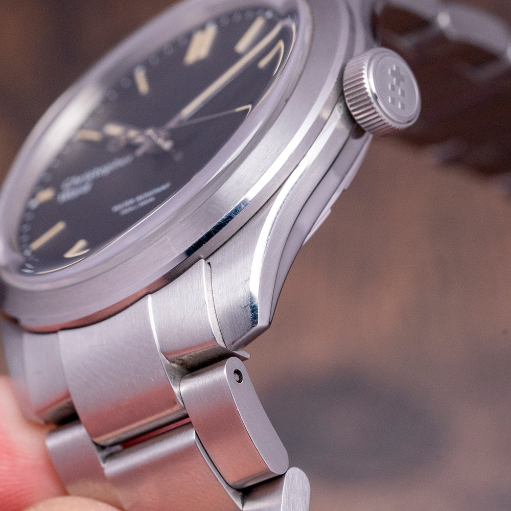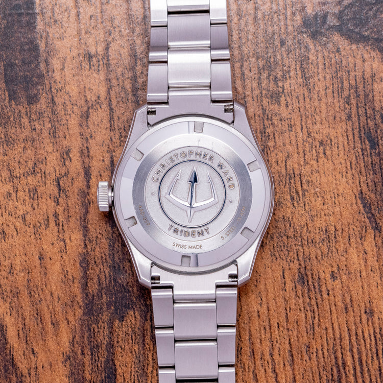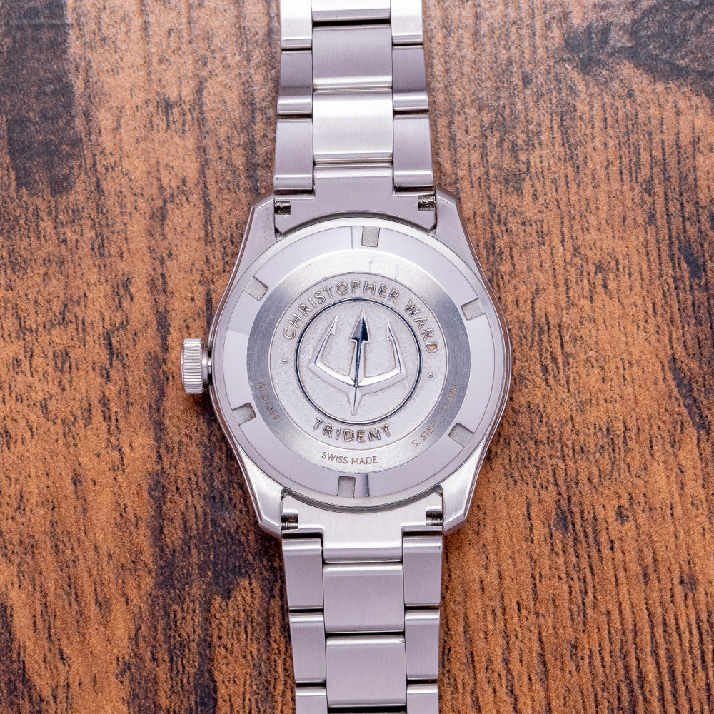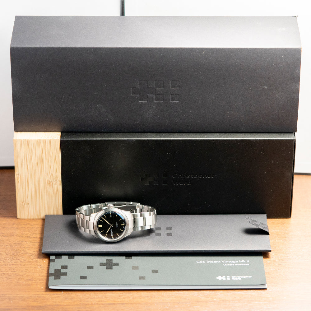 The divers of the past inspire our now discontinued 2019 Christopher Ward C65 Trident C65-38-A-SVKS. Its 38mm stainless steel case has brushed and polished surfaces that transition with crisp edges and tapered lugs, and a lug-to-lug length of 43.5mm and a thickness of 11.5mm ensure a comfortable fit on your wrist. On the right side, is a signed crown. A flat 4mm thick sapphire crystal sits above a matte black dial, applied baton indexes coated in Old Radium SuperLuminova, in keeping with the vintage appeal. At 3 o’clock, a colour-matched date window, baton hands covered with the same Old Radium SuperLuminova are complemented with a sweeping centre second, the distinctive Trident counterbalance completes the minimalist dial, and the text is contemporary and uncluttered. On the reverse, a screw-down case back with the Trident motif is embossed in the centre, inside an automatic Sellita SW-200-1, 26 jewels, 28,800 beats per hour, a robust and reliable movement. The watch comes paired with its original 20mm Christopher Ward stainless steel bracelet with a signed clasp; all links are provided. This watch is sold with its original Christopher Ward box and Christopher Ward booklet.