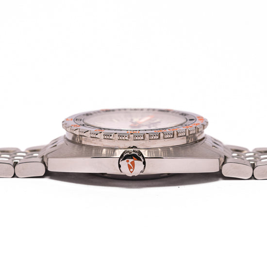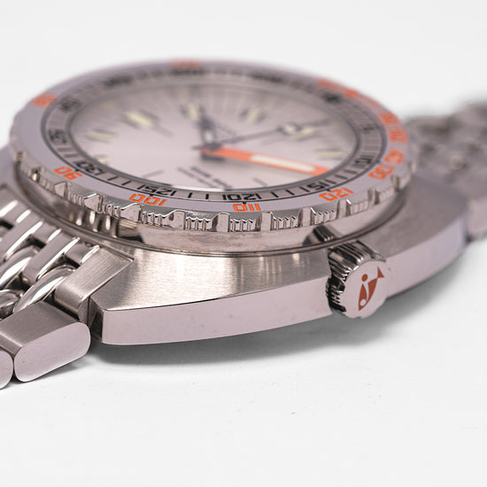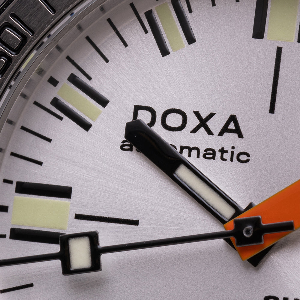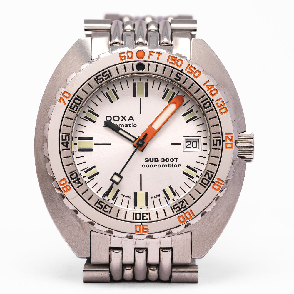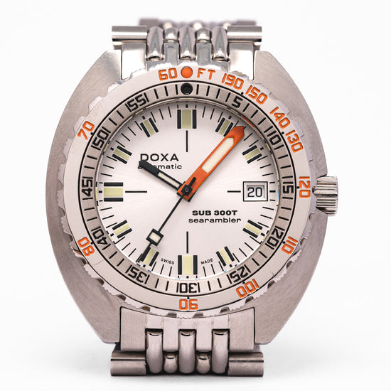 Here we have a 2019 Doxa SUB 300T Searambler 879.10.021.10 celebrating the 50th Anniversary release of the 1969 SUB 300T Conquistador which was the first publicly available dive watch with a Helium escape valve, this model is slightly different to the original due to the absence of the Helium escape valve. The 42.5mm C-shaped stainless steel case sits on the wrist like a cushion, this case was designed and developed by Urs Eschle who was the product manager for the original DOXA SUB, polished sides and brushed top surfaces transition with crisp edges towards the stubby lugs, and a lug-to-lug length of 45mm and a case thickness of 13.5mm gives the watch an impressive wrist presence. At 3 o’clock a screw-down crown that fits recessed into the side of the case for protection and is signed with an orange DOXA fish, the unidirectional bezel has the U.S. Navy No Decompression scales, with an outer depth scale in orange and the minute scale in black, to allow divers to gauge how much air was left in their tanks. The boxed sapphire crystal sits above the silver dial, and large double baton indexes with lume down their centres mark the hours. At 3 o’clock a framed date window, a small black hour hand with a larger orange minute hand is complemented by a black second hand with an orange square counterweight, this colour combination is highly visible when diving. A crosshair on the dial has text on the upper left side with “DOXA” and “automatic” printed, on the lower right side, “SUB 300” “Searambler ''. On the reverse, a screw-down case back with the DOXA motif in bas-relief in the centre, inside automatic ETA 2824-2, 25 jewels, 28,800 beats per hour. The watch comes fitted on a 20mm stainless steel “beads of rice” bracelet with brushed and polished finishing, secured with screws and has a push-button release folding signed clasp with a dive extension and the watch also comes with its Doxa presentation box, swing tag and papers.