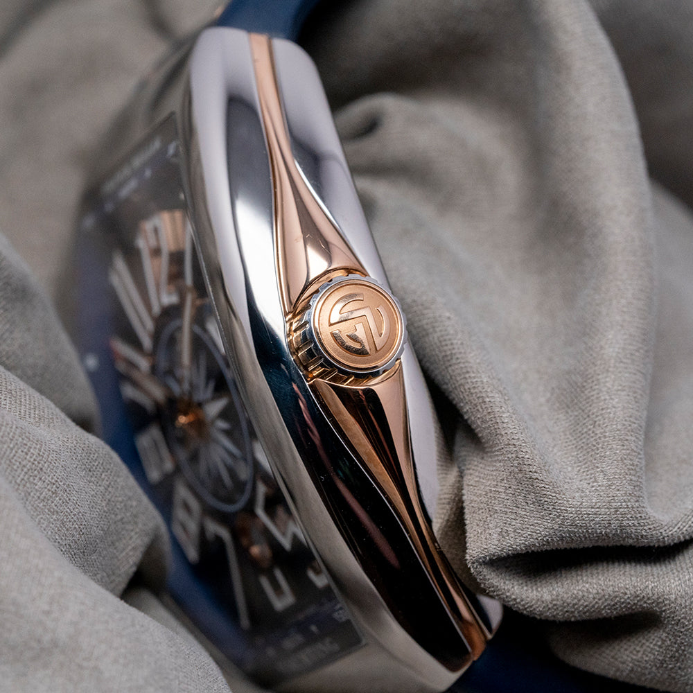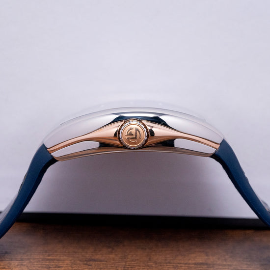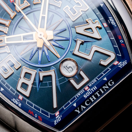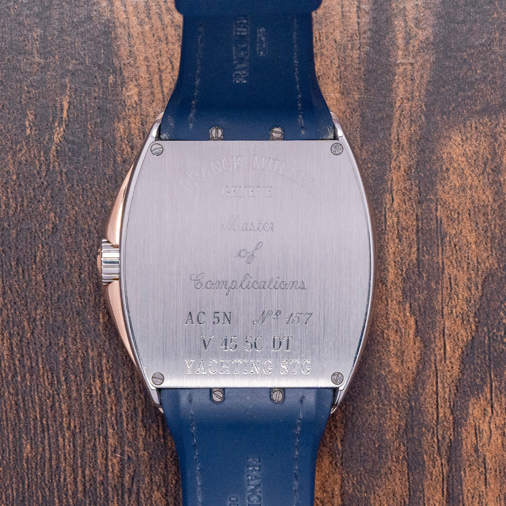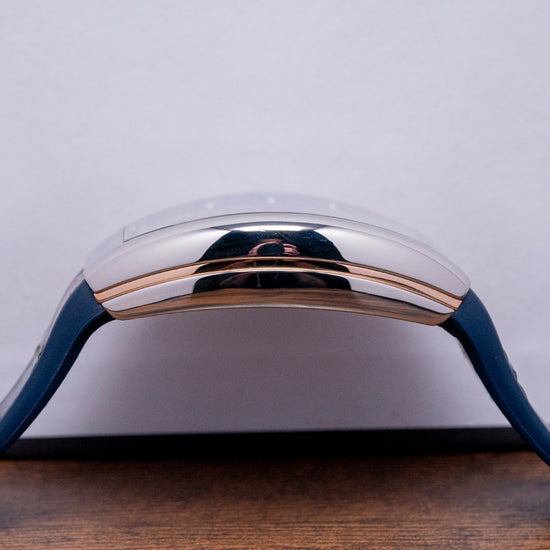 Here we have a 2019 Franck Muller Vanguard Yachting Automatic with a 44mm tonneau-shaped stainless steel and Rose Gold case. Its curvaceous flanks lead to a lug-to-lug length of 53mm and a case thickness of 12.5mm, giving the watch an impressive wrist presence. On the right side, a signed crown with knurling for grip is seated between Rose Gold crown guards. A domed sapphire crystal sits above a dynamic nautical-themed blue dial, complete with a beautifully executed multi-dimensional compass in the centre. An outer chapter ring has the compass points in white and red, and the minute track has red outlined pips surrounding exploding Arabic numerals outlined in Rose Gold and filled with lume marking the hours. At 6 o’clock, a Rose Gold date window, elegant Rose Gold hands are filled with lume and complemented by a red arrow pointed Rose gold second hand. We have the Franck Muller motif on the top edge, and on the bottom edge, “Yachting” completes this charismatic nautical watch. Inside an Automatic MVT FM 2536-SCDT, 25 jewels, beating at 28,800 beats per hour. It comes paired with a fitted 27mm blue fabric strap with orange stitching secured by a signed folding butterfly clasp. The watch comes with its Franck Muller presentation box and paperwork.