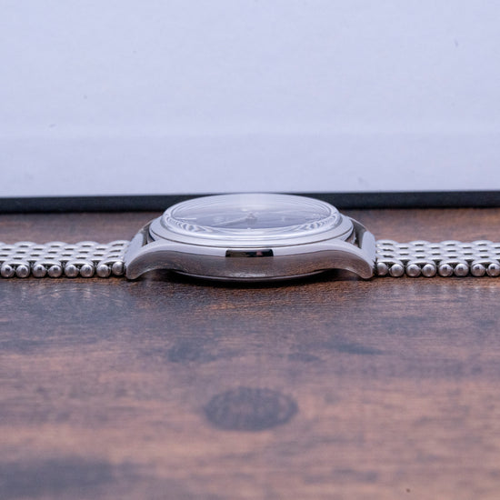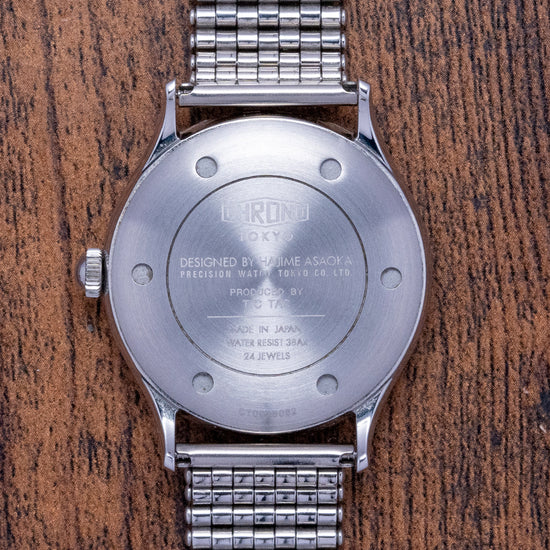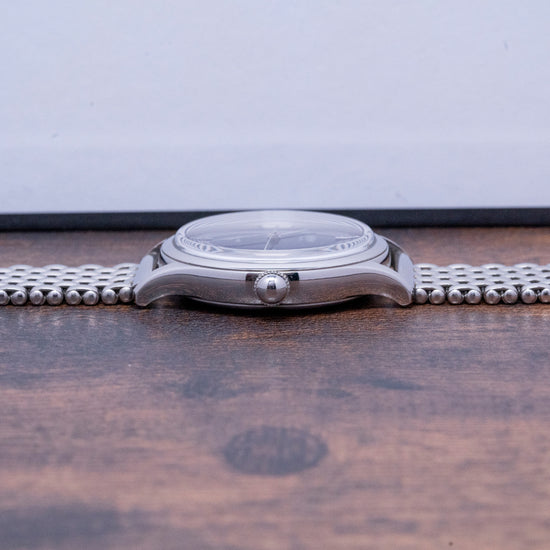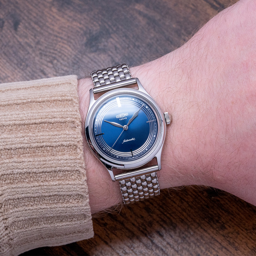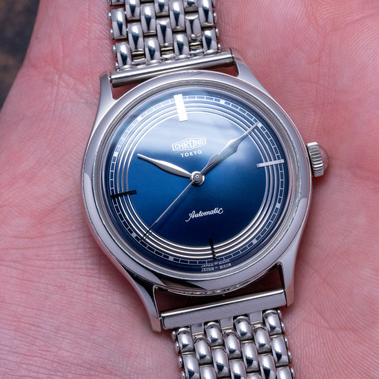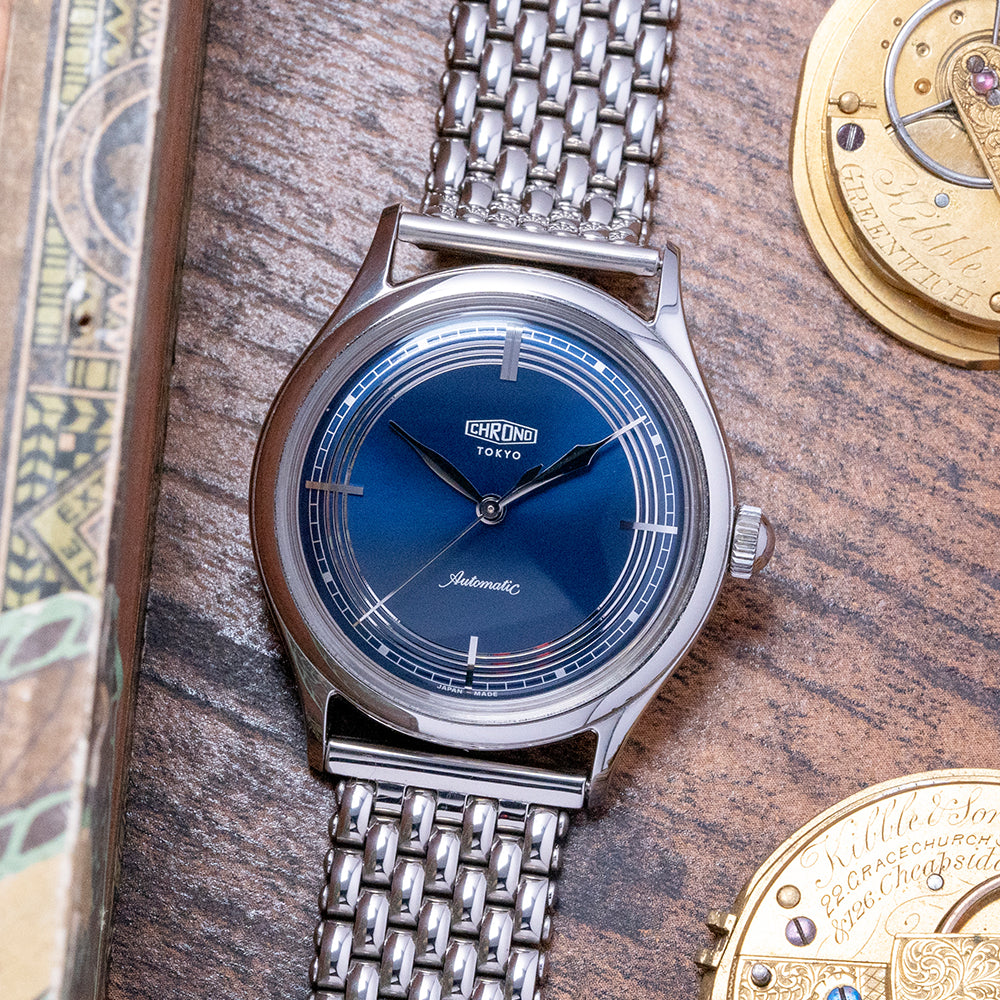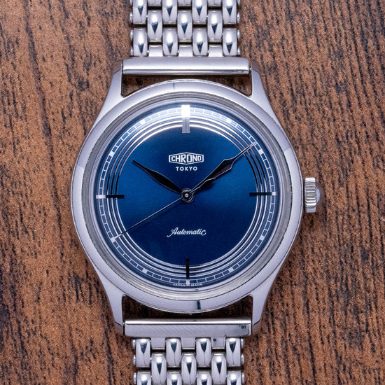 Here we have a rare 2019 Kurono Tokyo First Series Midnight Blue limited to 50 released in only a 10-minute window for ordering and immediately sold out, released as a first batch of 150 watches in 2019, 50 Mystic Grey, 50 Midnight Blue and 50 Eggshell White. Chrono Tokyo branding is the Japanese Domestic Market (JDM) release. The 37mm high-polished stainless steel case curves over your wrist with a lug-to-lug length of 43.5mm and a case thickness of 10.5mm ensuring a comfortable fit. Taking its design cues from the Art Deco timepieces of the past. On the right side is a domed crown, the polished smooth bezel holds a domed sapphire crystal giving the illusion of the plexiglass crystals of the past, a beautiful shade of metallic Midnight Blue with its radial sunburst. Under different lighting conditions, the dial shimmers in the light as you rotate your wrist. An outer minute track is precisely printed, three engraved concentric steel rings with four applied baton indexes catch the light in a mesmerising way. Sculpted brushed Kurono Tokyo hands complemented by a tapered teardrop balanced sweeping second hand finishing this elegantly understated vision of Japanese creativity and sensibility. The Chrono Tokyo brand motif is found at 12 o’clock with “Automatic” at 6 o’clock. On the reverse, a screw-down case back with the brand motif and details of the designer engraved into it, inside an automatic Miyota 90S5, 24 jewels, 28,800 beats per hour, this movement is part of the high-grade Miyota family with hand winding and hacking for your convenience. The watch comes paired with three aftermarket straps including a mesh style and two leather straps and also comes with its Chrono Tokyo presentation box and papers.