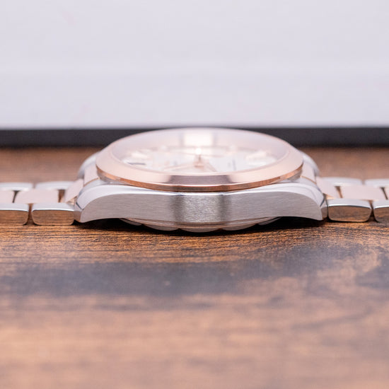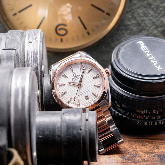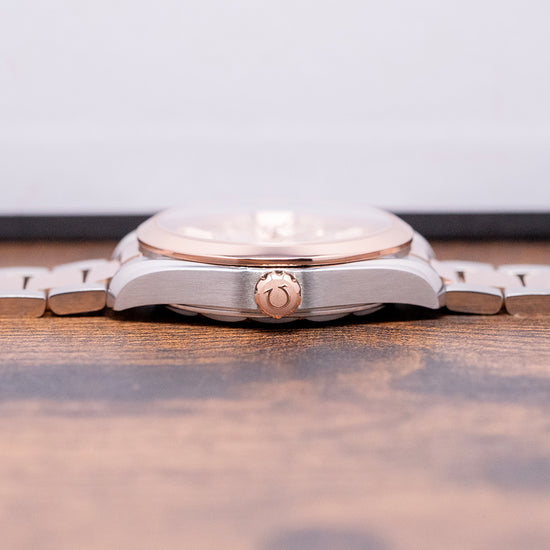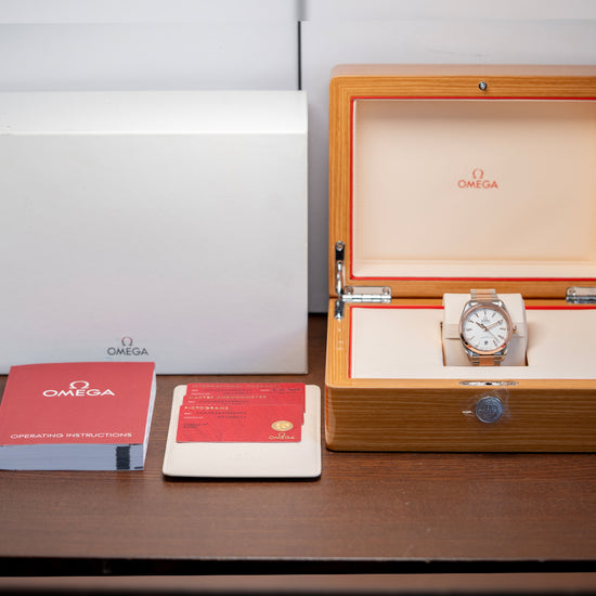 Here we have a 2019 Omega Seamaster Aqua Terra Silvery Dial Steel and 18K Sedna gold featuring a 38mm brushed and polished stainless steel symmetrical case, the case curves over your wrist with the characteristic twisted lugs, and a lug-to-lug length of 45mm and a case thickness of 12.5mm gives the watch an impressive wrist presence. The Aqua Terra family was launched in 2002, and in 2017, we saw this improved version launched at Baselworld. On the right side is a signed screw-down 18K Sedna gold crown that sits slightly recessed. The 18K Sedna gold smooth bezel holds a domed sapphire crystal AR coated on both sides above a silvery dial featuring the distinctive horizontal striped pattern inspired by the wooden decks of sailing boats. An outer minute chapter ring has small Arabic numerals with black numerals surrounding applied 18K Sedna gold arrow point indexes, which catch the light beautifully, filled in Super-LumiNova, marking the hours. At 6 o’clock, we have a date window. 18K Sedna gold Arrow hands filled with Super-LumiNova, complemented by an arrow pointed sweeping second hand. Text is precisely applied with the Omega motif "Seamaster'' at 12 o’clock and “Co-Axial Master Chronometer” at 6 o’clock. On the reverse is a screw-down exhibition sapphire case back, inside an automatic Omega Co-Axial Cal. 8800, , 35 jewels, 25,200 beats per hour, a Certified Master Chronometer, certified by the Swiss Federal Institute of Metrology (METAS), the watch goes through COSC certification before being selected for the eight tests run by METAS, this in-house movement features a bi-directional rotor which reduces winding time and a Co-Axial Escapement, two barrels in series for excellent stability and durability and a silicon balance spring providing the movement resistance to magnetic fields of over 15,000 Gauss, expertly decorated with Cotes de Geneve. It comes paired with its Omega 19mm Steel and Sedna gold 3-link bracelet secured by a concealed a push-button butterfly clasp clasp,; all links are provided and the watch comes with its Omega presentation box and papers.