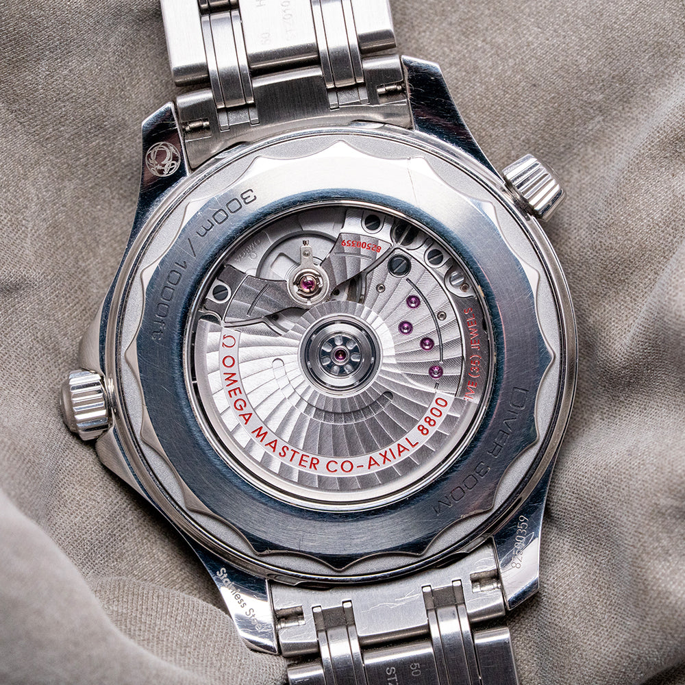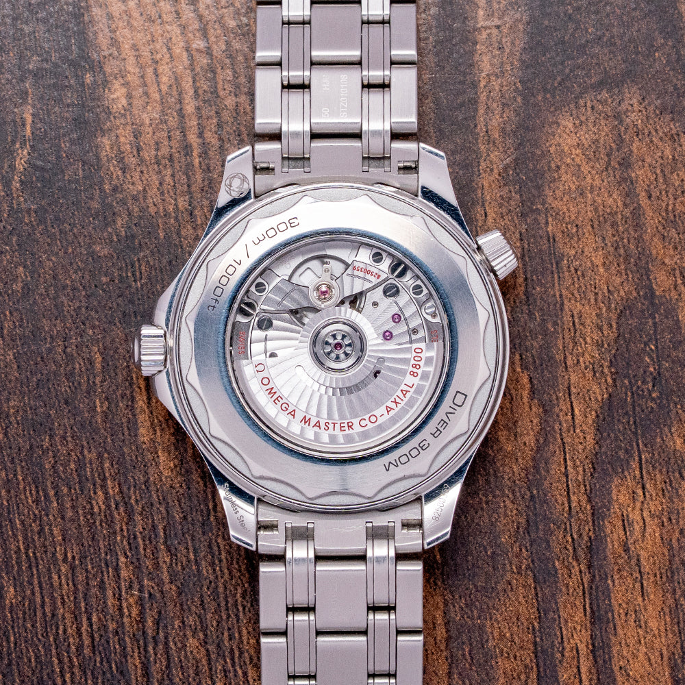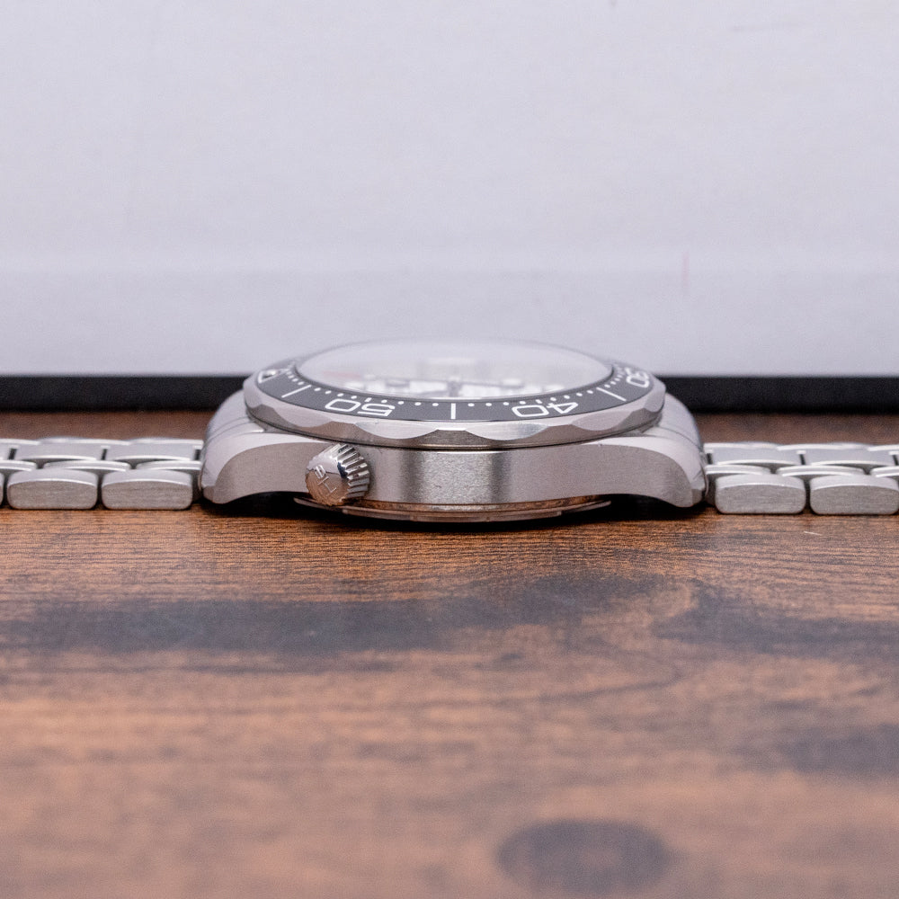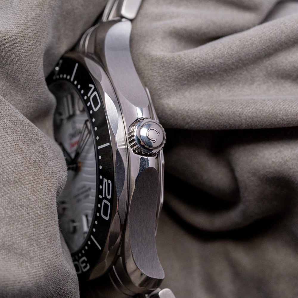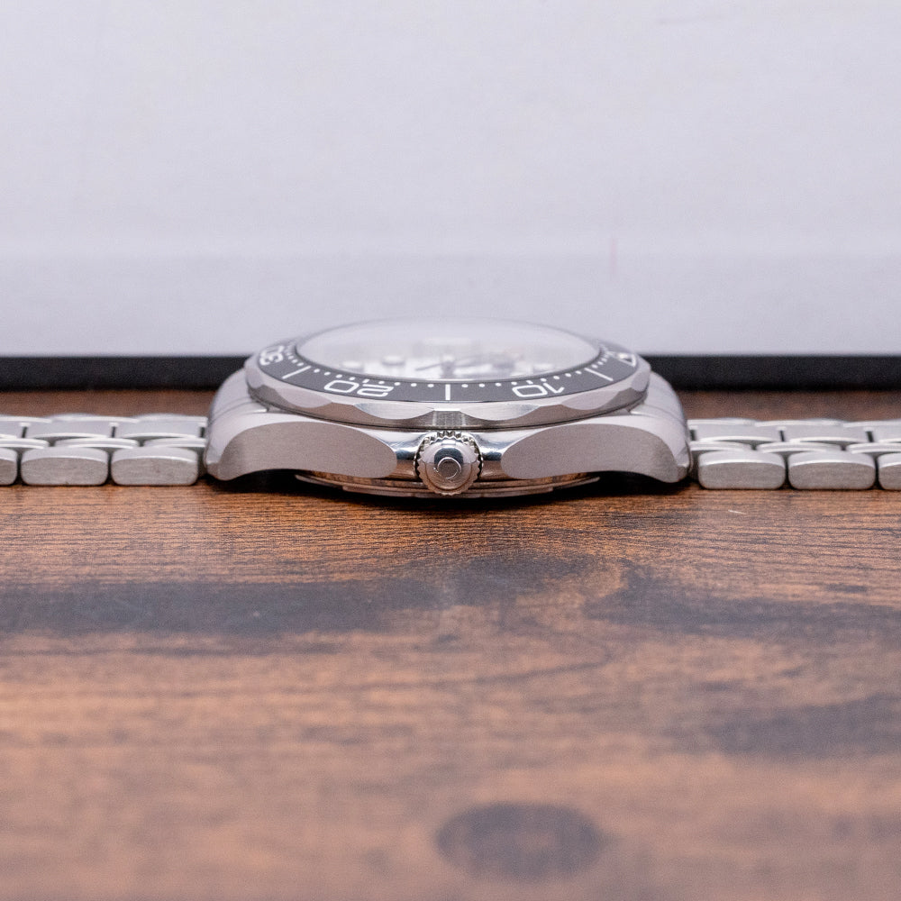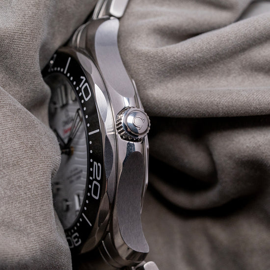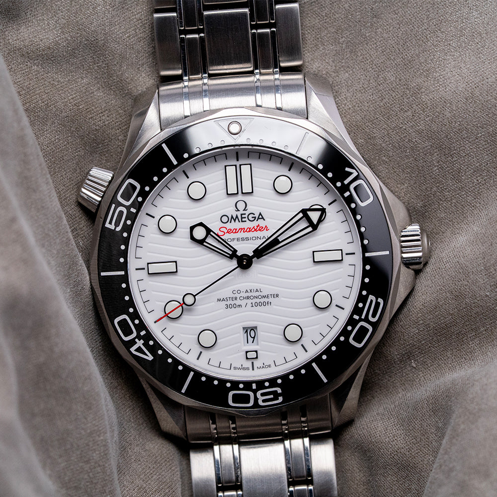 Here we have a 2019 Omega Seamaster Diver 300M White 210.30.42.20.04.001 with a 42mm polished and brushed stainless steel case that curves over your wrist with the characteristic twisted lugs associated with a modern Seamaster. Celebrating Omega’s maritime and dive heritage, in 1957, Omega introduced the 300 Seamaster series, created for the professional diver. A lug-to-lug length of 49.6mm and a case thickness of 13mm give the watch an impressive wrist presence, and at the 10 o’clock position a Manual helium escape valve, and on the right side is a signed screw-down crown protected by crown guards, the scalloped-edged black ceramic unidirectional bezel insert has white enamel dive minutes marked clearly, holding a domed AR-coated sapphire crystal above the dramatic polished white ceramic dial with a laser engraved wave pattern, applied baton and discs coated in Super LumiNova mark the hours. Skeletonised hands are rhodium-plated and tipped with Super LumiNova, making low-light visibility impressive. At the 6 o'clock position sits the colour matched date window, at 12 o’clock we have the Omega motif with “Seamaster Professional” printed underneath, and at 6 o’clock “, Co-Axial Master-Chronometer” 300m/1000ft completes this dynamic dive watch. On the reverse an exhibition sapphire case back with wave edging showcasing the automatic Omega Co-Axial Cal. 8800, 35 jewels, 25,200 beats per hour, a Certified Master Chronometer, approved by METAS, "Swiss National Metrology Institute", the watch goes through COSC certification before being selected for the eight tests run by METAS, this movement is resistant to magnetic fields. It has a silicon balance spring that winds in both directions, finished in Rhodium plating and decorated with Geneva waves. The watch comes fitted on its polished and brushed 20mm Omega stainless steel bracelet with a signed push button release folding clasp, all links provided, plus two aftermarket fitted rubber straps in the box, and the watch comes with its Omega presentation box, swing tag and papers.