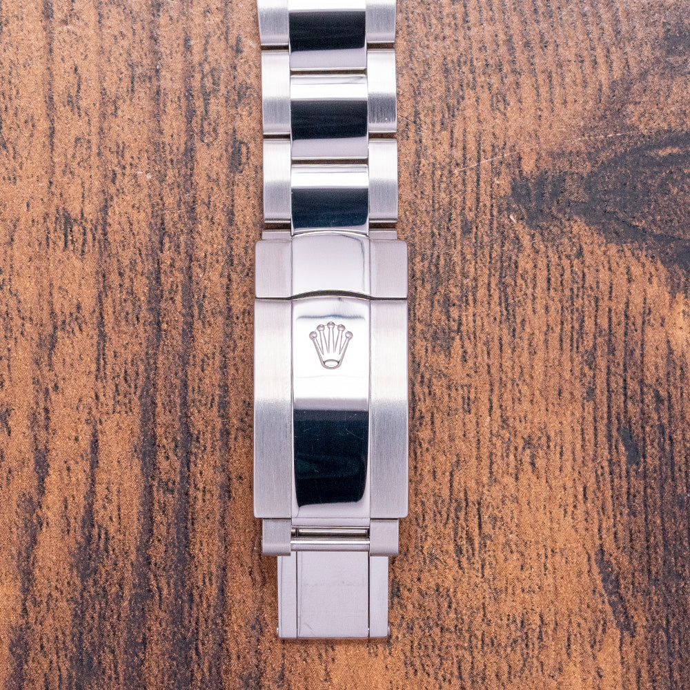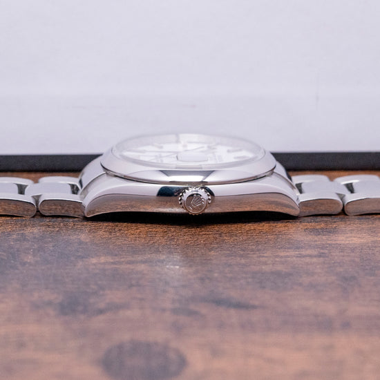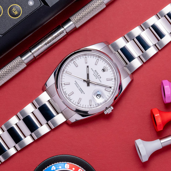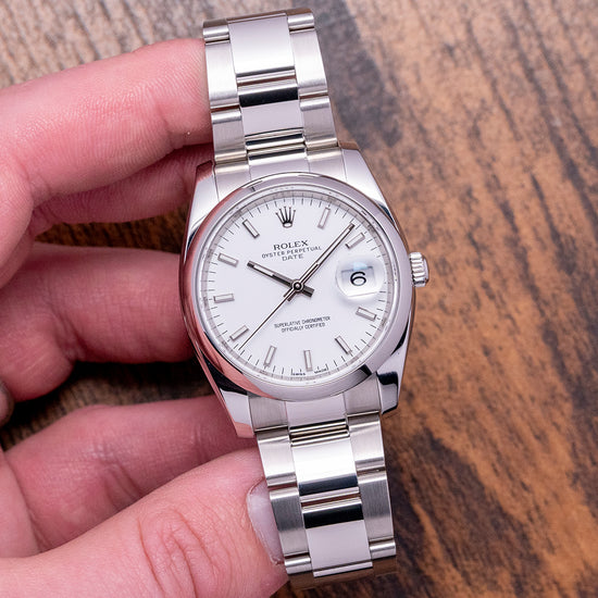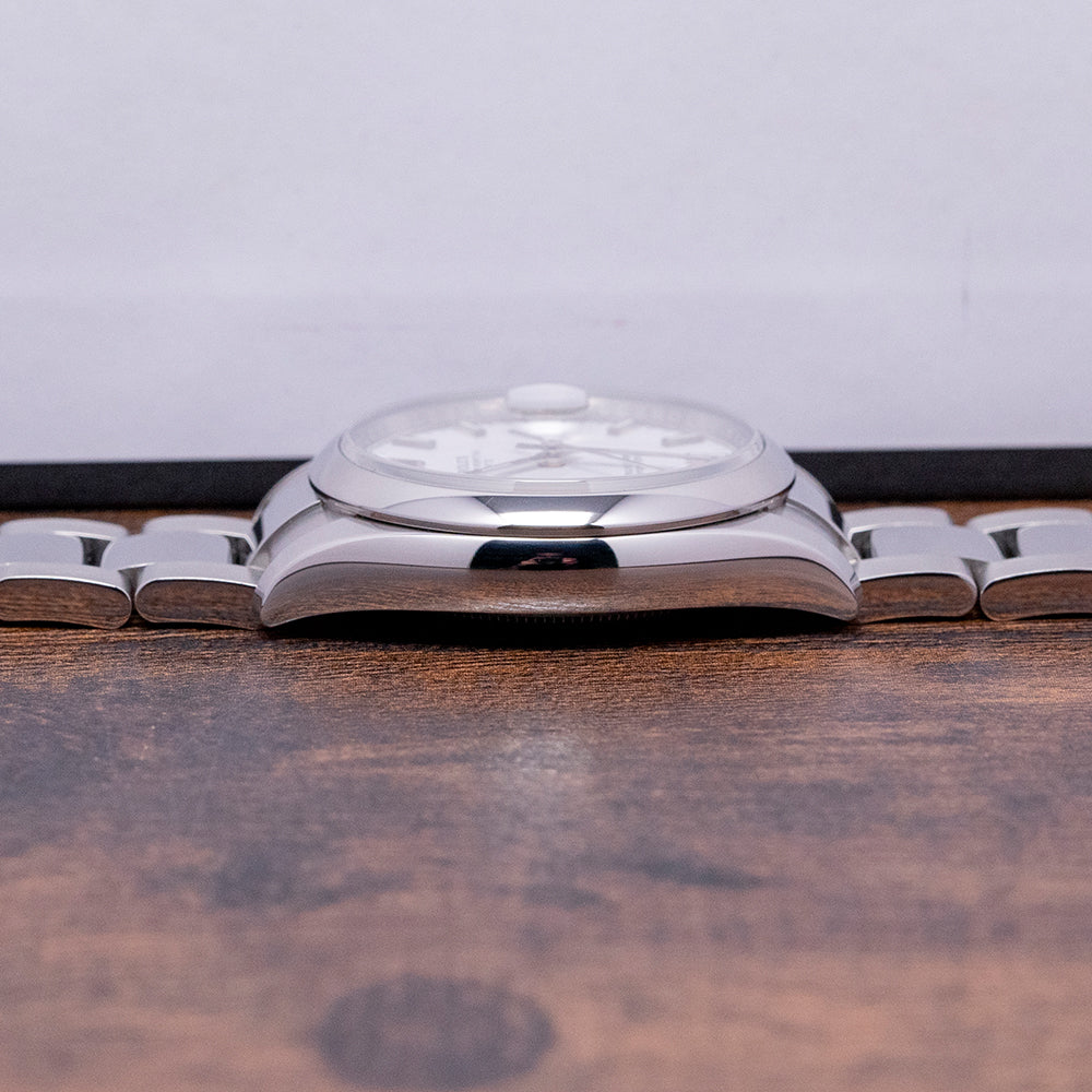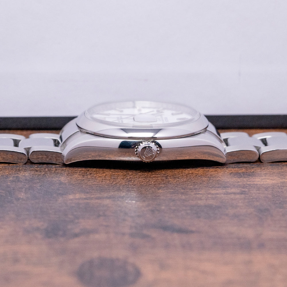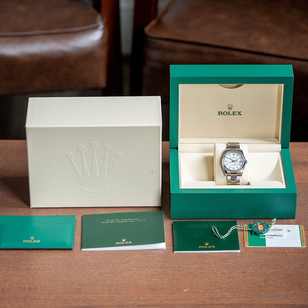Here we have a 2019 Rolex Oyster Perpetual Date White Dial 115200 with a 34mm 316L stainless steel Oyster case, polished and brushed surfaces transition with crisp edges, gently sloping lugs elegantly taper to a lug-to-lug length of 42.5mm and a case thickness of 11.5mm, ensuring a comfortable fit on your wrist. On the right side, there is a signed screw-down crown. A bevelled polished bezel holds a flat scratch-resistant sapphire crystal above a striking crisp white dial, and a Rolex rehaut surrounds applied baton indexes filled with Chromalight lume marking the hours. At 3 o’clock, a cyclops magnification above the date window. Elegant baton hands have Chromalight infill complimented with a tapered sweeping seconds hand. At 12 o’clock, we have the Rolex Coronet motif “Rolex Oyster Perpetual Date” printed underneath and at 6 o’clock “Superlative Chronometer Officially Certified”. On the reverse, a coin-edged screw-down case back, inside an automatic Rolex calibre 3135, 31 jewels, 28,800 beats per hour, is fitted with a Parachrom hairspring, making it much more resistant to shocks and temperature variations. The watch comes paired with its original 19mm Rolex Oyster stainless steel bracelet secured by a Rolex-signed OysterClasp; all links are provided. It is sold with its original Rolex presentation box, original Rolex papers, and swing tags.