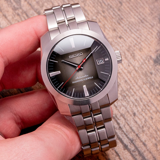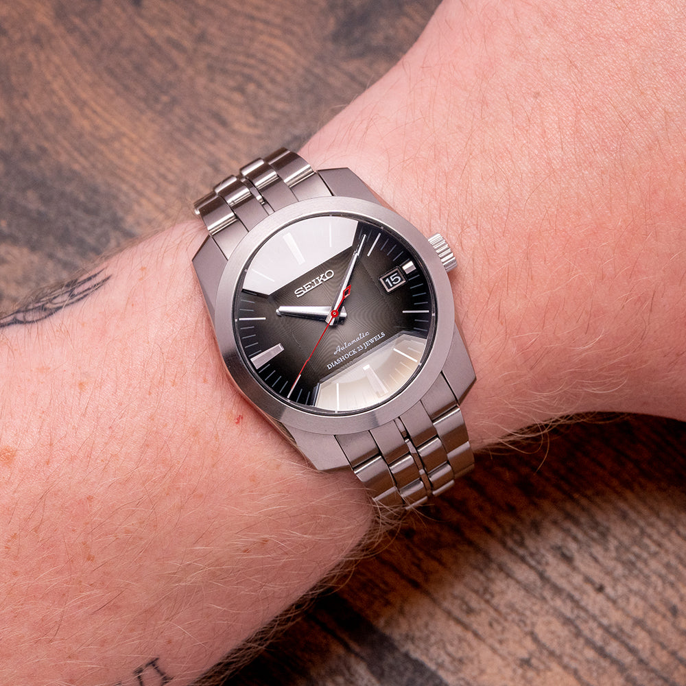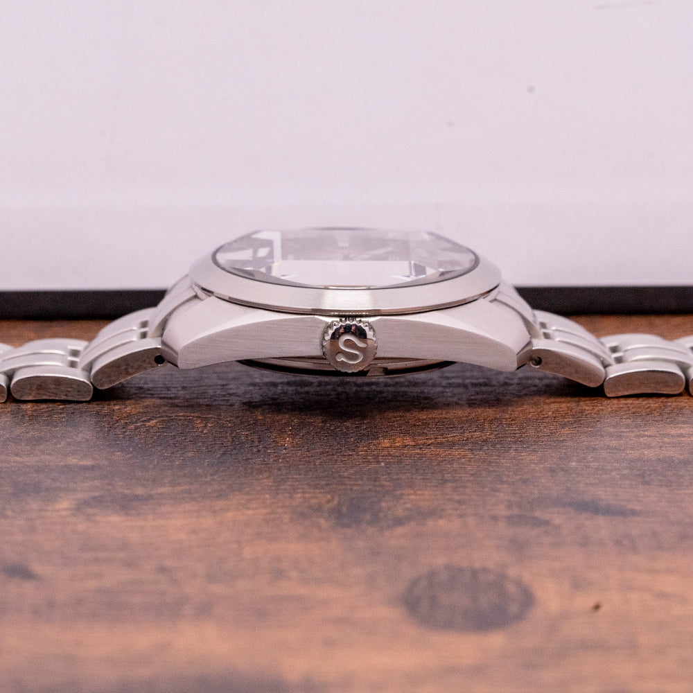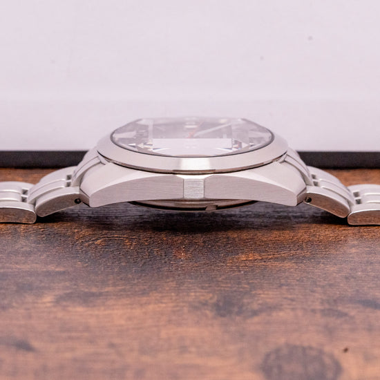 Here we have a stylish classic 2019 Seiko SARB003 Smoke Grey Dial Faceted Crystal introduced in 2006, it brings back a funky angular design seen in their 1970s Seiko Vanac series with a modern twist. The polished and brushed 38.5mm stainless steel case curves over your wrist with thick, flat-ended lugs, and a polished bevel edge leads to a lug-to-lug length of 44.5mm and a case thickness of 13mm, ensuring a comfortable fit. On the right side is a coin-edged crown. A smooth bezel holds a multi-faceted sapphire crystal above a smoke grey fumé dial with a concentric circular pattern; as you rotate your wrist, the crystal magically plays with the light. An outer minute track has applied fine baton and thick chamfer-edged indexes coated in Lumibrite marking the hours; at 3 o’clock, a framed colour-matched date window and elegant steel hands with a line of Lumibrite are complemented by a red diamond counterweighted tapered sweeping second-hand, at 12 o’clock we have the applied Seiko motif and at 6 o’clock “Automatic Diashock 23 Jewels” completes this striking vintage-inspired dress watch. On the reverse a screw-down exhibition case back showcasing the automatic Seiko 6R15, 23 jewels, beating at 21,600 beats per hour, with hand winding and hacking seconds for your convenience. The watch comes paired with its 20mm Seiko brushed and polished multi-link stainless steel bracelet with a signed push-button clasp and will fit up to a 7-inch wrist, and the watch comes with its Seiko presentation box and paperwork.