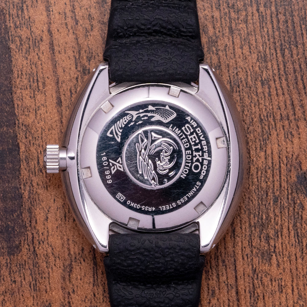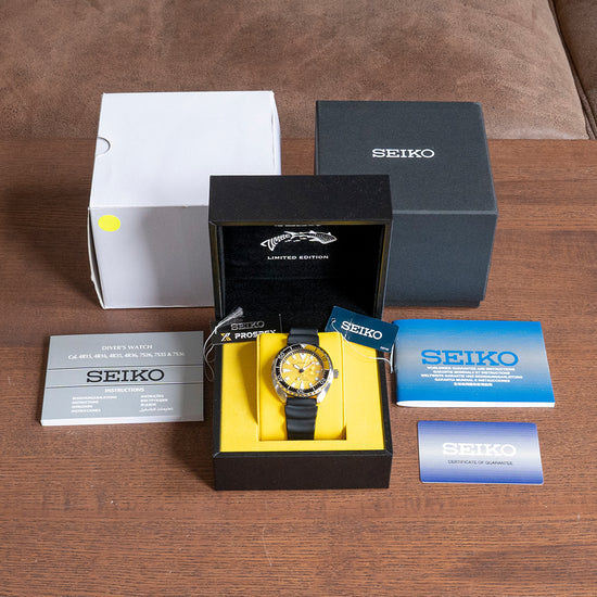 Here we have a 2019 Seiko Zimbe Mini Turtle Thailand SRPD19 Limited Edition of 999 pieces exclusive to the Thailand market, the word Zimbe "Jinbe Zame" in Japanese means whale shark. A 42mm stainless steel “C” shaped cushion case has a short lug-to-lug of 42.5mm and a thickness of 12.5mm ensuring a comfortable fit, Seiko gets wrist ergonomics so right. At 3 o’clock a large screw-down crown, the case has brushed tops and polished sides that transition with crisp flowing lines. The stainless steel bezel has a black and yellow dive insert, with black numerals marking the first 15 minutes, and the outer edge has deep knurling making it much easier to grip. A flat Hardlex crystal has a cyclops magnification above the date window at 3 o’clock. The bright yellow dial is textured with a delicate repeating flower that adds a real quality boost over a standard Turtle, applied rounded batons and trapezoid indexes are coated in LumiBrite marking the hours. A broad sword hand and a bright red arrow minute hand are coated in LumiBrite with a lollipop counterbalance centre seconds hand. The text is precisely printed in black with “Seiko” at 12 o’clock, at 6 o’clock the Prospex logo, “Automatic Divers 200m”. On the reverse, a screw-down case back with an embossed Seiko Tsunami in the centre, inside an automatic Seiko Cal. 4R35, 23 jewels, 21,600 beats per hour, a powerhouse of movement was first introduced in 2011. The watch comes fitted on a Seiko 20mm rubber strap with a signed buckle and also comes with its Seiko presentation box and papers.