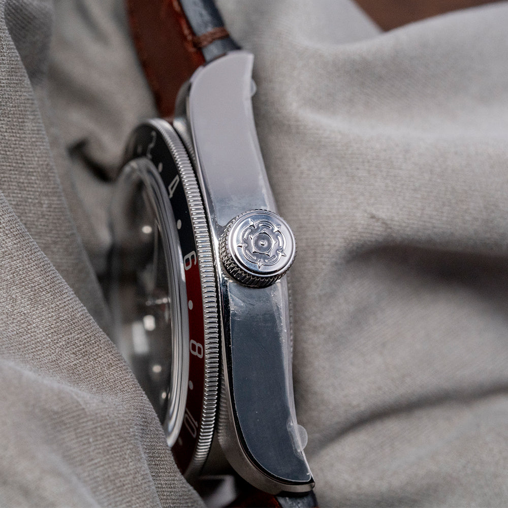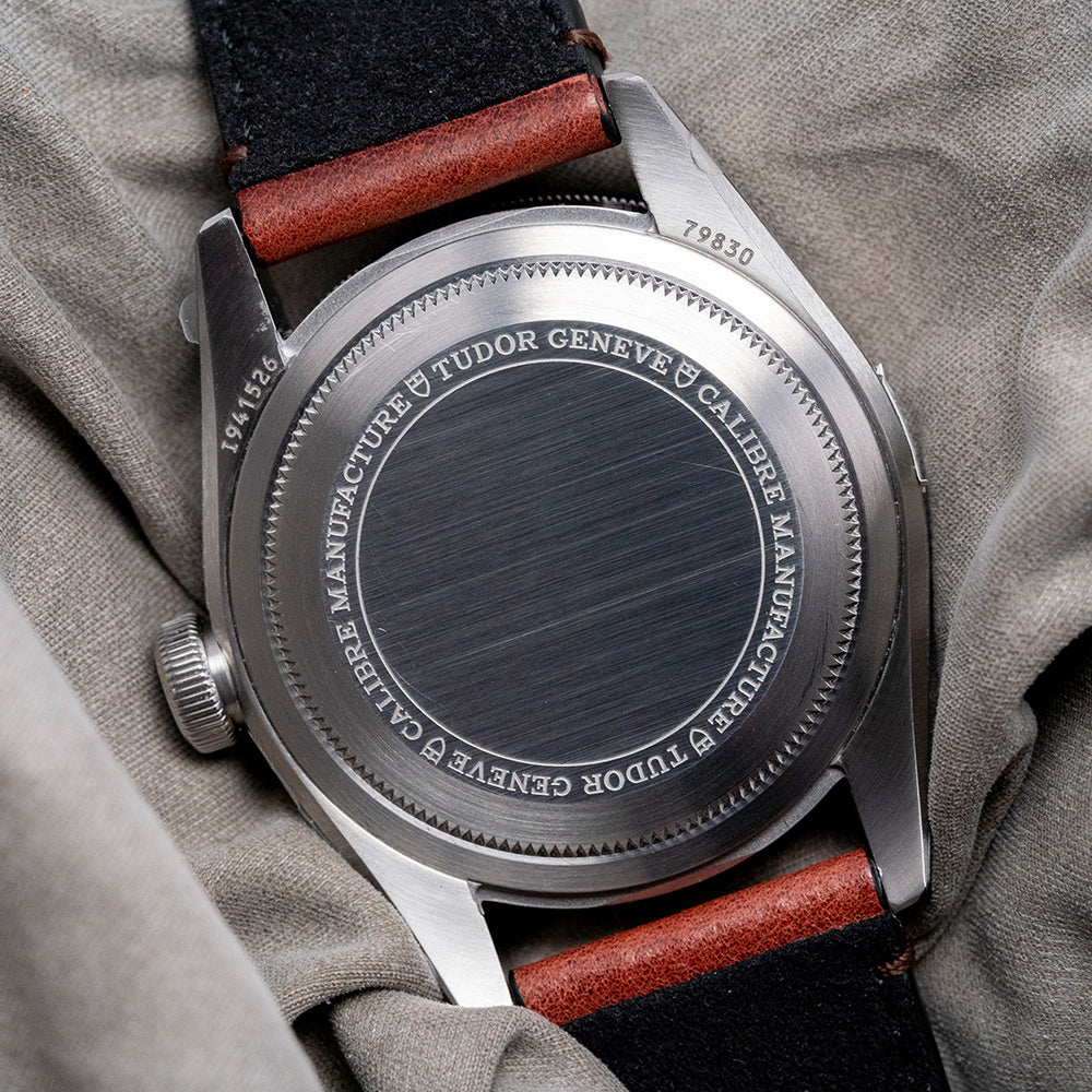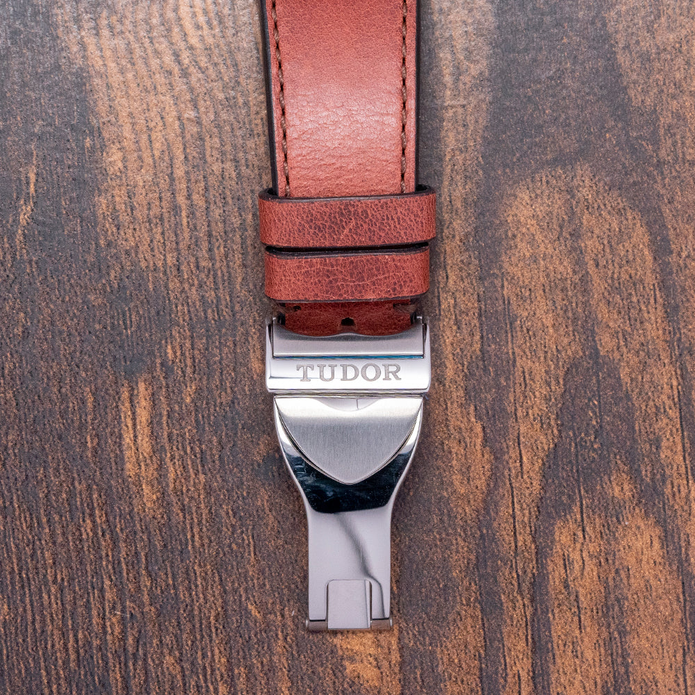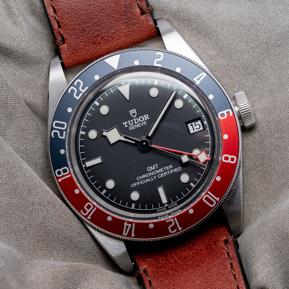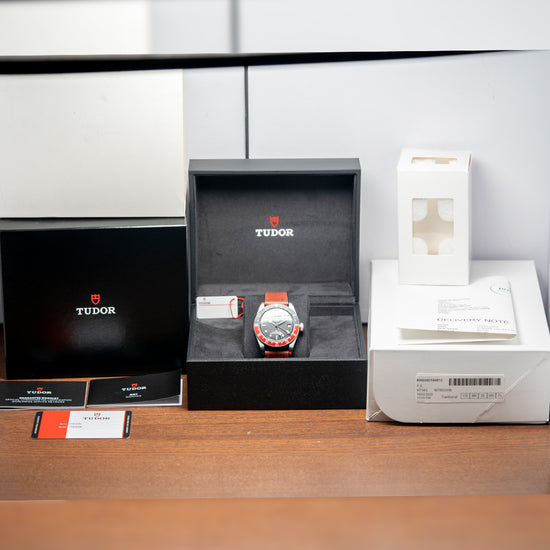 Introduced in Baselworld 2018, it has gained much fanfare, featuring all the attributes of their dive watches with the addition of a GMT function, making it a perfect companion for the travelling explorer. Here we have a 2019 Stickered Tudor Black Bay GMT on Strap 79830RB with a 41mm stainless steel case that is polished and satin-finished; its curvaceous flanks have a polished chamfered edge leading to a lug-to-lug length of 51mm and a case thickness of 15mm giving the watch an impressive wrist presence. A bidirectional Pepsi bezel with a 24-hour scale. A large screw-down crown makes adjustment a breeze. The domed sapphire crystal protects a matt black dial with an outer minute track. Applied disc and baton indexes are filled with lume; at 12 o’clock, we have the characteristic inverted triangle. Snowflake hands are complimented with a GMT hand with a red stem and white head for excellent visibility. The Tudor motif is at 12 o’clock, and the “GMT Chronometer Officially Certified” at 6 o’clock completes this versatile traveller companion. Inside, we have the automatic Tudor MT5652, in-house COSC Certified 28 jewels, 28,800 beats per hour. It incorporates the jumping hour functionality of the GMT with the ability to adjust in 1-hour increments in both directions. It comes paired with its original 22mm Tudor leather strap with a signed deployant clasp. The watch also comes with its original Tudor presentation box, Rolex service box, swing tag, Tudor paperwork, and Rolex Service paperwork.