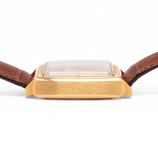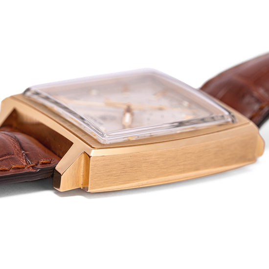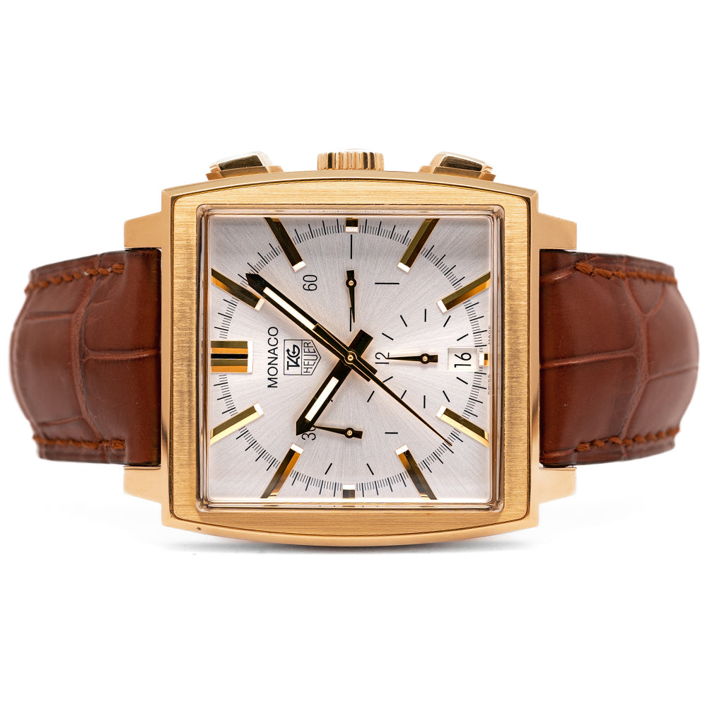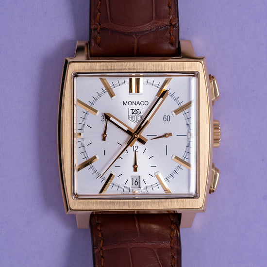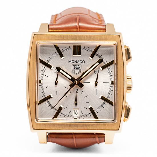 Monaco was made famous by Steve McQueen in the film Le Mans in 1971 and since then, this has been an absolute icon and rightly so! Love or hate TAG; respect for Monaco is universal within the watch world! Here we have a TAG Heuer Monaco CW5140, this reference was in production between 2002/2003, with a 38.5mm square 18ct Yellow Gold case, stubby lugs with a lug-to-lug length of 46.5mm and a case thickness of 12.5mm giving the watch an impressive wrist presence. Polished and fine brushed surfaces transition with crisp edges. On the right side, we have the two-stepped square chronograph pushers and in the centre a signed crown. The bevel-edged plexiglass crystal sits above the striking sunburst silver dial. An outer minute track with long applied baton indexes marks the hours, at 3 o'clock a continuous seconds, at 6 o’clock a 12-hour register and finally at 9 o’clock a 30-minute register, sword hands with luminescence infill complemented by a tapered chronograph hand. At 6 o’clock a date window perfectly balances this striking chronograph watch. At 12 o’clock we have “Monaco” and the TAG Heuer motif. On the reverse, a screwed-down case back with deep engraving and 18ct hallmarks. Inside a COSC Certified Automatic Cal. 17 movement, 37 jewels, beating at 28,800 beats per hour, has a base of the ETA 2894-2 movement with a chronograph module, decorated in Cotes de Geneve. The watch comes fitted on a TAG Heuer 22mm leather strap with an 18ct Yellow Gold buckle, the watch also comes with its TAG Heuer presentation box and receipt, the watch was sold in 2019 by a TAG Heuer Boutique as "New Old Stock".