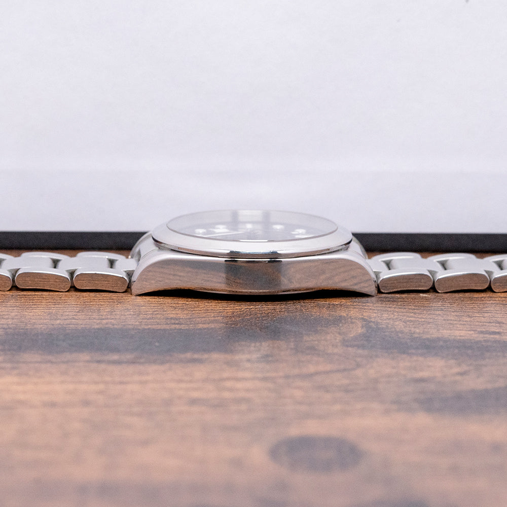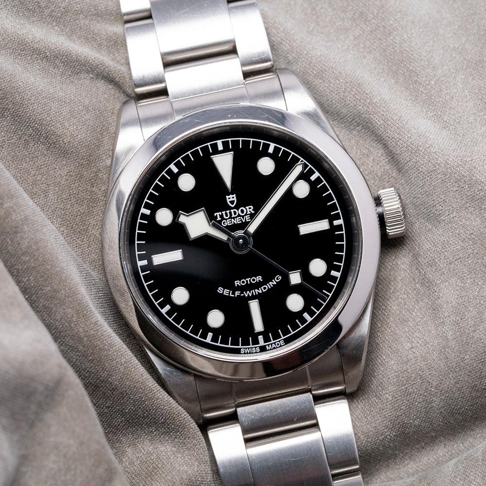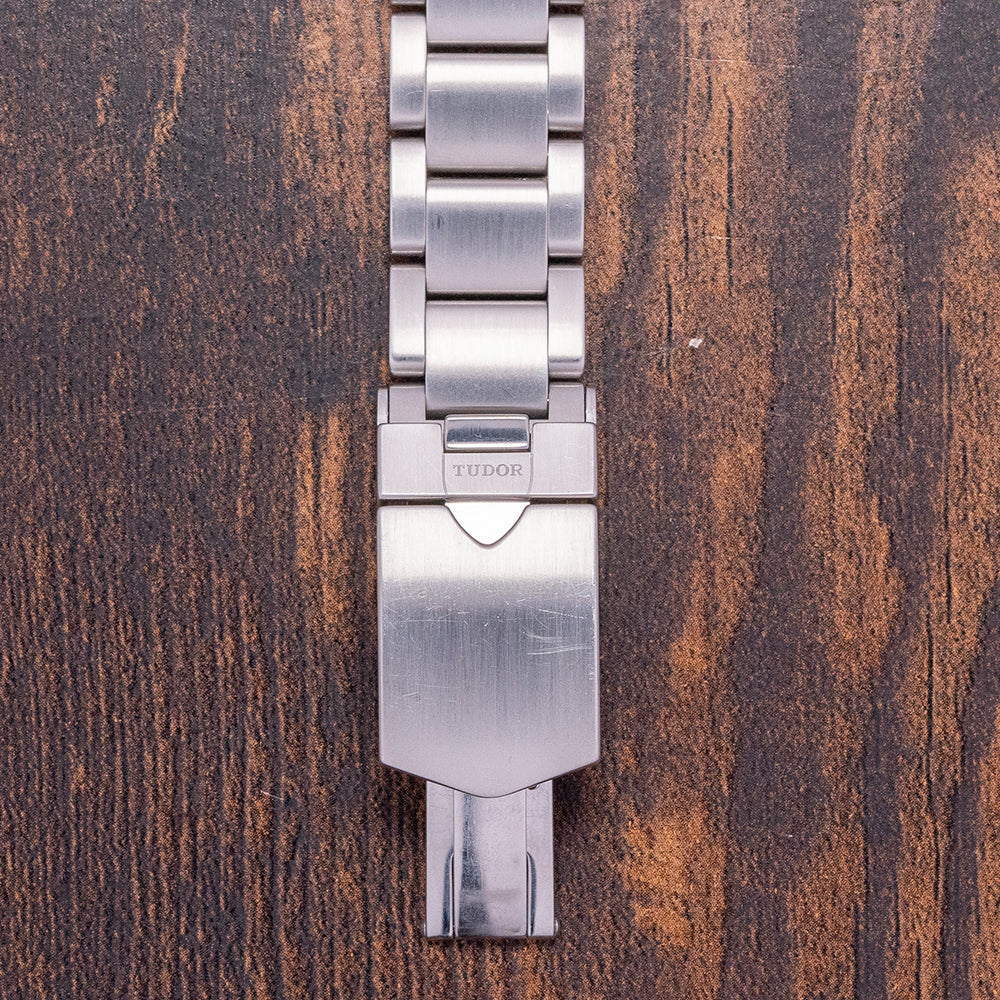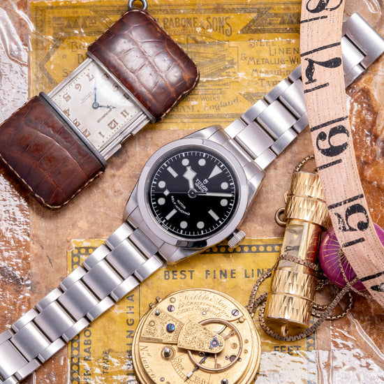 The Tudor Black Bay was launched in 2012, our 2019 Tudor Black Bay 36 Black on Bracelet 79500 has a 36mm polished and satin-brushed stainless steel case, the case curves over your wrist with a lug-to-lug length of 44mm and a case thickness of 10mm, giving the watch a comfortable fit and profile. A fine, polished, chamfered edge leads the eye along the curves of the case. On the right side is a signed screw-down crown with a black anodised tube. A smooth, polished bezel holds a sapphire crystal above the black dial, an outer minute track with applied disc and baton indexes marks the hours, and at 12 o’clock, an inverted triangle, all are coated in SuperLumiNova. The characteristic Snowflake hands are coated in luminescence and complemented by a tapered, sweeping second hand. The text is precisely applied to the dial, featuring a smiley “Rotor Self-Winding” at 6 o’clock, indicating an ETA movement inside. On the reverse, a coin-edged screw-down case back, inside an automatic Tudor Cal. T600 is based on the ETA 2824-2, 25 jewels, 28,800 beats per hour. The watch comes fitted with its original 19mm brushed stainless steel 3-link bracelet with a signed folding deployant clasp and flip lock. This watch is sold with its original Tudor box, swing tag and paperwork.