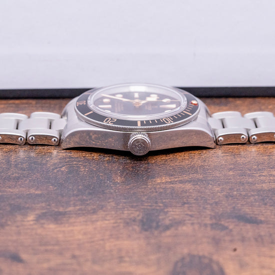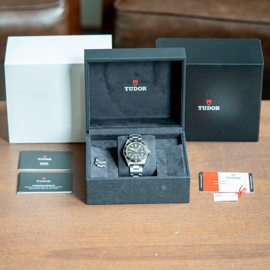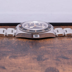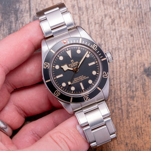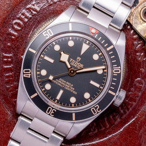Our 2019 Tudor Black Bay 58 Black on a Bracelet 79030N pays tribute to their first divers. Introduced in 1958, the Ref 7924 had a 39mm case and a big crown that achieved 200m water resistance, which was some achievement back then. A 39mm stainless steel case with polished and satin finishes, the curve of the case tapers towards the lugs with a lug-to-lug length of 47.5mm and a case thickness of 12mm, giving the watch an impressive wrist presence. On the right side is a screw-down signed crown. Unidirectional dive bezel with 60 min numerals on a matte black anodised Aluminium insert at 12 o’clock; we have the red inverted triangle and lume pip. Domed sapphire crystal AR coated protects a matte black dial; applied pips and baton hour markers are coated in Super LumiNova, and Snowflake hands are coated in SuperLumiNova. On the reverse, a coin-edged screw-down case back, inside, we have their in-house automatic Calibre MT5402, 25 jewels, 28,800 beats per hour and a Bidirectional rotor system that provides a very impressive power reserve. The watch comes fitted on a 20mm Tudor stainless steel bracelet with a signed folding clasp, and the watch comes with its Tudor presentation box and papers.