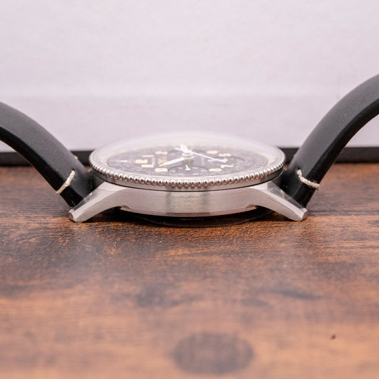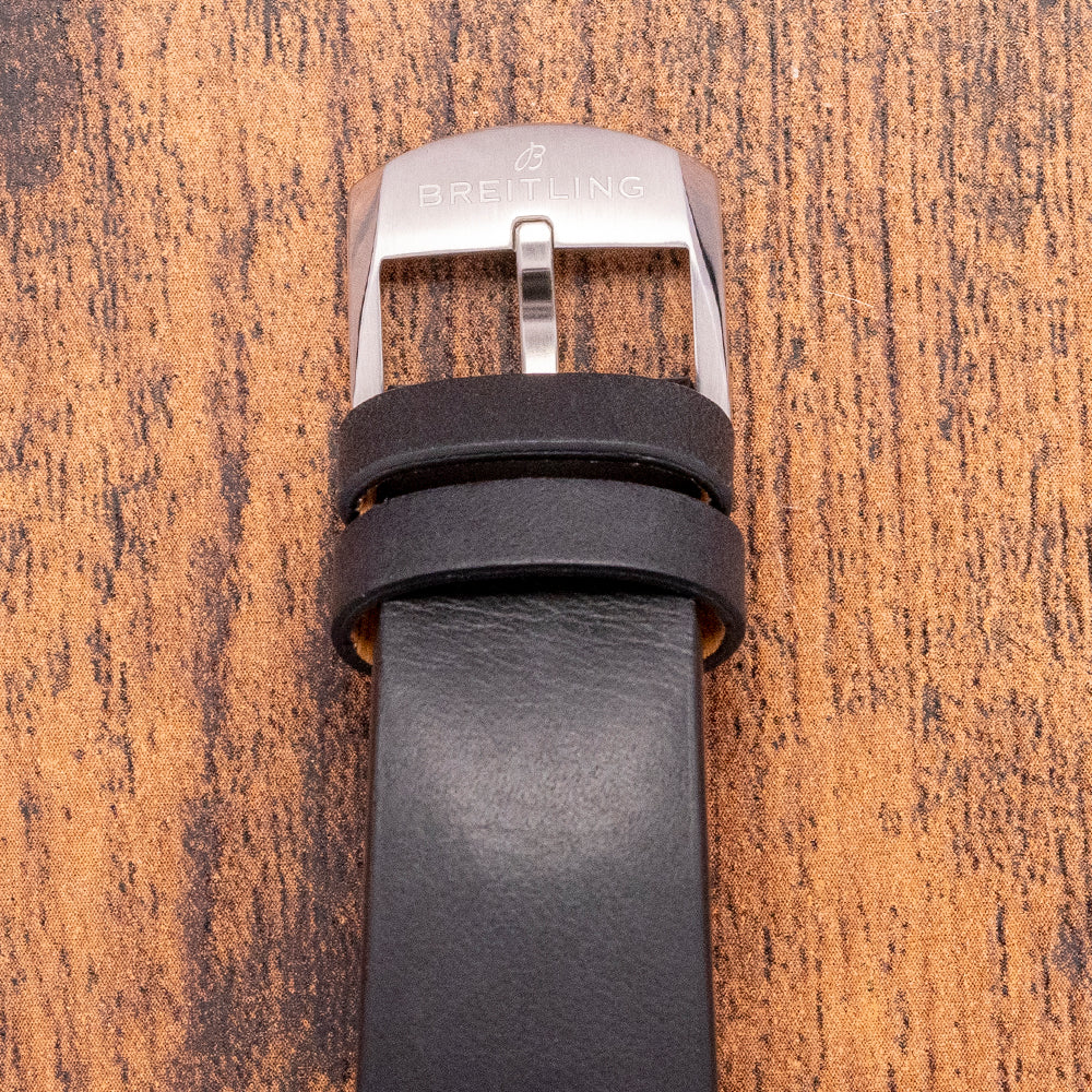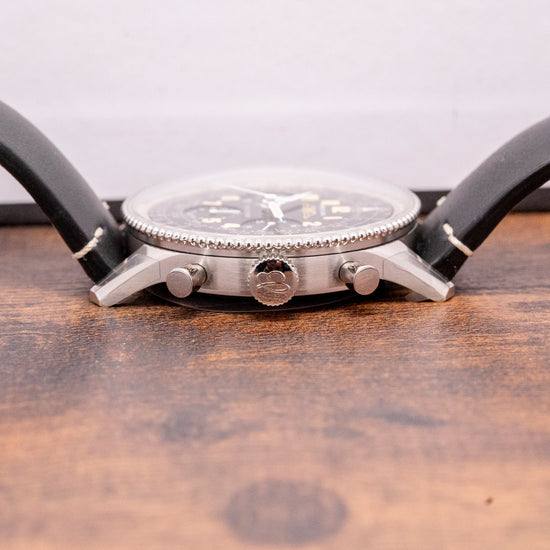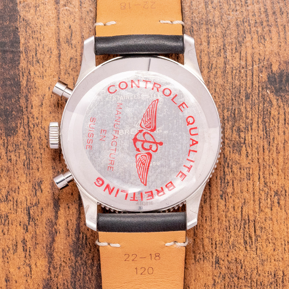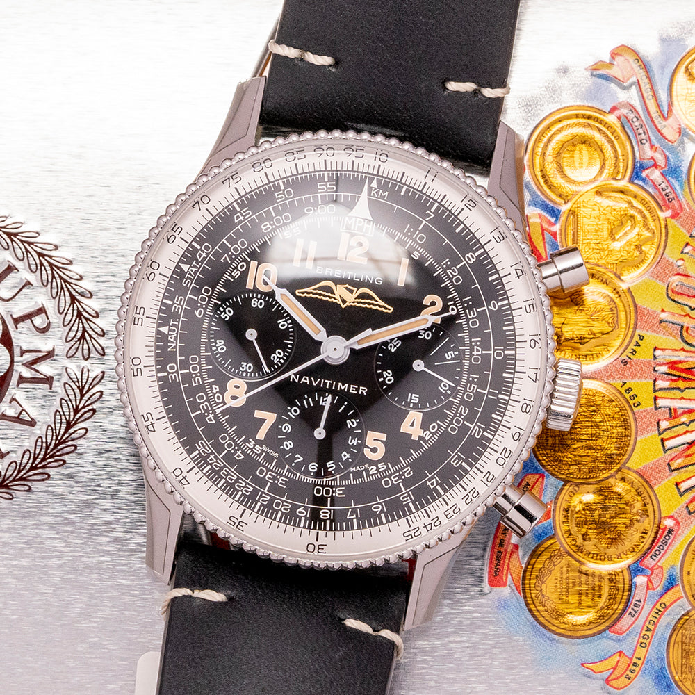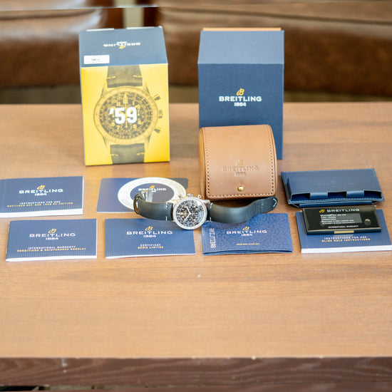 Here we have an Unworn and stickered 2019 Breitling Navitimer Ref. 806 1959 Re-Edition AB0910371B1X1 limited No.1076/1959 pieces; Breitling worked closely with watch collector Fred Mandelbaum, who has possibly the largest collection of vintage Breitling in the world. It has a 41mm polished and brushed stainless steel case, bevelled edged lugs with a lug-to-lug length of 48.5mm and a thickness of 13.5mm, ensuring a comfortable fit on your wrist; these dimensions are faithful to the original. Brushed and polished surfaces transition with crisp, defined lines. We have the chronograph piston pushers and a signed crown on the right side. The signature high-domed plexiglas crystal sits above the dynamic black dial; the dial has an outer bi-directional rotating logarithmic slide-rule navigation computer, which makes complex mathematical calculations useful to pilots; you can measure a lot of things such as gasoline consumption, miles per minute, and ground speed, rate of descent/climb, distance in descent/climb and nautical / statute mile conversion. Arabic numeral indices coated in aged Super-LumiNova mark the hours, and three recessed registers add dimension to the dial: at 3 o’clock, a 30-minute register; at 6 o’clock, a 12 hours register; and finally, at 9 o’clock, a continuous 60 seconds register. Long sword hands are coated in aged Super-LumiNova luminescence, complemented by a tapered chronograph hand. The signature applied Breitling wings sit at 12 o’clock, and the “Navitimer” text is precisely executed. On the reverse, a snap-off case back with the number No.1076/1959 is engraved into it. Inside a manually wound Breitling Cal. B09, 47 jewels, 28,800 beats per hour, column wheel chronograph movement with vertical clutch, this COSC-certified calibre is based on the iconic Breitling Caliber 01 and has been specifically developed for these historical re-editions. The watch comes fitted on its original Breitling 22mm vintage style leather strap with a signed buckle and comes with its box and paperwork.