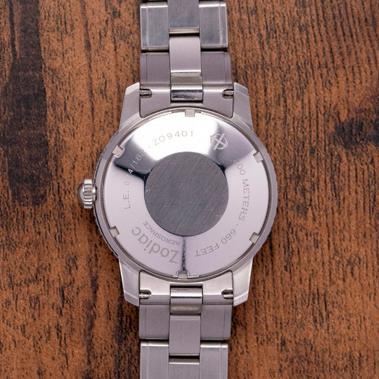 This watch is sold with its original Zodiac box and Zodiac paperwork. The watch comes paired with its original Zodiac five-link stainless steel bracelet with a signed folding butterfly clasp, all links included. The watch is from May 2021 and is in worn condition with signs of wear that can be seen, a full case and bracelet refurb can be provided at an additional cost. The watch comes with our 12-Months Warranty.