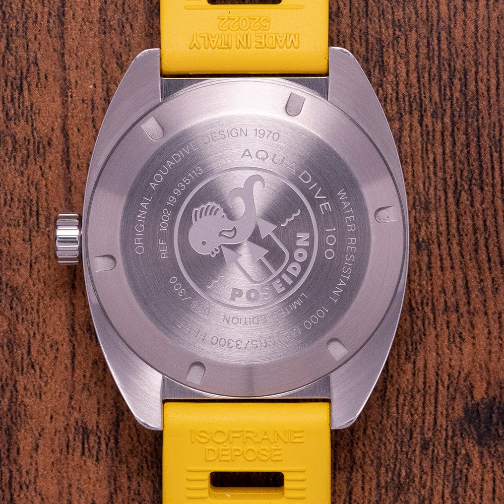 This watch is sold with its Aquadive presentation box, Poseidon patch, Aquadive papers and CD. The watch comes paired with its original yellow 22mm ISOframe rubber strap with a pin buckle, the yellow has started to fade in a few places. The watch is from February 2020 and is sold in worn condition, but overall very fair as you can see. The watch comes with our 12-Months Warranty.