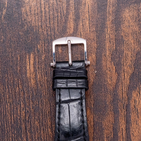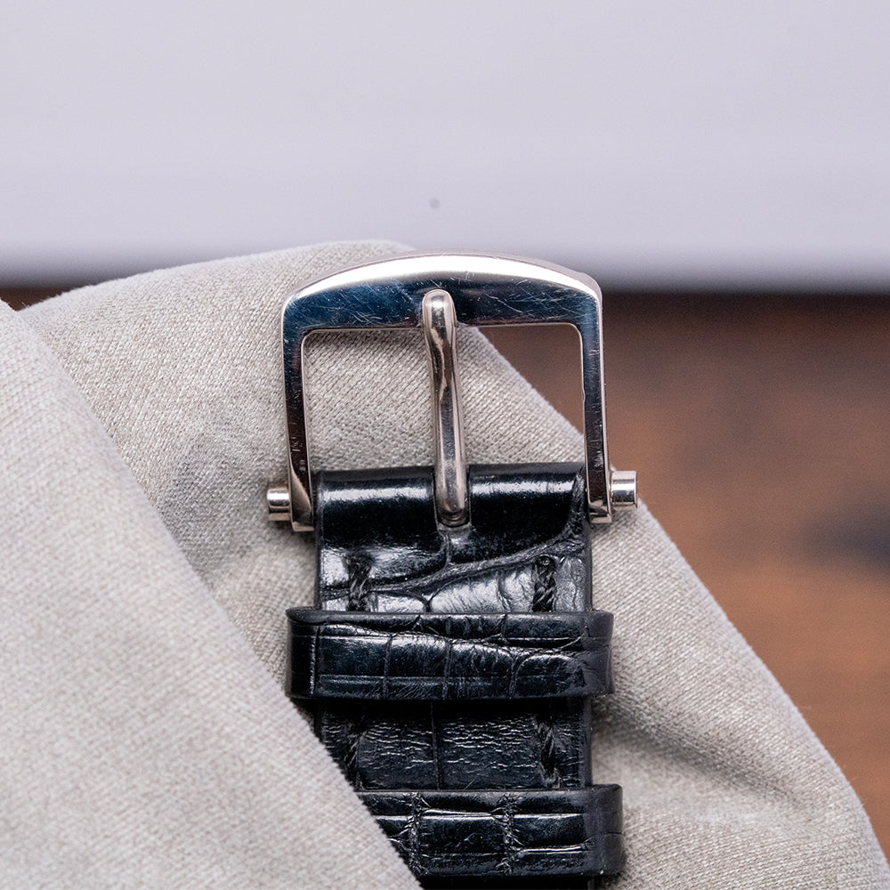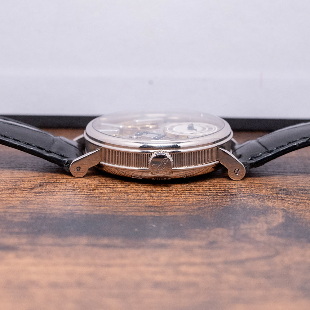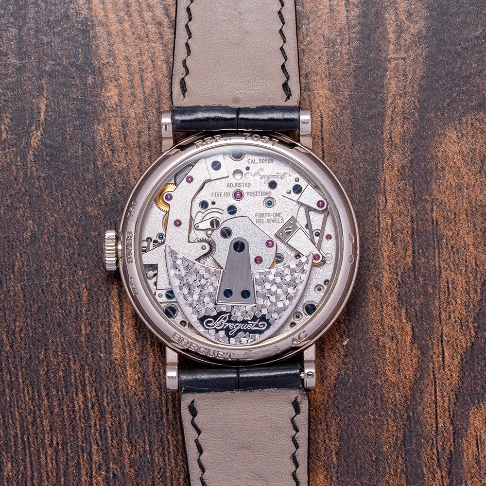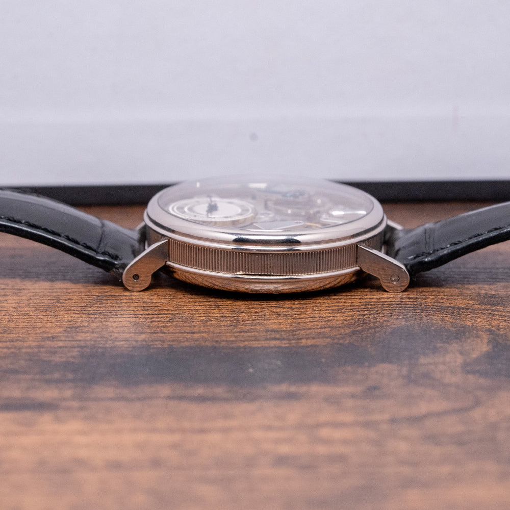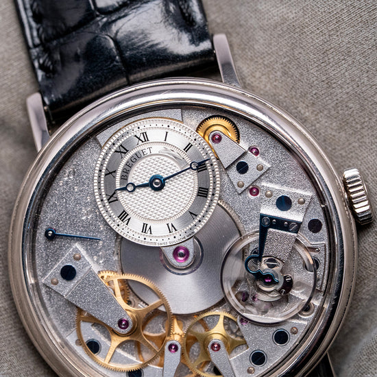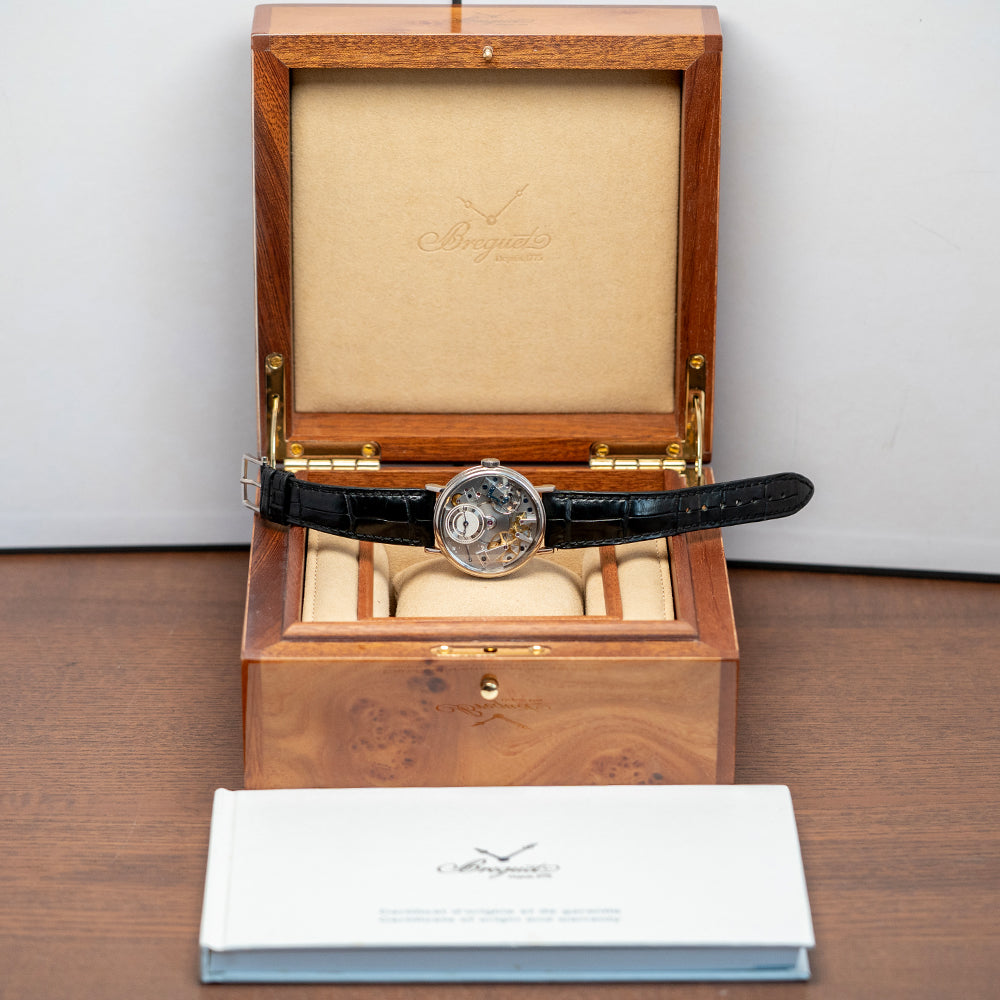 Here we have the exquisite 2020 Breguet La Tradition automatic 7037BB. Launched in 2011 as part of their Tradition collection and featuring a 38mm 18ct White Gold round case that comfortably sits on your wrist, with straight, round-ended, drilled lugs. Its curved coin-edge mid-section leads to a lug-to-lug length of 45mm and a case thickness of 12mm. On the right side, a signed coin-edged crown. A smooth bezel holds a domed sapphire crystal with double AR-coating above an incredible semi-skeletonised open-work movement, inspired by Breguet's 18th-century pocket watches. The grainy-textured mainplate secures this mesmerising movement with blued screws and 18ct Breguet gold bridges. At 12 o’clock, we have a small guilloché subdial featuring an outer minute track and Roman numerals marking the hours within three concentric, patterned rings. Elegant blued Breguet hands sit majestically in the centre; ‘Breguet ****’ completes this intricate subdial. On the left side, you find an engraved retrograde seconds. On the reverse, a sapphire exhibition case back, engraved with the details of the watch and the 18ct white gold hallmarks around its edge, inside an open-work automatic Breguet Cal. 505SR, 41 jewels, beating at 21,600 beats per hour, showcasing this intricate masterpiece made up of 240 components, featuring a repeating square ribbed-textured signed rotor and the Breguet “pare-chute” shock-protection system, which they created way back in 1790. It comes paired with its 20mm Breguet leather strap and 18ct white gold tang buckle. This watch is sold with its Breguet box and paperwork.