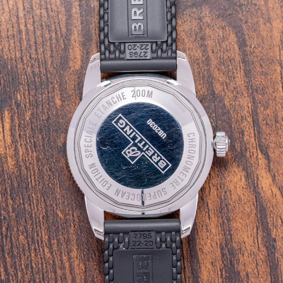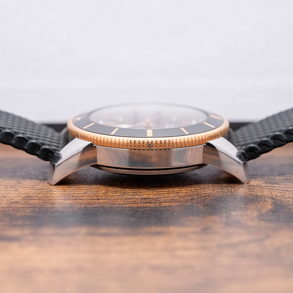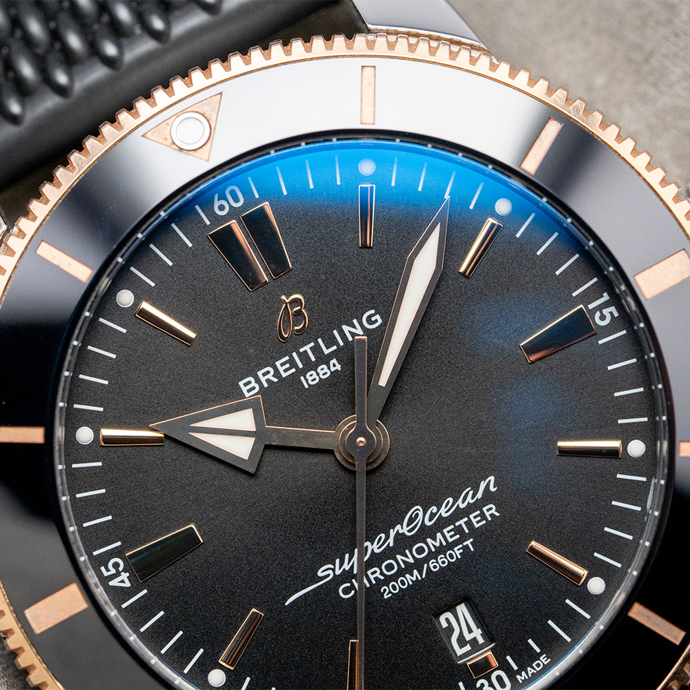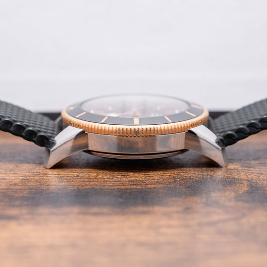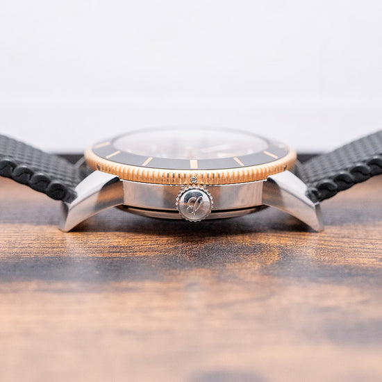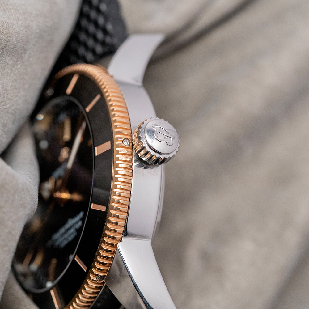 Here we have a 2020 Breitling Superocean Heritage B20 44 Steel & 18ct Rose Gold UB2030 with its curvaceous 44mm brushed and polished stainless steel case that curves over your wrist with thick, tapered, flat-ended lugs. As part of their Heritage range, this watch takes many design cues from their 1957 Superocean, which was their first 200m dive watch. The polished portions of the case have distinctive crisp lines leading to a lug-to-lug length of 54mm and a case thickness of 14mm, giving the watch an impressive wrist presence. On the right side is a stepped signed twin gasket screw-down crown with deep knurling for grip and the embossed “B”. The unidirectional bezel has a half-minute ratchet setting and a deep knurled 18ct Rose Gold edge with a black ceramic inlay with recessed Rose Gold markings holding a slightly domed sapphire crystal AR coated on both sides above a matte black dial. An outer 60-minute track with lume pips surrounding 18ct Rose Gold applied baton indexes marking the hours at 6 o’clock, a framed date window, elegant 18ct Rose Gold arrow and sword hands are filled with Super-LumiNova and complemented by an 18ct Rose Gold tapered second hand, at 12 o’clock we have the applied 18ct Rose Gold “B” Breitling motif “Officiellement Certifie” printed underneath and at 6 o’clock “Superocean Automatic 200m/660ft” completes this sophisticated sports dive watch. On the reverse, a screw-down solid case back engraved with the details of the watch around its edge and the Breitling motif in the centre, inside an automatic Breitling Cal. B20, 26 jewels, beating at 28,800 beats per hour, introduced in 2017 and based on the in-house Tudor MT5612. It comes paired with its 22mm Breitling black rubber strap secured by a signed push-button deployant clasp with dive extension and comes with its original Breitling box, swing tag, travel case and Breitling paperwork.