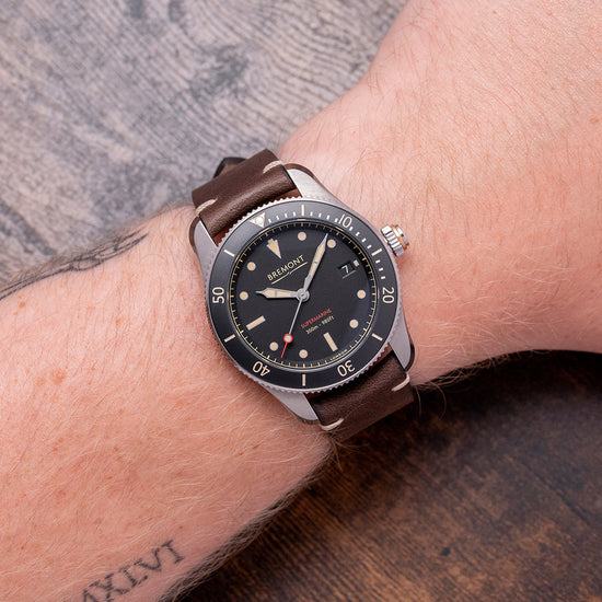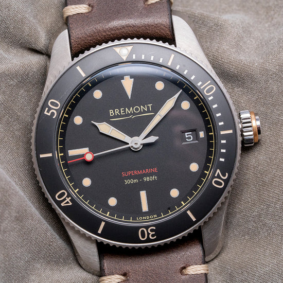 Here we have a classic 2020 Bremont Supermarine S301 BK on a strap. The Supermarine collection is designed as a tribute to the 1930s British aircraft manufacturer Supermarine, famous for producing the Spitfire. With its 40mm Bremont Trip-Tick stainless steel case curving over your wrist, thanks to the thick, tapered, polished, chamfered-edge lugs, and sitting comfortably on its proprietary shock-absorbing black DLC-treated centre case barrel. The curvaceous flanks lead to a lug-to-lug length of 49mm and a case thickness of 12mm, giving the watch an impressive wrist presence. On the right side, a deeply knurled signed crown. The unidirectional coin-edged bezel features a black ceramic 60-minute dive insert, laser-engraved and filled with Super-LumiNova, which sits above a domed sapphire crystal and a matte black dial. An outer minute track chapter ring surrounds the disc and baton indexes, coated in Super-Luminova, marking the hours. At 3 o’clock, a colour-matched date window is featured. Elegant syringe hands, filled with Super-LumiNova, are complemented by a red lollipop sweeping second hand. At noon, we have the Bremont motif, and at 6 o’clock, a red 'Supermarine’ ‘300m 980FT’ completes this aviation-themed tool watch. On the reverse, a screw-down solid stainless steel case back is engraved with the details of the watch around its edge and the image of the S6B Supermarine seaplane, which played a crucial role in the development of the infamous Spitfire. Inside an automatic Bremont Cal. BE-92AE, 21 jewels, beating at 28,800 beats per hour. A modified ETA 2892 movement. It comes paired with its original, 20mm Bremont vintage-style leather strap and signed pin buckle. This watch is sold with its original Bremont box, travel pouch, and paperwork.