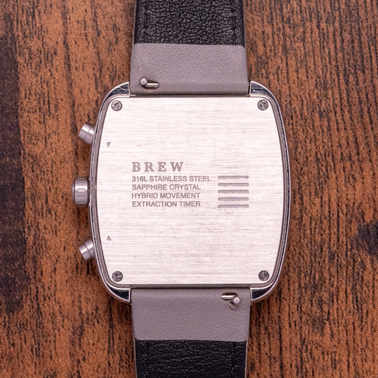 Here we have a 2020 Brew Retrograph “Teal'' Dial Chronograph with a 38mm square cushion case, during the 1930s a particular chronograph was produced which had markings at the 3-minute mark on the sub-dial and was nicknamed “Telephone Timers' due to the fact that after 3 minutes you had to put another coin in to continue the call. Brew has adapted this timing method to highlight the optimum extraction time for the perfect espresso with a time ranging from 25 to 35 seconds which is dependent on the type of machine you are using. The case sits flat to the wrist towards hooded lugs, and a lug-to-lug length of 41.5mm and a case thickness of 11mm ensure a comfortable fit, polished and brushed surfaces transition with crisp lines. The soft rounded edges remind us of the watches of the 1970s. On the right side, we have the chronograph pushers slightly recessed and a signed crown in the centre, a flat slightly raised sapphire crystal sits above a “Teal” sunburst dial. An outer 60-minute and seconds scale in white C3 SuperLumiNova dots and slim baton indexes mark the hours, and at 6 o’clock a framed date window. At 3 o’clock a 45-minute register with a “white” hand and numerals and at 9 o’clock a small seconds register with a “Teal” hand and white numerals. The long white baton hands are complemented by a “Teal” tapered chronograph hand. The blend of funky colours and recessed registers makes this contemporary bicompax chronograph stand out from the crowd, at 12 o’clock we have the Brew motif and at 6 o’clock “Retrograph”. On the reverse, a screwed-down case back with horizontal patterning and the Brew logo embossed in the centre, inside a Hybrid VK64 Meca-Quartz made by Seiko Instruments. Part of the hybrid mechanical quartz (meca quartz) movement line, it is a chronograph movement that uses quartz technology for the main operation and functions of the watch and a mechanical module for operating the chronograph, it gives you the snapback of a mechanical chronograph and the accuracy of quartz. The watch comes paired with its quick-release Brew 20mm leather strap with a signed buckle and a 20mm stainless steel “beads of rice” bracelet with brushed and polished edges and a hidden deployment, and the watch comes with its Brew presentation box and papers.