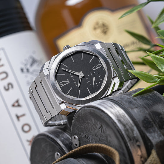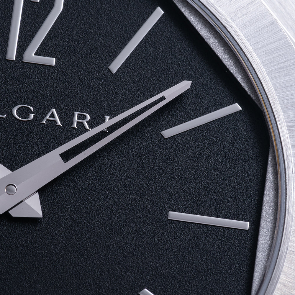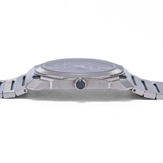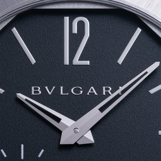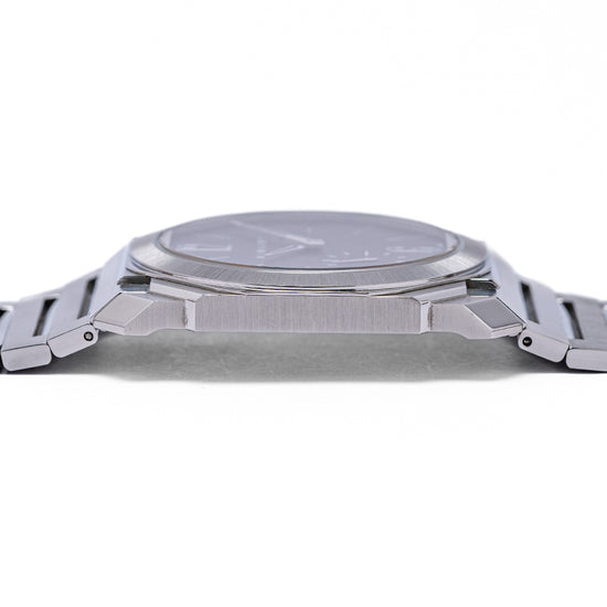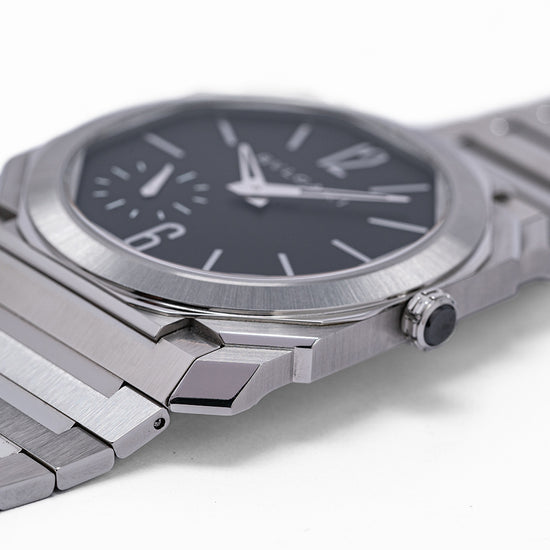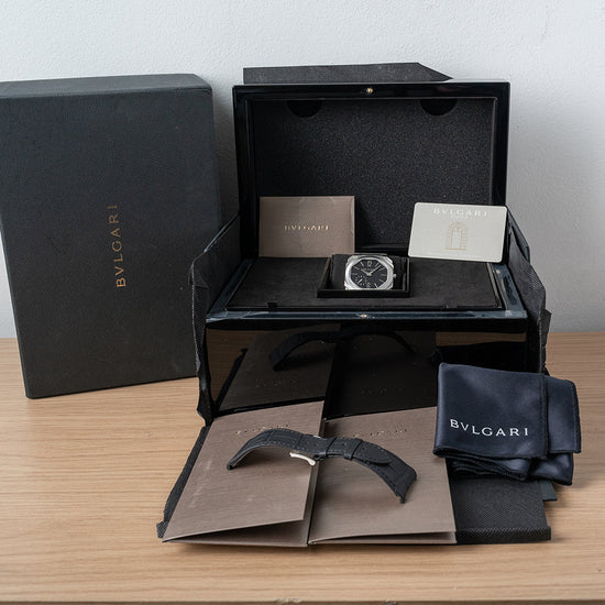 Here we have a 2020 Bulgari Octo Finissimo Automatic Black 103297 with a satin-polished 40mm stainless steel octagonal case that has a slim profile and faceted accents leading to angular lugs, a lug-to-lug length of 46mm and a case thickness of just 6.5mm ensures a comfortable fit on your wrist. A perfect blend of Italian design and Swiss horology combining the worlds of the jeweller and the watchmaker, the watch and movement was first introduced to BaselWorld in 2017. On the right side, an octagonal crown with a black ceramic insert and a smooth bezel hold a flat sapphire crystal above a black matte textured dial, the octagonal theme continues with the inner chapter ring, applied steel 12, 6 and baton indexes in between mark the hours, at the lower left we have a sub-seconds with skeletonised Dauphine's hour and minute hand completing this distinctive slim dress watch, at 12 o’clock we have the Bulgari motif, as you rotate your wrist the hands and indexes play with the light. On the reverse a screwed-down exhibition case with hexagon screws, inside an incredibly thin automatic Bulgari Cal. BVL 138, 36 jewels, beating at 21,600 beats per hour, in the top right we have a Platinum micro-rotor, and the 2.23mm movement is decorated in beautiful Cotes de Geneve and perlage. The watch comes fitted on an integrated satin-polished 29.5mm stainless steel bracelet and a signed hidden push-button released deployment clasp, in the Bulgari presentation box, we have a Bulgari leather strap and paperwork.