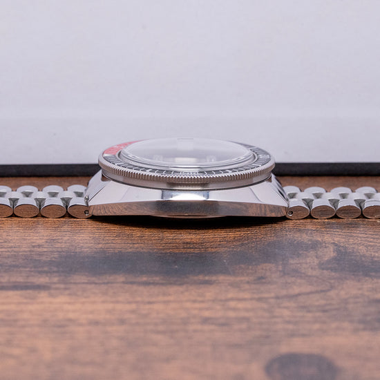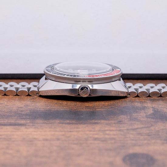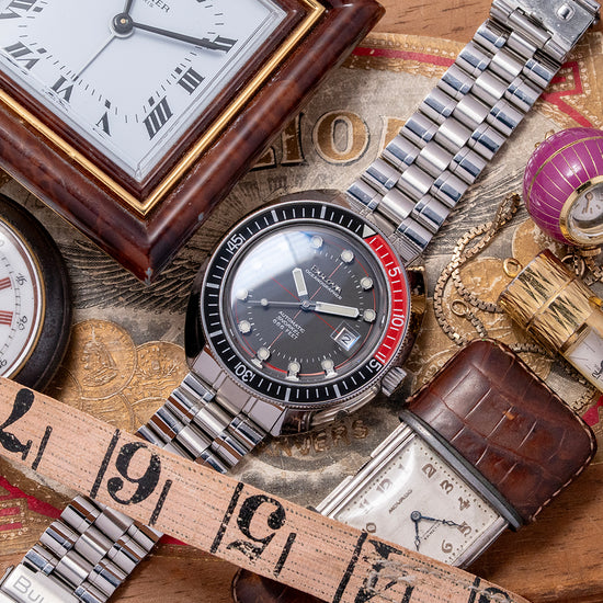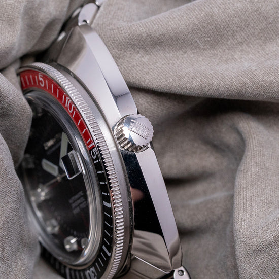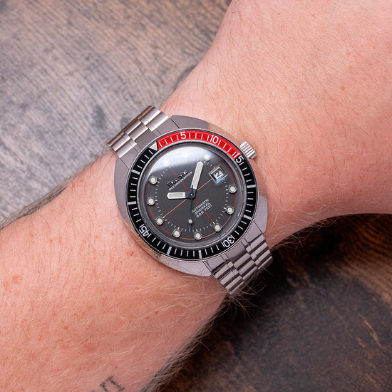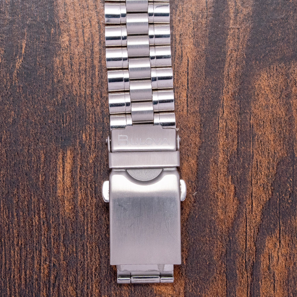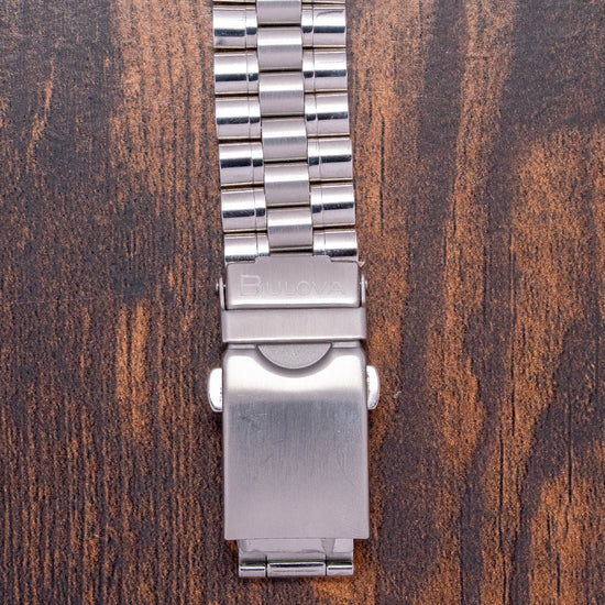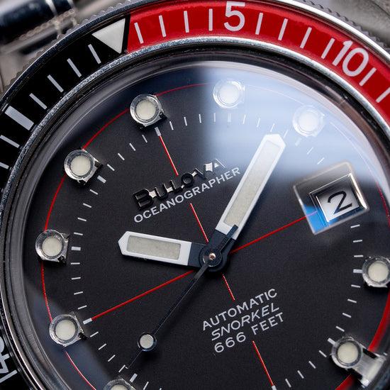 Here we have the 2020 Bulova Oceanographer Reissue Snorkel 666ft 98B320, inspired by their 1970s Oceanographer. Featuring a polished 44mm stainless steel C-shaped cushion case curving over your wrist with flat-ended lugs. Its curved, polished flanks lead to a lug-to-lug length of 46mm and a case thickness of 14.5mm, giving the watch an impressive wrist presence. On the right side, a deeply knurled signed crown sits recessed into the case for protection. A unidirectional coin-edged polished 120-click bezel features a black 60-minute dive insert with the first 15 minutes in red. The box-shaped sapphire crystal AR-coated sits above a black and red crosshair dial, featuring round acrylic tubes, mounted on a metal base filled with luminescent material that marks the hours, and an inner minute track. At 3 o’clock, a framed date window with a square Cyclops magnification, thick white baton hands filled with luminescent material, are complemented by a white lollipop counterweighted second hand. At noon, we have the applied ‘Bulova’ motif just like the original and ‘Oceanographer’, and at 6 o’clock, 'Automatic Snorkel 666 Feet’, giving the nickname ‘Devil Diver’ completes this vintage-inspired sports dive watch. On the reverse, a polished screw-down solid case back features the watch's details, encasing an automatic Miyota Cal. 821D, 21 jewels, beating at 21,600 beats per hour, this movement has hand winding, hacking seconds and quick-set date for your convenience. It comes paired with its 20mm polished and brushed stainless steel bracelet secured by a signed flip-lock folding clasp, all links are provided. This watch is sold with its original Bulova presentation box and paperwork.