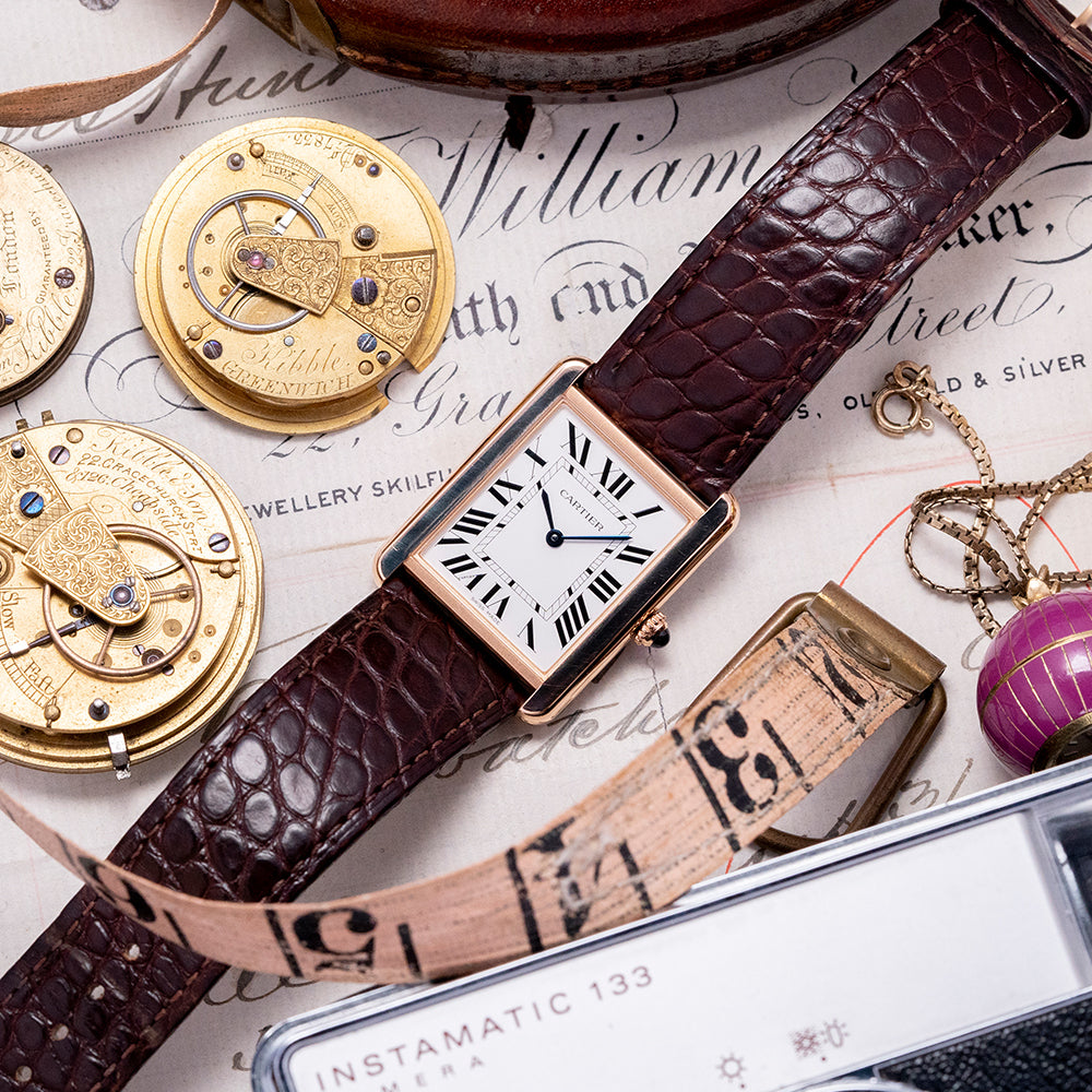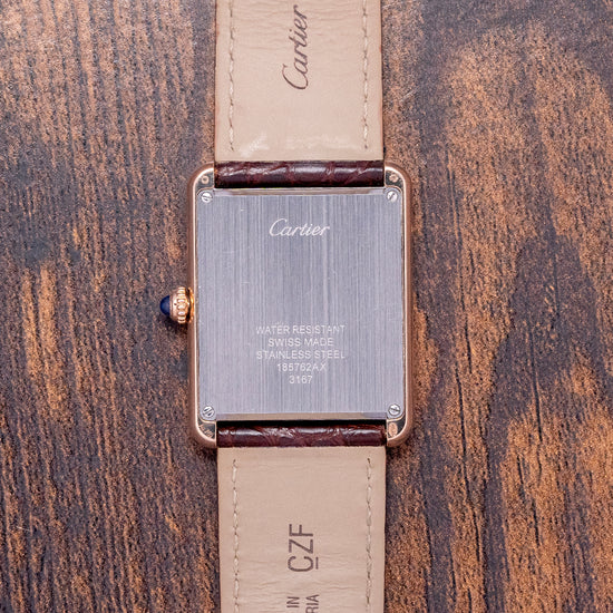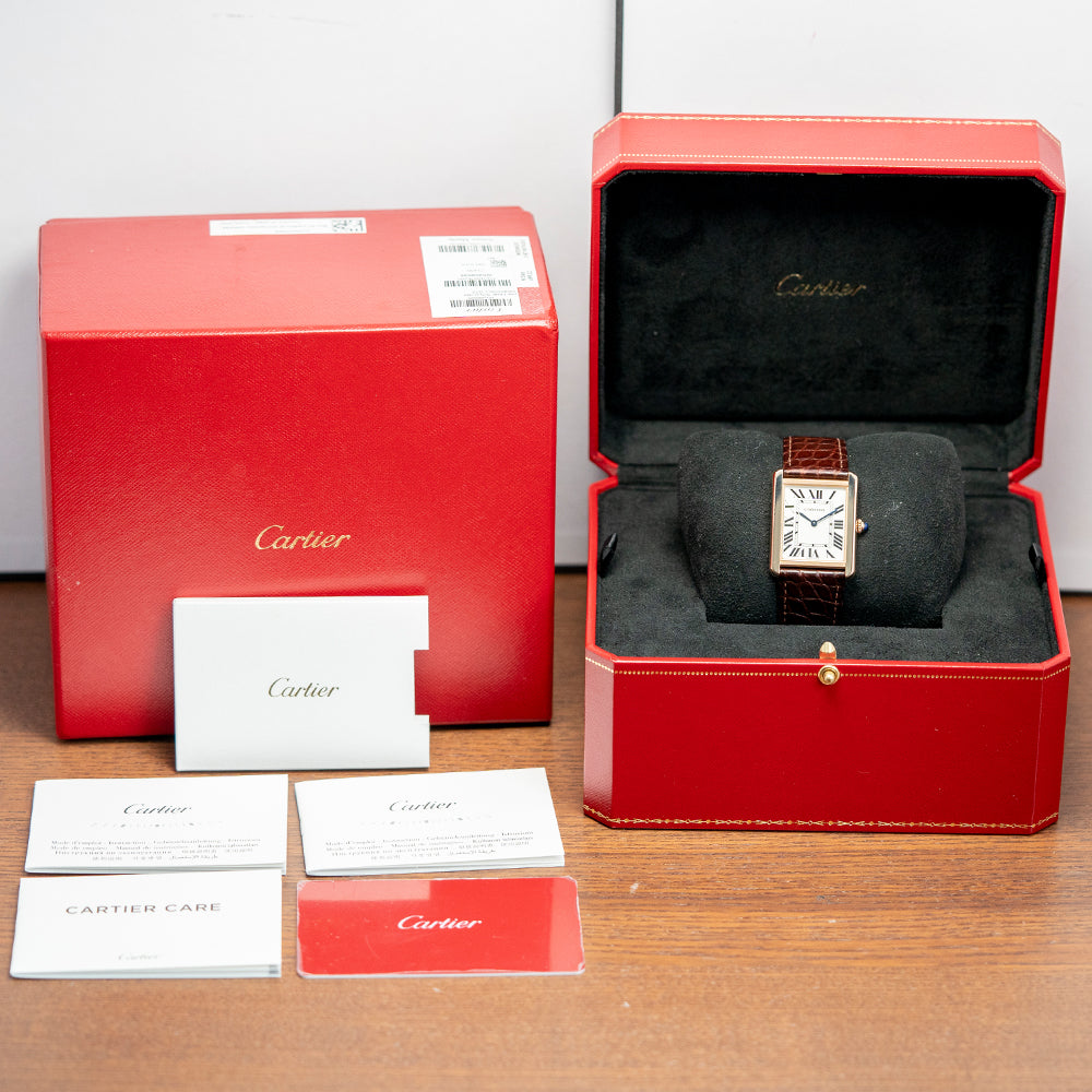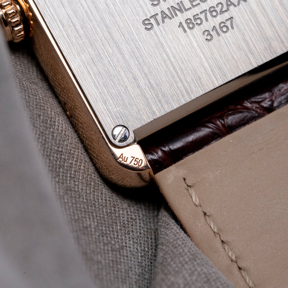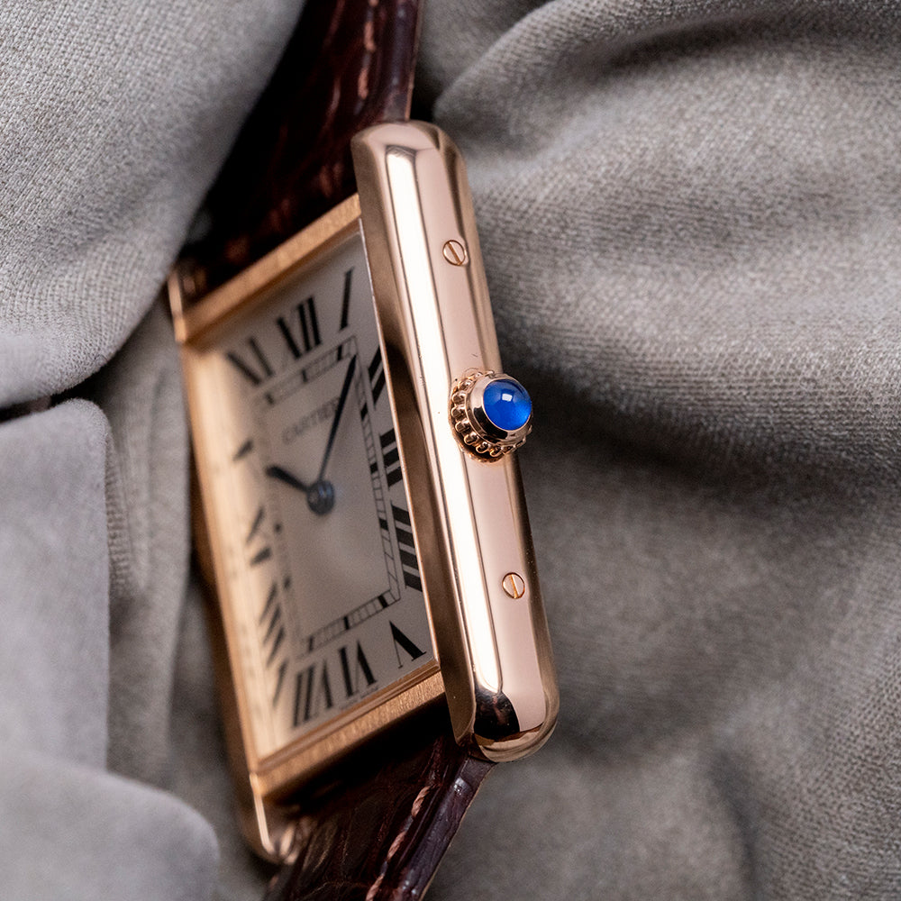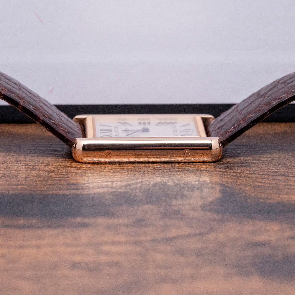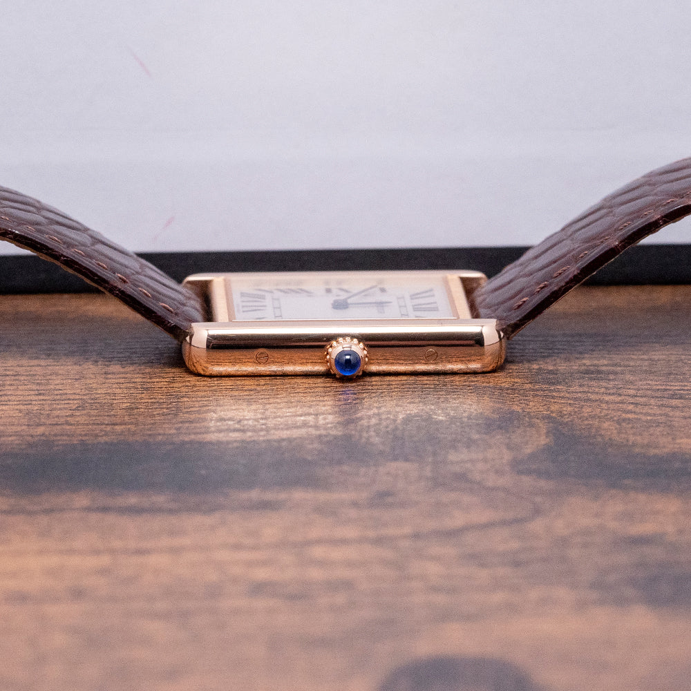 This 2020 Cartier Tank Solo Large Quartz 3167 27x34mm has an understated elegance in its 27mm 18ct Rose Gold Au750 “Tank” case. Its slim profile ends with soft, rounded corners, Swiss hallmarked. Its straight flanks have screw detailing and a lug-to-lug length of 34mm, and a case thickness of just 5mm leads to a comfortable fit on the wrist. On the right side is a crown with a blue cabochon stone inset. A flat sapphire crystal sits above a white dial. Large Roman numerals for the hours radiate around an inner minute track. Elegant heat-blued sword hands complete the sophisticated dial. On the reverse, we have a screwed-down stainless steel case back engraved with the details of the watch, inside a quality Quartz movement. It comes paired on the original 21mm Cartier leather strap with its original Cartier signed 18ct rose gold pin buckle. The watch also comes with its Cartier presentation box and papers.