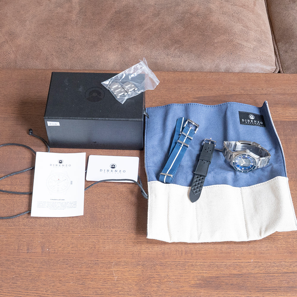This watch is sold with its original Direnzo signed case and guarantee. The watch comes paired with its 20mm satin-brushed stainless steel bracelet and flip-lock folded clasp, all links are provided, plus additional straps. The watch is from October 2020 and is in very good condition, as seen in the photographs. The watch comes with our 12-Months Warranty.