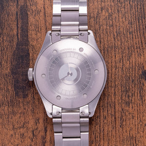 Here we have a 2020 Direnzo DRZ 03 Eclipse Blue No Date Automatic limited to 750 pieces with a satin-brushed and polished 316L stainless steel case that has a polished chamfered edge that flows along the side towards the elegant tapered lugs, and a lug-to-lug length of 47.5mm and a case thickness of 12mm give the watch an impressive wrist presence. On the right side is a prominent crown with deep knurling for extra grip, the rotating bezel has a blue insert with white markings and an inverted triangle at 12 o’clock holding a double-domed sapphire crystal AR coated above a blue sector-style dial with a gradation of dark to light towards the centre. An outer minute chapter ring has a rounded baton and disc indexes marking the hours, the dark blue centre has the Broad Arrow hands infilled with lume and at 6 o’clock a round date window. At 12 o’clock we have the Direnzo motif and at 6 o’clock “Automatic 20 ATM” completes this distinctive dive watch. On the reverse a screw-down case back, the Direnzo motif is engraved in the centre of an engraved segmented ring with the watch details around the edge, inside an automatic Sellita SW-200-1 Elaboré, 26 jewels, beating at 28,800 beats per hour, this workhorse movement has hand winding and hacking seconds for your convenience. The watch comes paired on a 20mm satin-brushed stainless steel bracelet with a flip lock signed folded clasp, all links provided, plus an additional two 20mm straps in the box, and the watch comes with its Direnzo presentation box and paperwork.