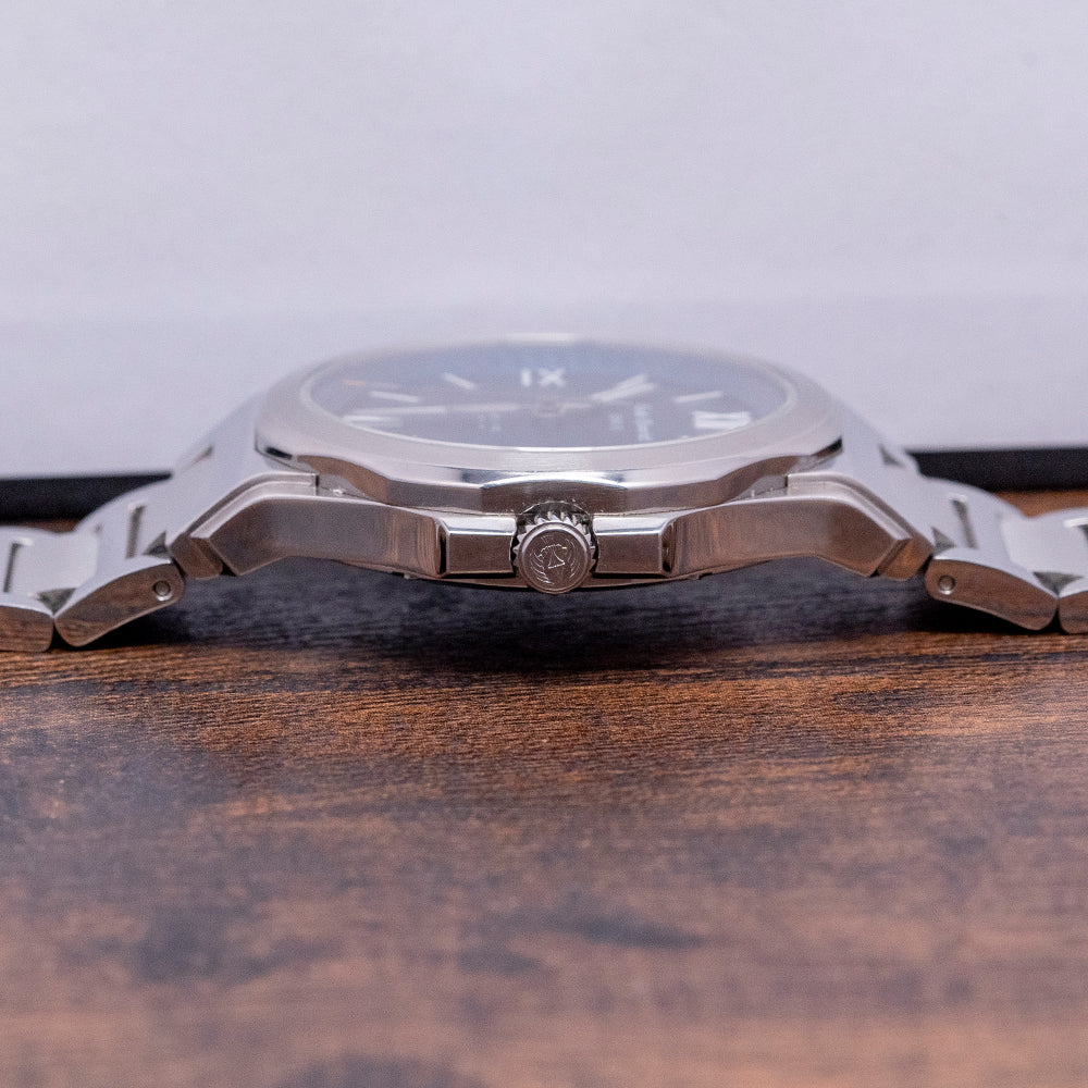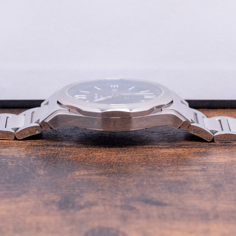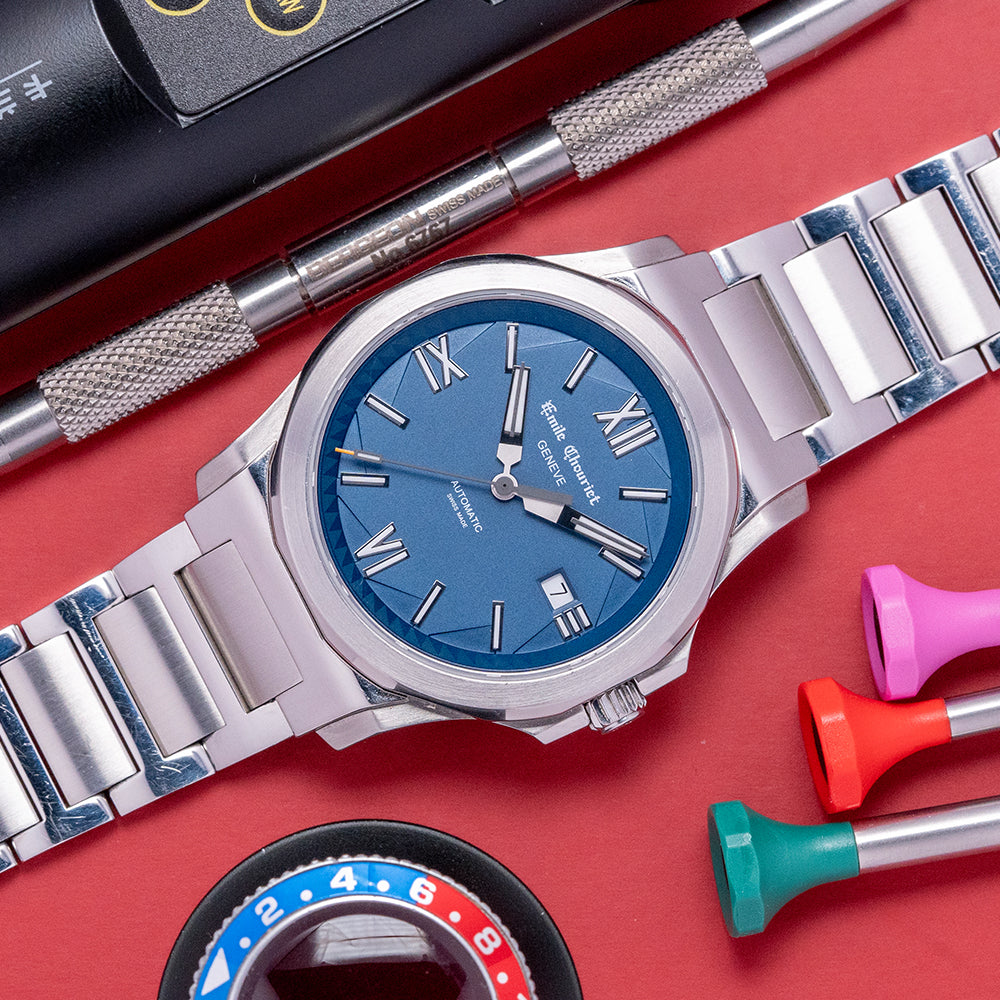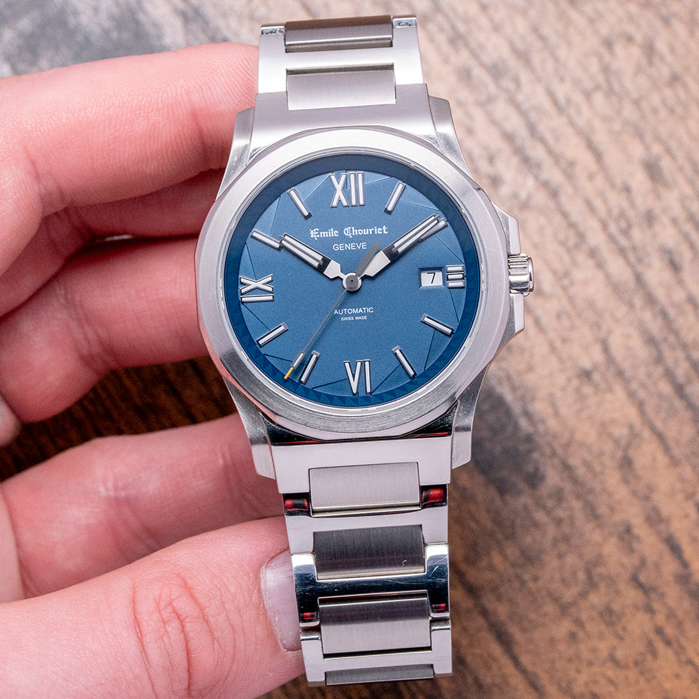 Here we have a 2020 Emile Chouriet Ice Cliff Blue Automatic with a 40mm polished and brushed stepped case that flows over your wrist thanks to the curved profile; its industrial design is both unique and functional, and the pronounced smooth platform at either end leads the eye towards the flat-ended lugs, plus a lug-to-lug length of 51mm and a case thickness of 10mm ensures a comfortable fit on your wrist. On the right side is a signed crown protected by crown guards that are part of the case for a seamless profile. The scalloped polished and brushed bezel holds a flat sapphire crystal above a stunning graduated blue dial with a jagged patterned edge reminiscent of ice cracking. An outer chapter ring has an interesting pattern that reflects the ice cliff surrounding applied Roman and baton indexes filled with Super LumiNova marking the hours; at 3 o’clock, a date window, stylised hands filled with SuperLumiNova are complemented by a tapered second hand, and at 12 o’clock we have the Emile Chouriet motif and at 6 o’clock “Automatic” completing this distinctive sports watch. On the reverse, a sapphire exhibition case back, inside an automatic ETA Cal. 2824-2, 25 jewels, beating at 28,800 beats per hour, this movement has bidirectional winding. The watch comes paired with a 22mm polished and brushed H-link stainless steel bracelet with a concealed clasp, plus a 22mm blue fabric strap with a signed buckle, and this watch is sold with its original Emile Chouriet presentation box, swing tag and Emile Chouriet paperwork.