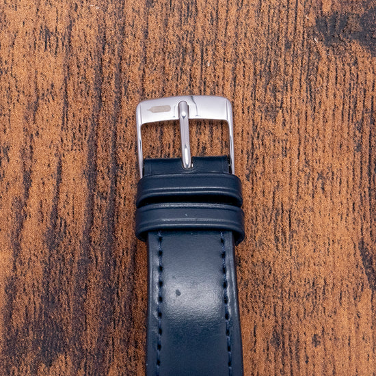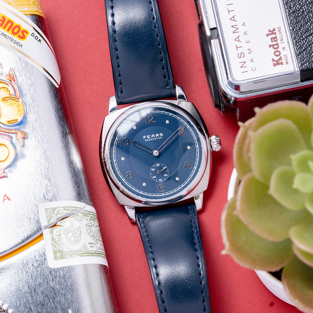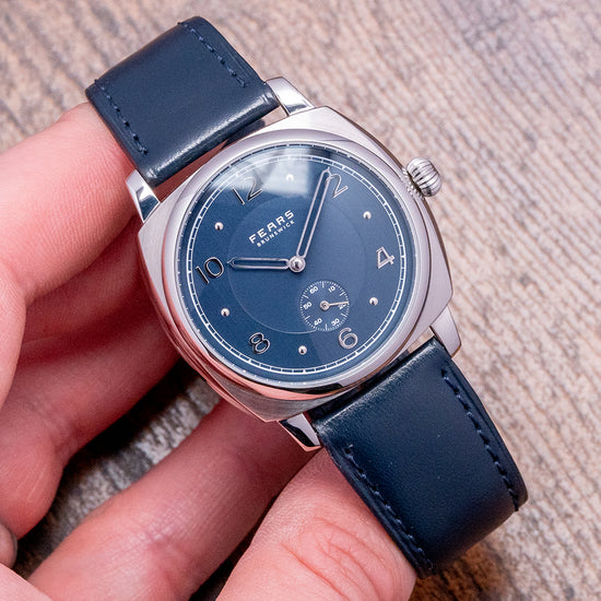 A lug-to-lug length of 43mm and a case thickness of 11.5mm ensures a comfortable fit on your wrist. To facilitate daily winding, the watch features a traditional “onion” shaped crown, which is made in Switzerland. On the dial, numerals expertly applied by hand, capture and play with the light as you gently wind the crown to begin your day. A domed sapphire crystal sits above an incredible Fears Blue dial. The blue, at first glance, appears two-tone but it's when you tilt the watch that you capture its true beauty of tri-tone. Made in Germany by one of the world's finest dial makers, they use 56 production processes to achieve this spectacular dial. It is made up of 3 layers and two surface finishes combined with a galvanic blue coating. The ring of the dial on which the numerals sit is hand-brushed meaning the surface is unique to each watch. It is truly a masterclass in dial manufacturing. Hand-applied numerals and pips marking the hours are machined from brass and polished to a mirror finish. They then receive a Rhodium coating to give a brilliant shine. This same Rhodium coating is given to the elegant skeletal “Fears” Hands, which are all finished by their expert in-house watchmakers in the UK, creating depth and finishing that has rarely been seen on mass-produced, stamped hands. Watch hand production and construction is a practice performed by only a handful of British watch brands. Inside, we have a hand-wound ETA 7001, 17 jewels, 18,000 beats per hour. First introduced in the 1970s, it quickly gained a reputation for being reliable. Its slim design incorporates an Incabloc shock system. Each movement is serviced and hand-finished here in Britain, applying Côtes de Genève striping and Rhodium plating. Once re-assembled and thoroughly tested, it receives its “Golden Pipette”, which is handmade and applied to the bridge—fitted on a 20 mm handmade Fears Blue Bristol leather strap. Its calf leather is vegetable-tanned in one of Britain's oldest tanneries in Bristol- Thomas Ware & Sons. The accompanying stainless steel pin buckle carries the final flourish of an engraving of the Fears pipette logo.